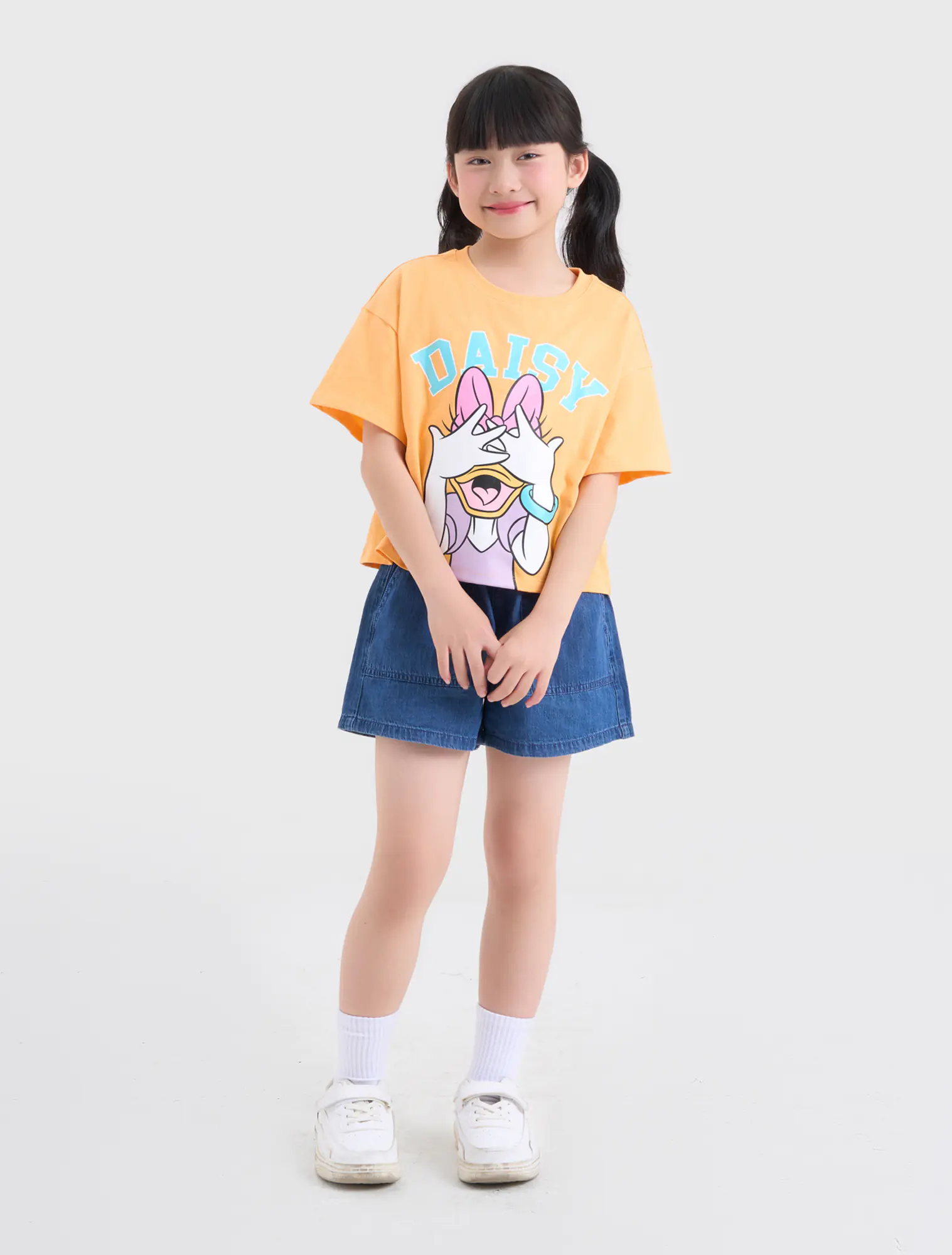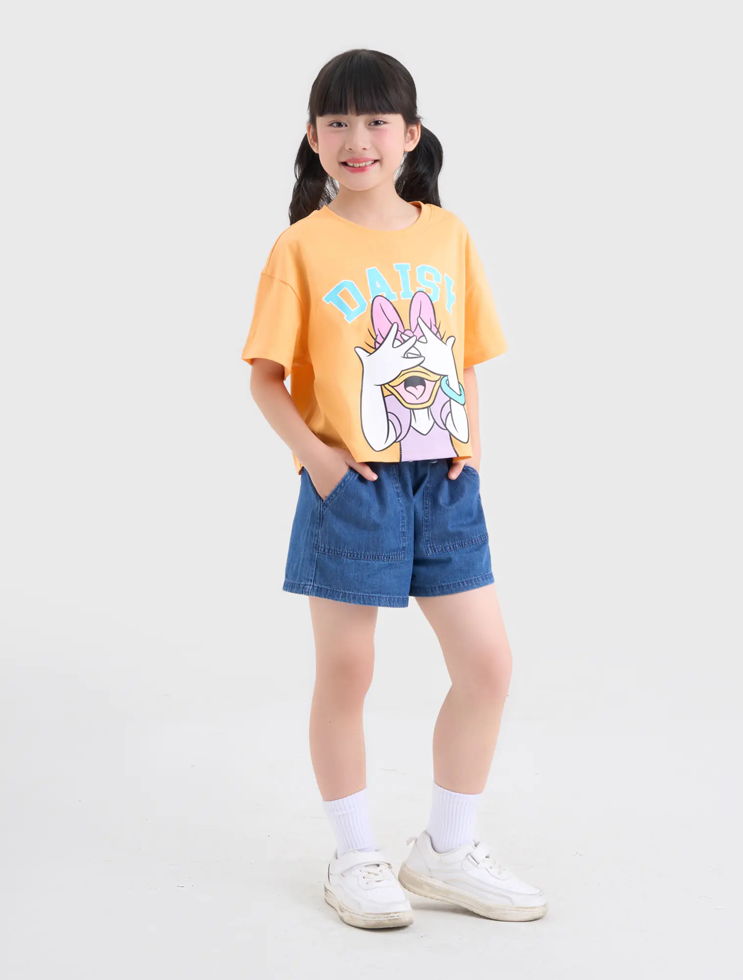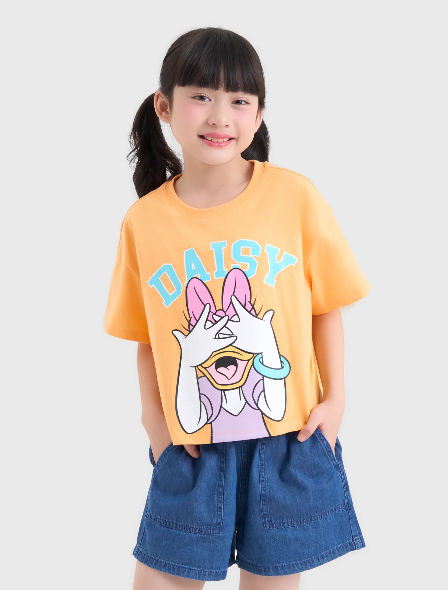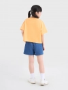 Áo phông dáng croptop, vai sệ, hình in hoạt hình dễ thương, màu sắc tươi sáng, ngọt ngào.
