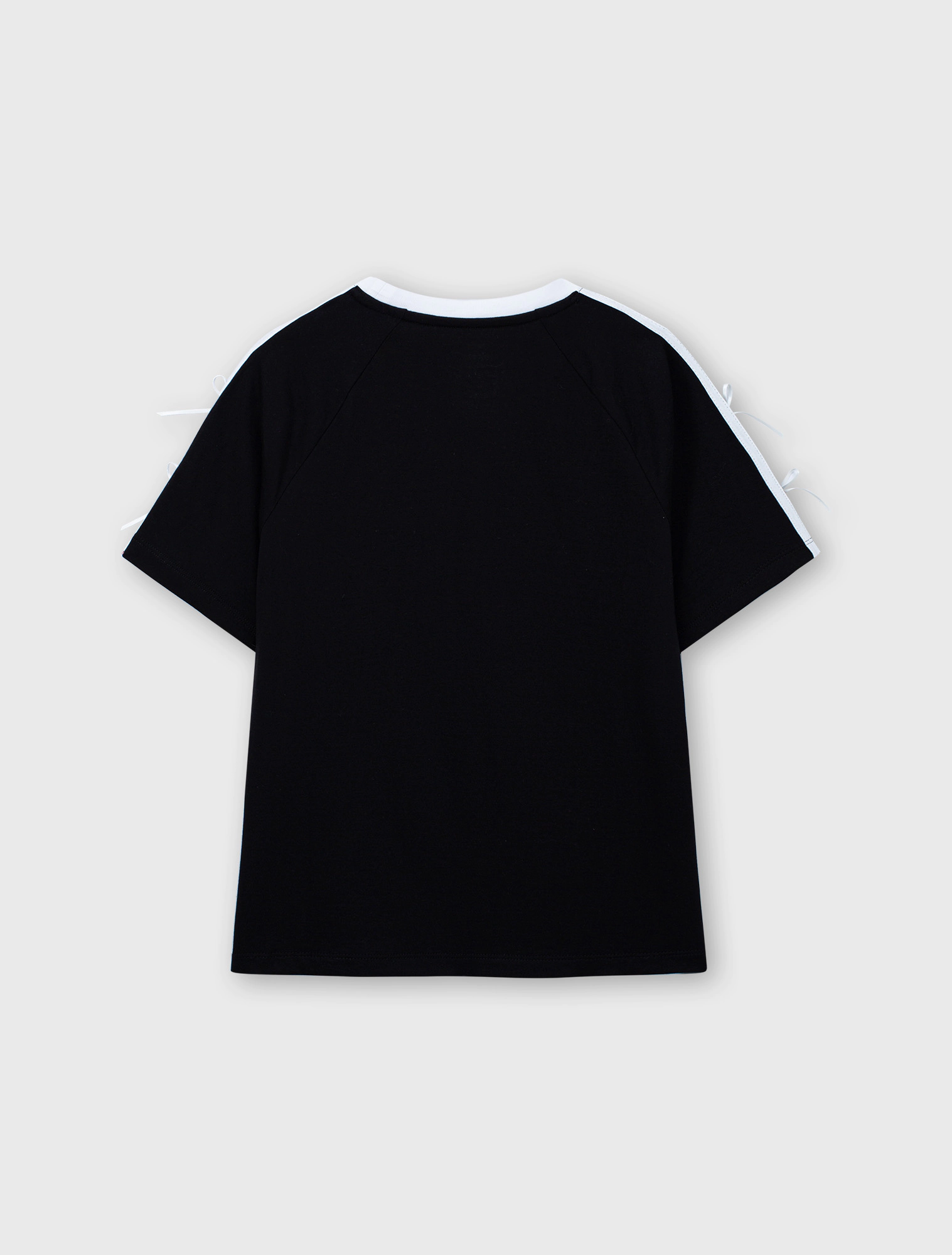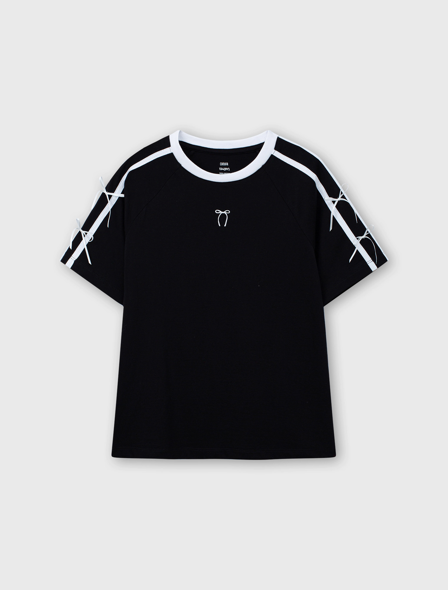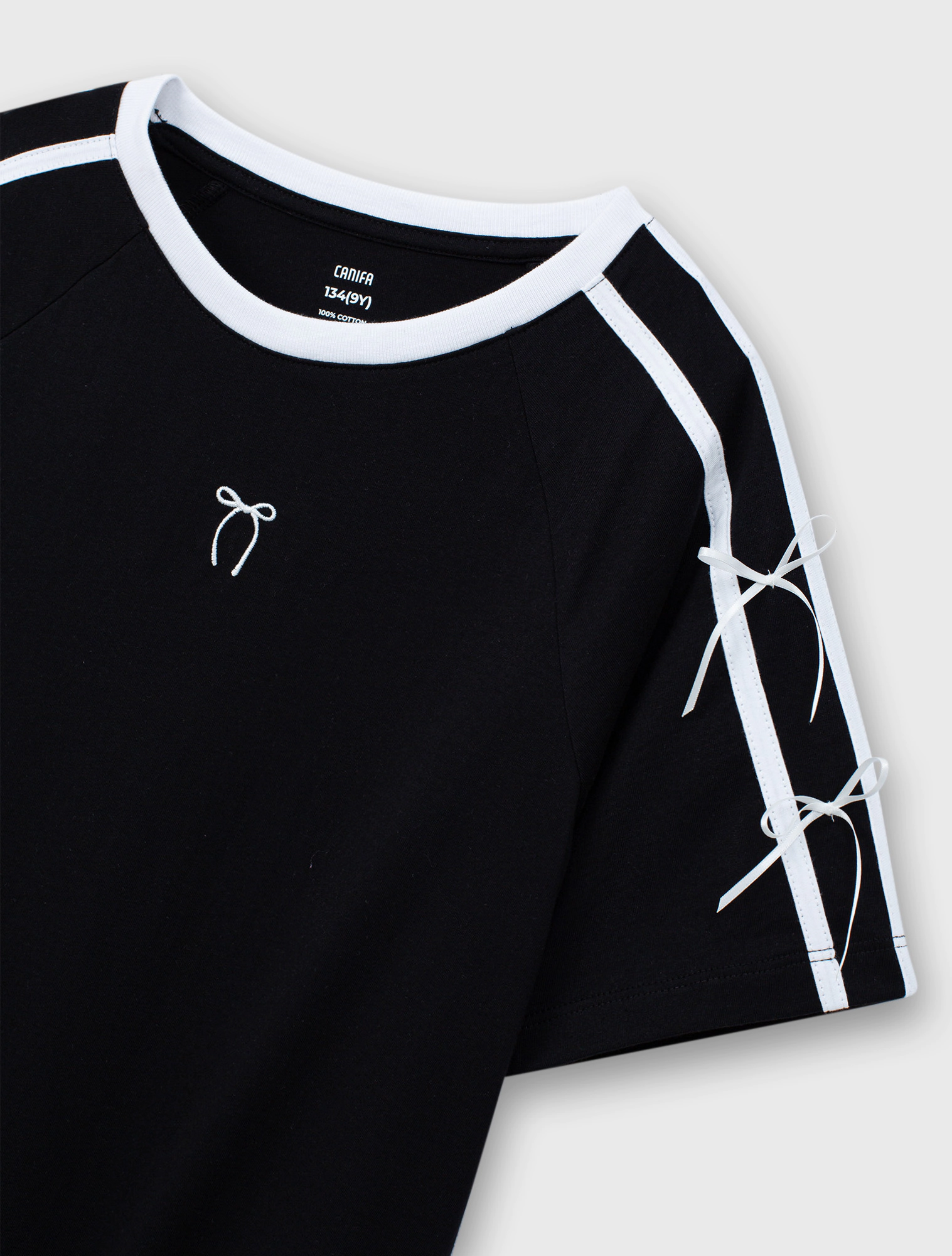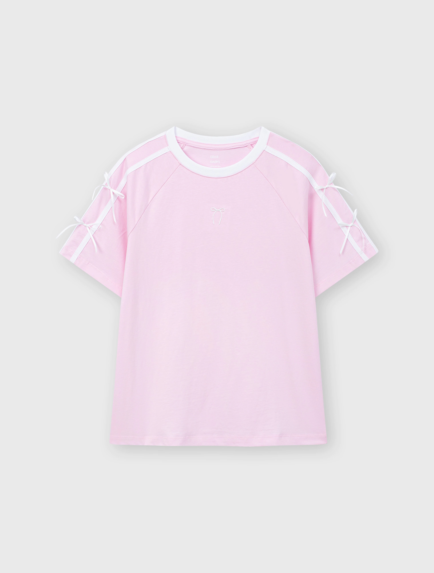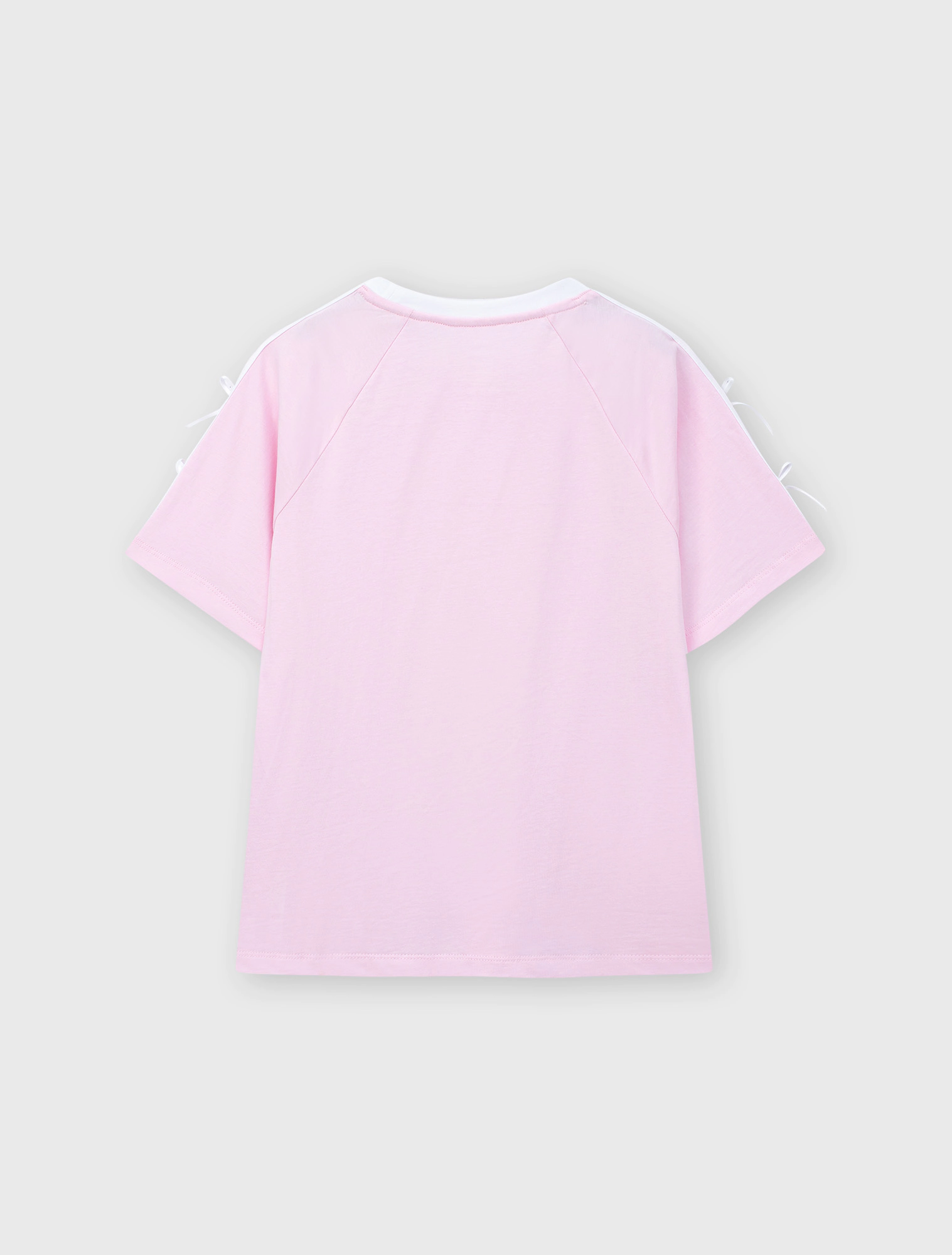 Áo phông ngắn tay bé gái. Dáng áo relax hiện đại. Cổ tròn phối màu bo rib, sống tay đè dây dệt và đính nơ cùng màu cổ áo. HÌnh thêu nơ nhỏ đáng yêu., màu sắc phù hợp bé gái. Chất liệu 100% Cotton mềm mại, thoáng mát.