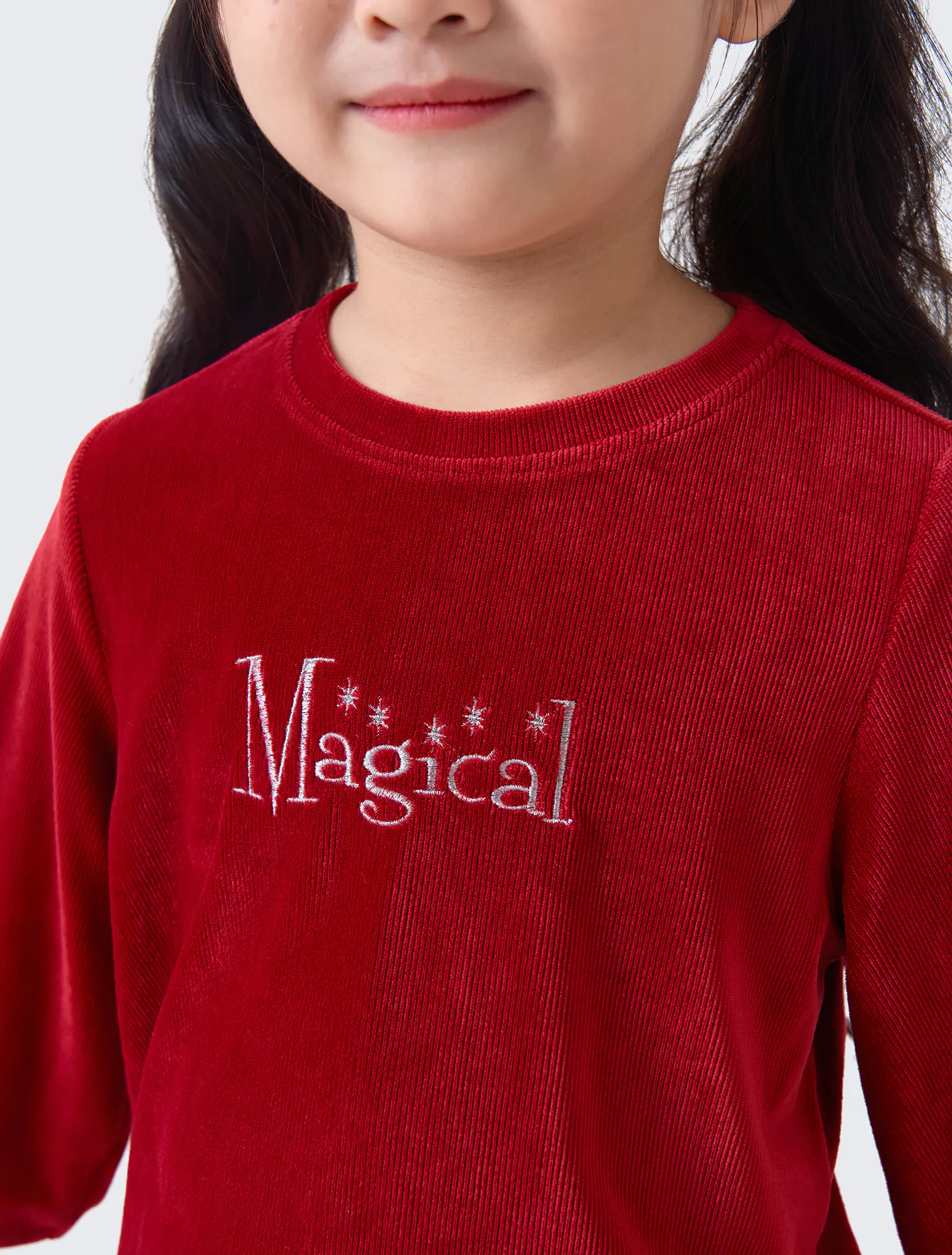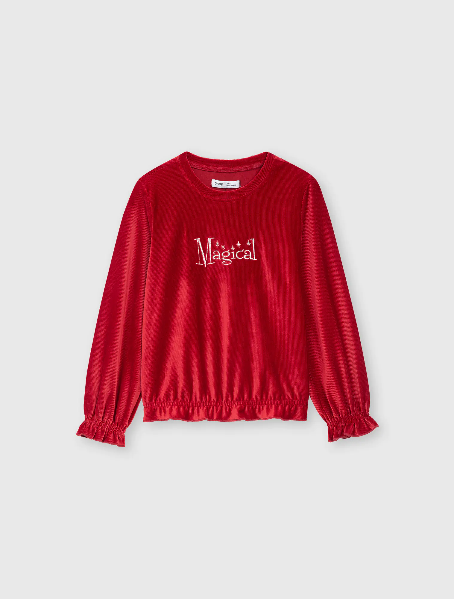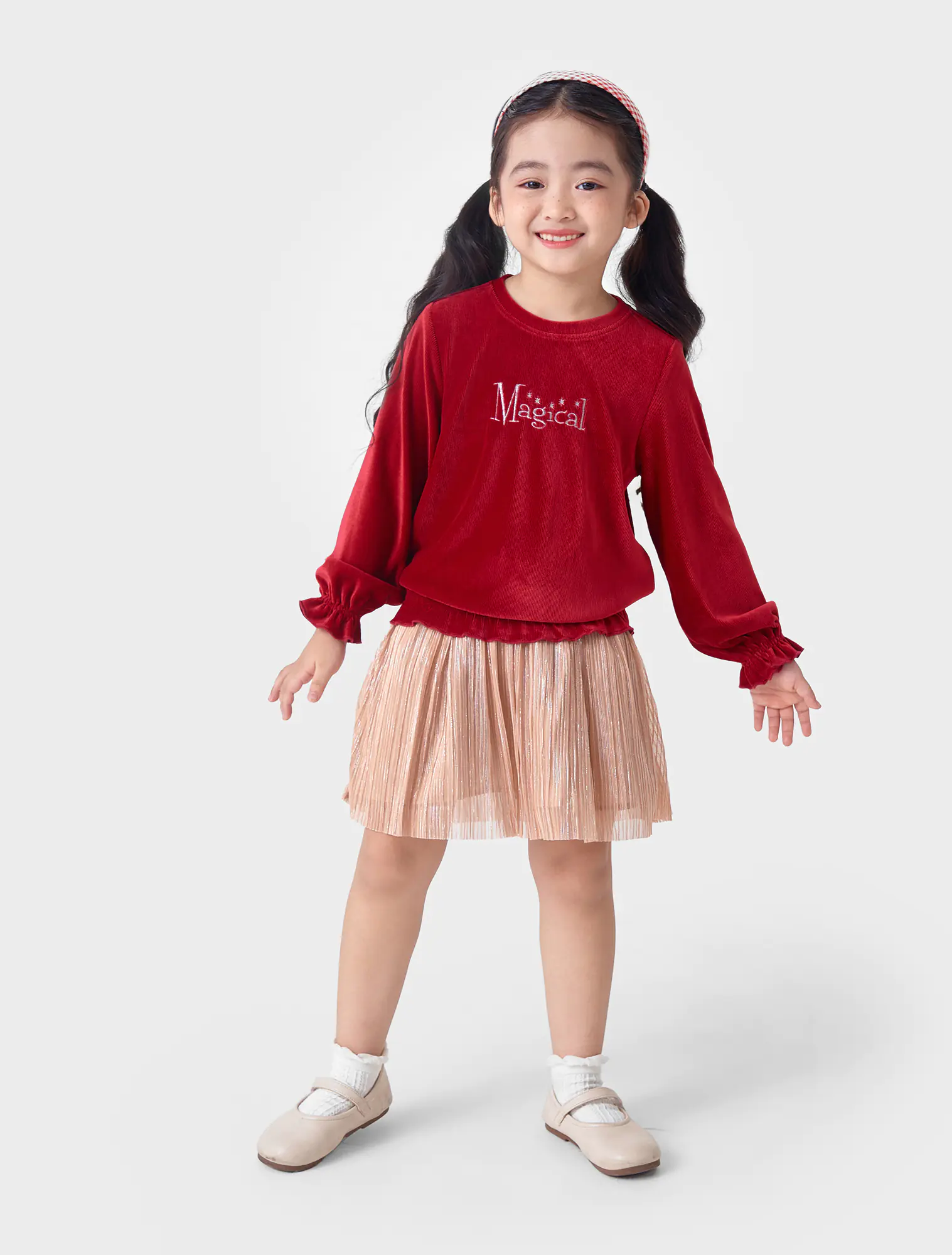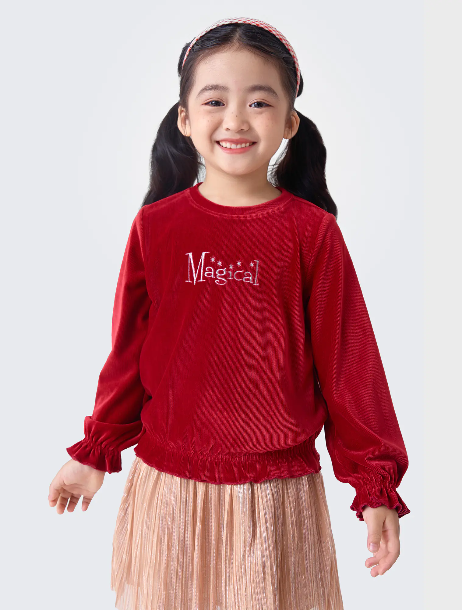 Áo kiểu dài tay bé gái. Chất liệu nhung, có bèo ở cửa tay và tạo sự nữ tính, phù hợp phối với nhiều loại trang phục cho bé gái.