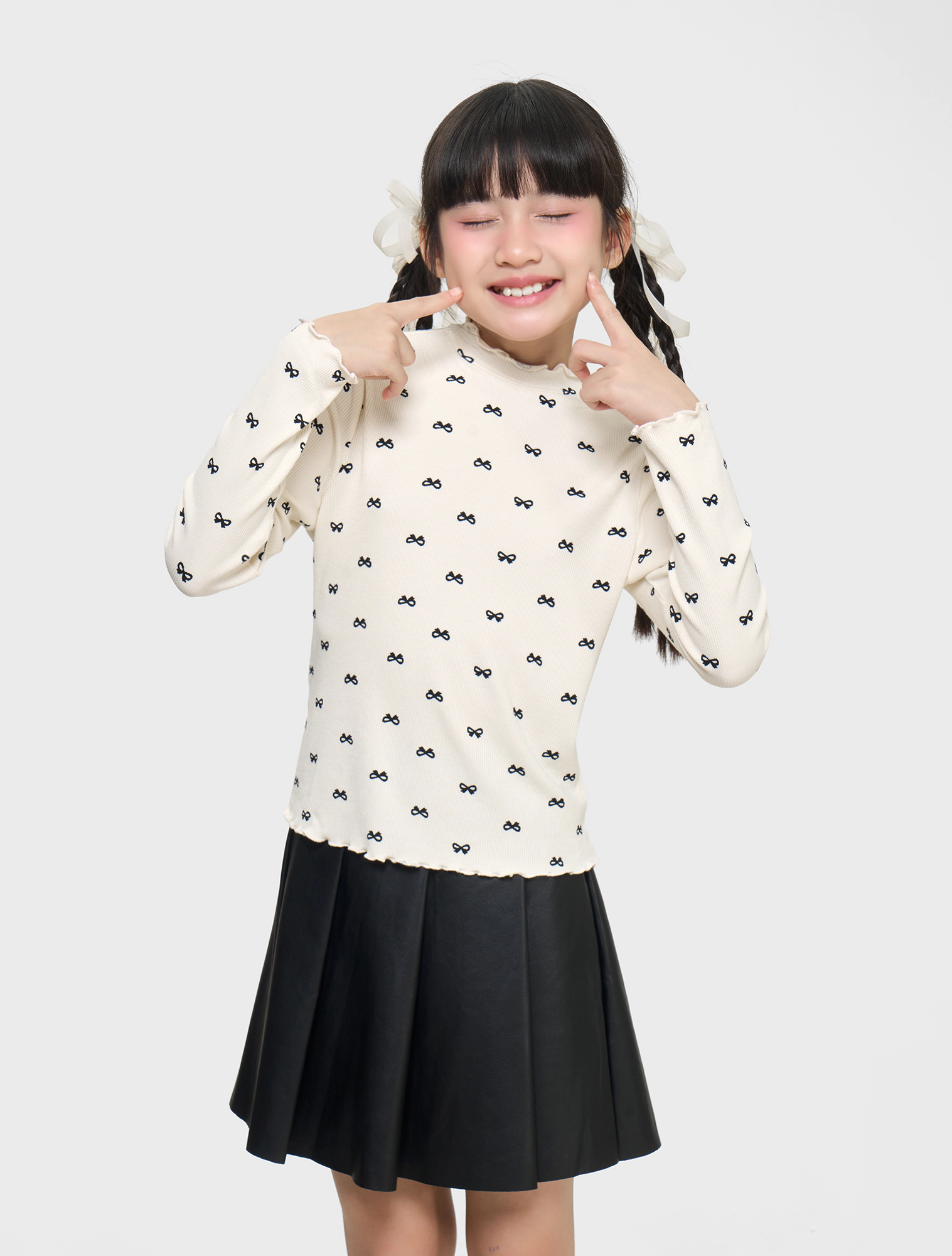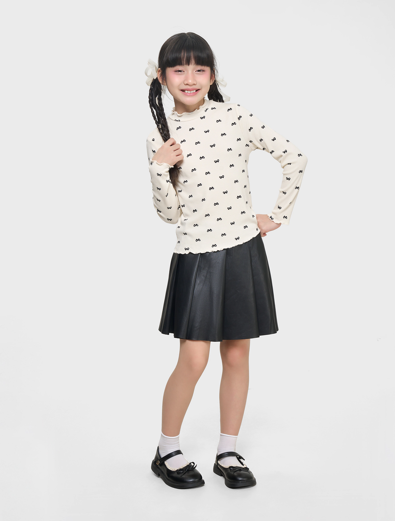 Áo phông dài tay bé gái với thiết kế phom dáng ôm gọn gàng, cổ cao 3cm dễ mặc.