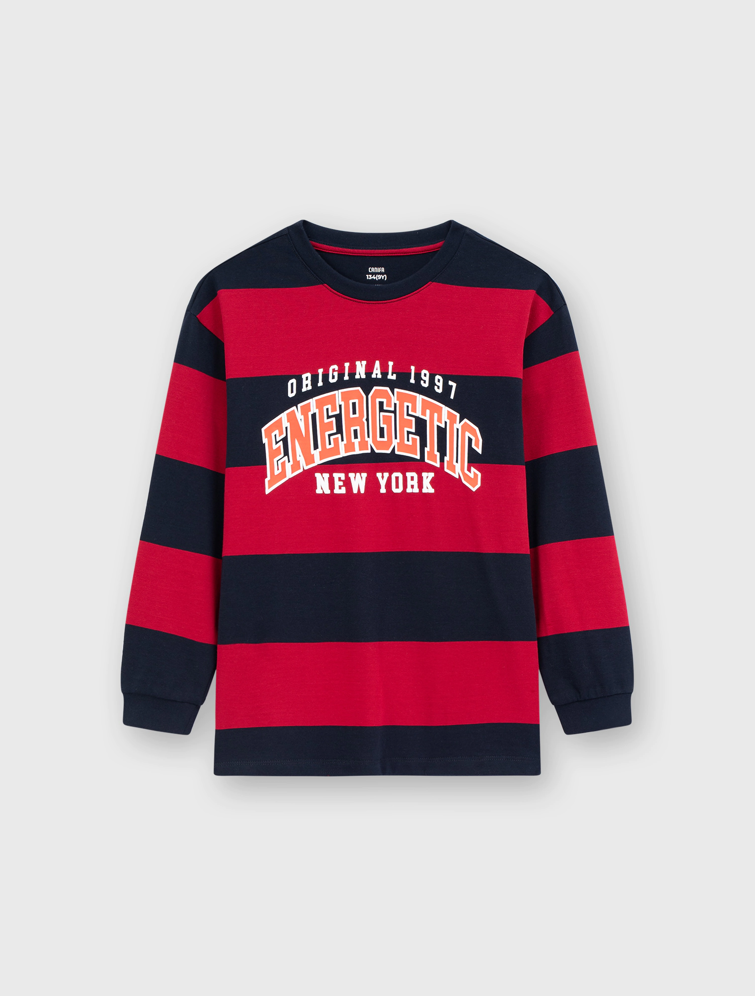 Áo thun kẻ dài tay bé trai, phom dáng thoải mái, nguyên liệu mềm mại, hình in năng động tạo sự thoải mái cho bé sử dụng.
