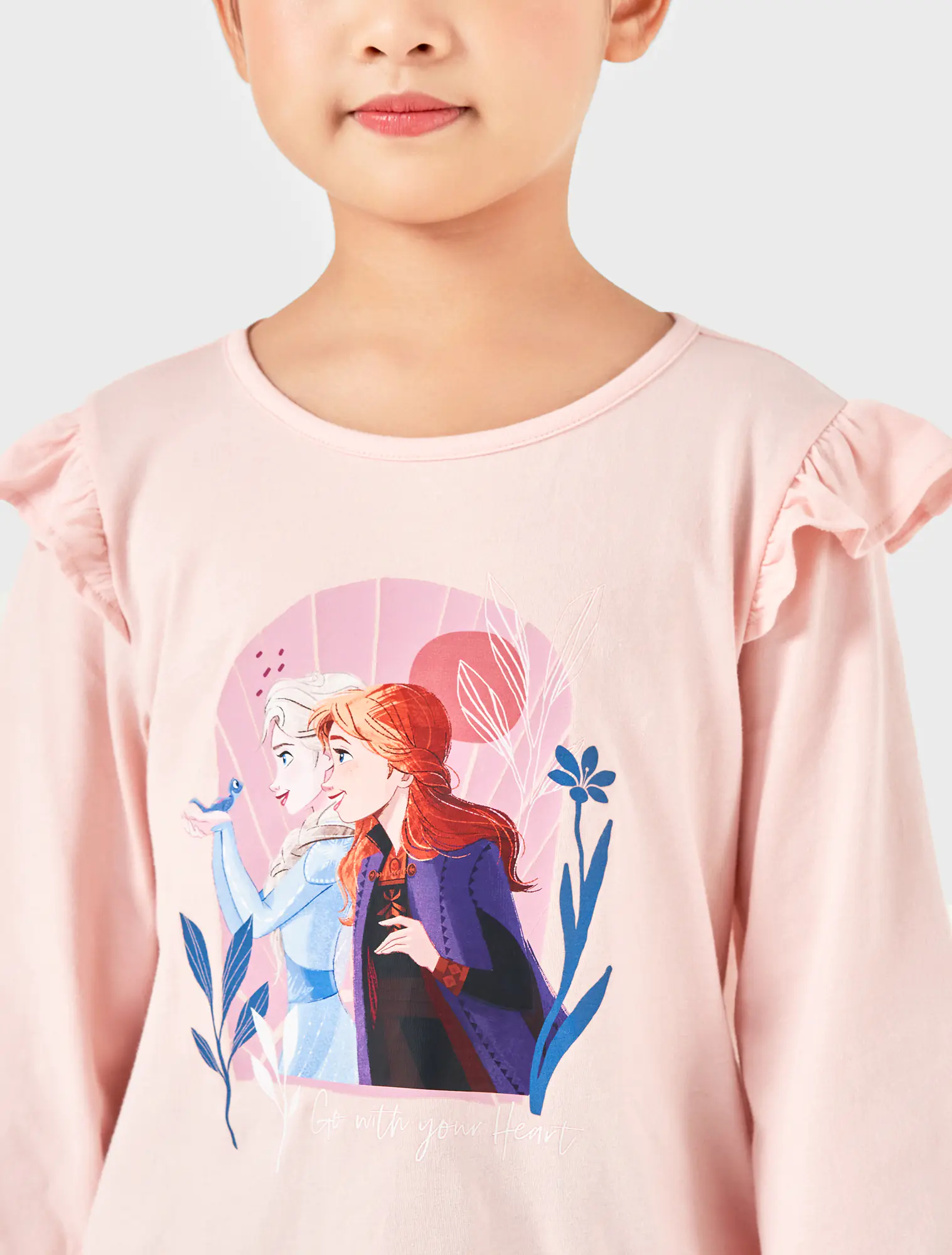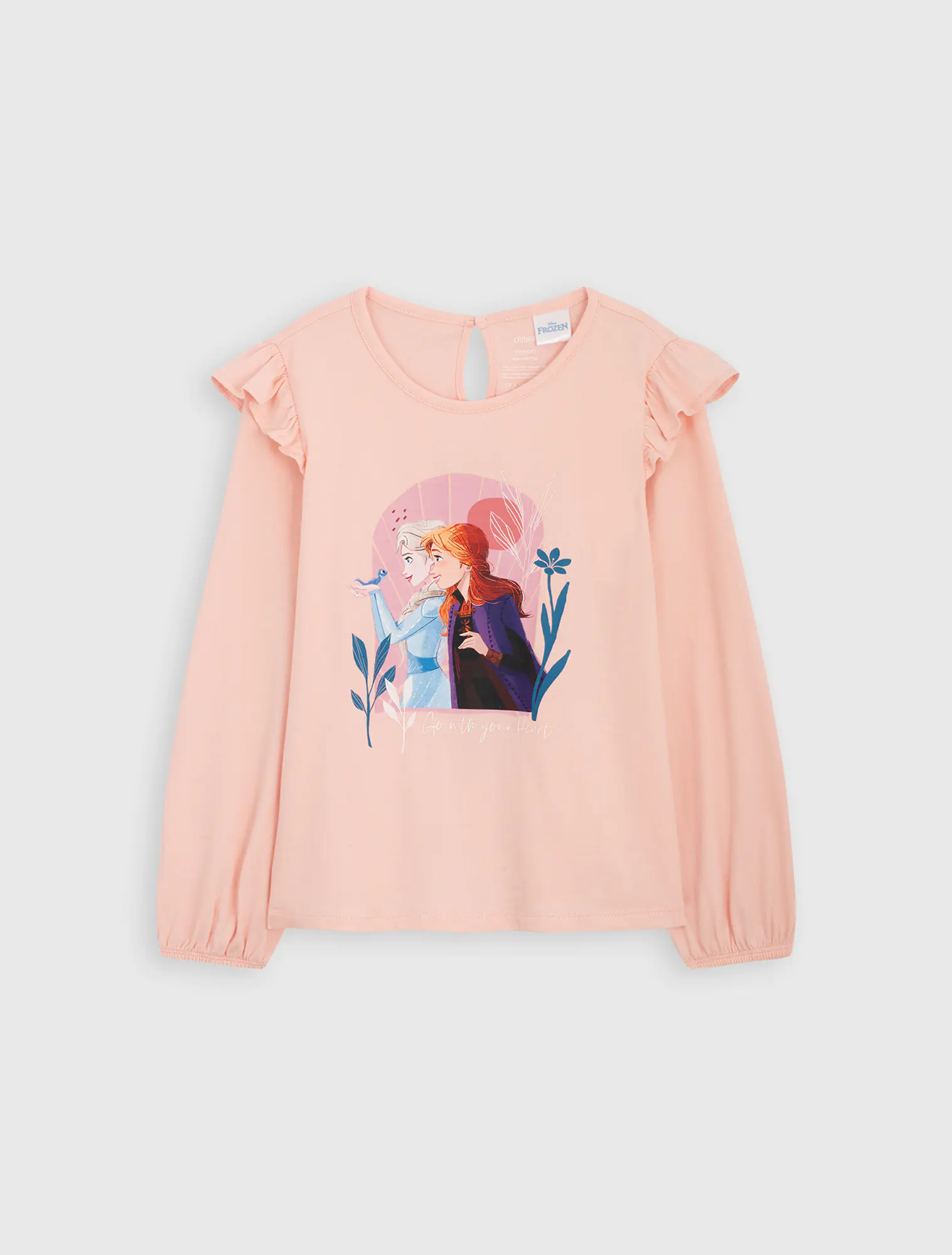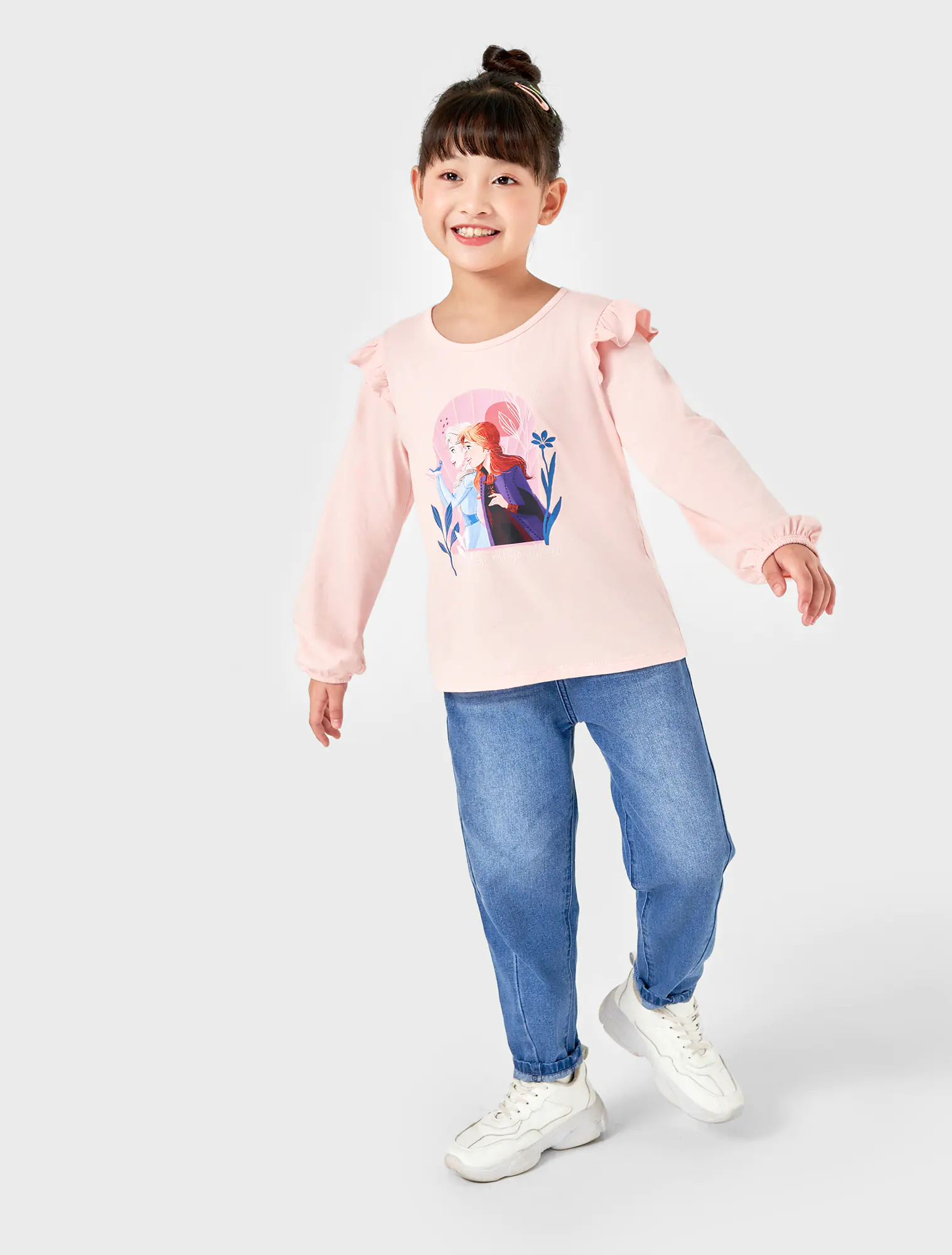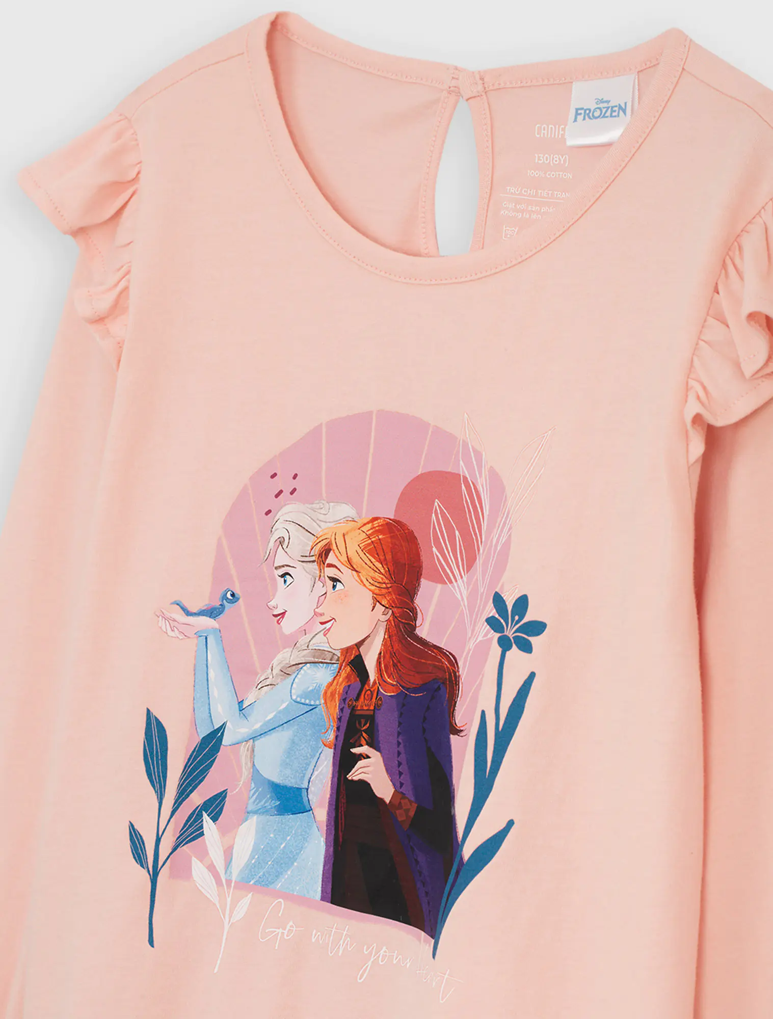 Áo phông chất liệu 100% cotton, cổ tròn tay dài, bèo vai.
