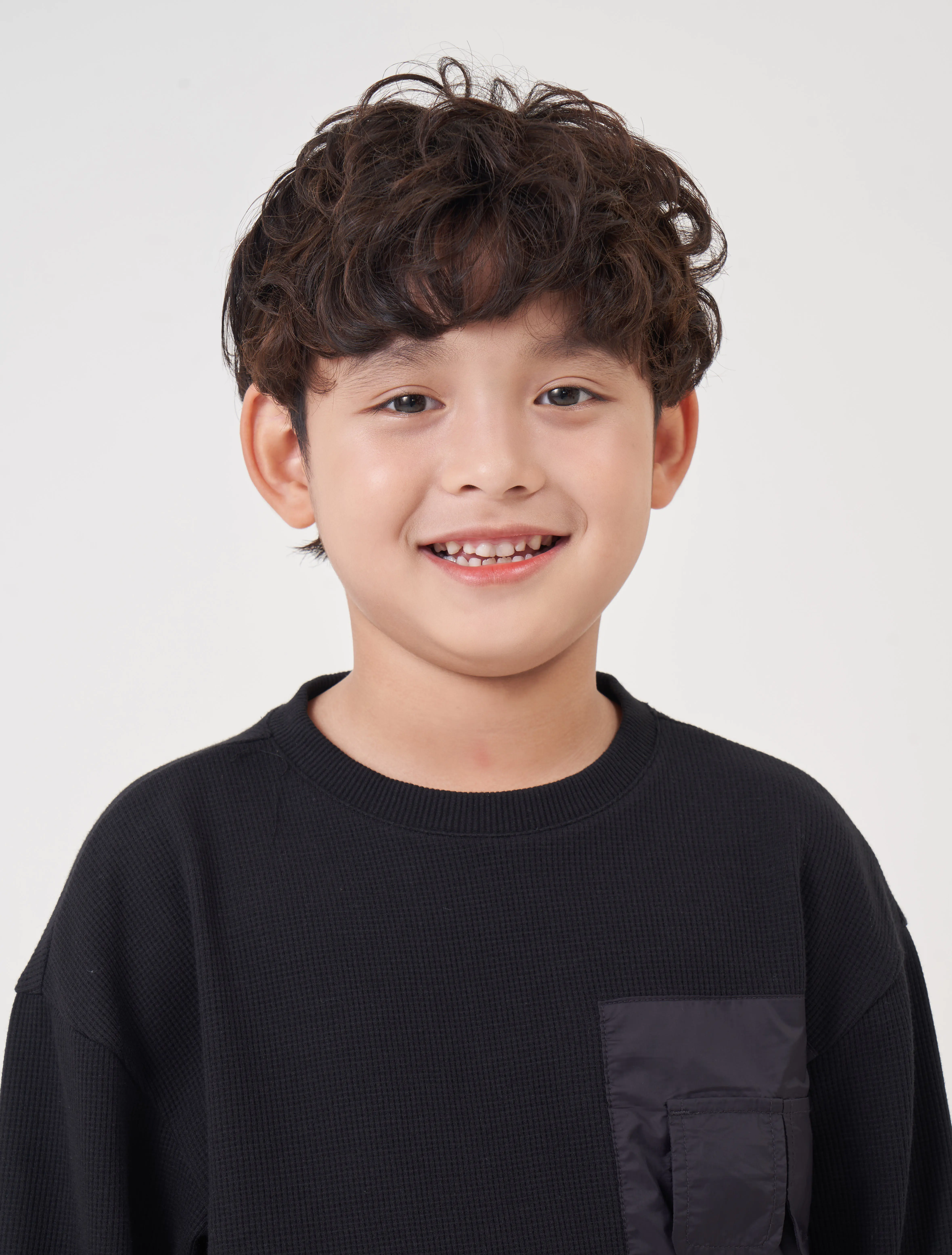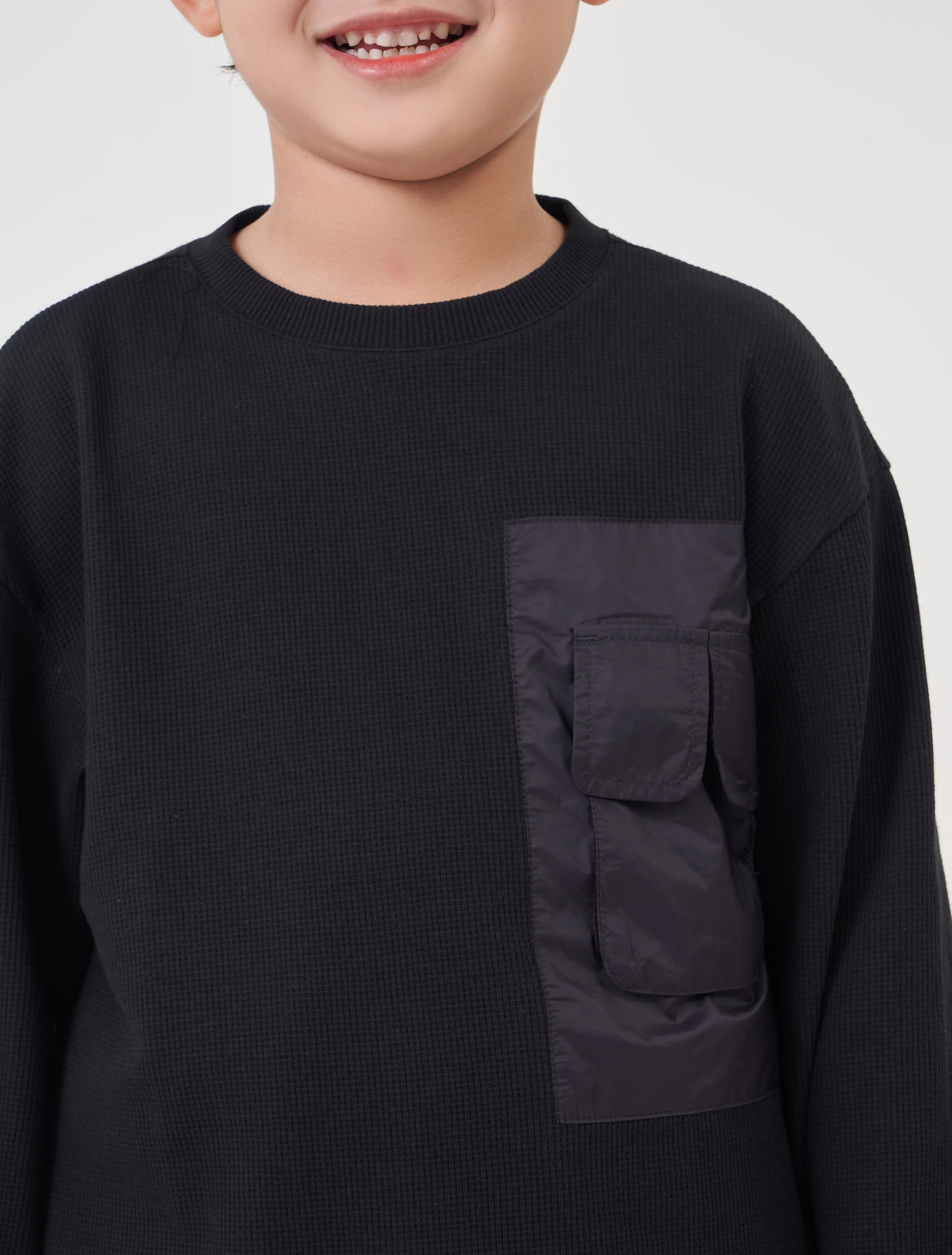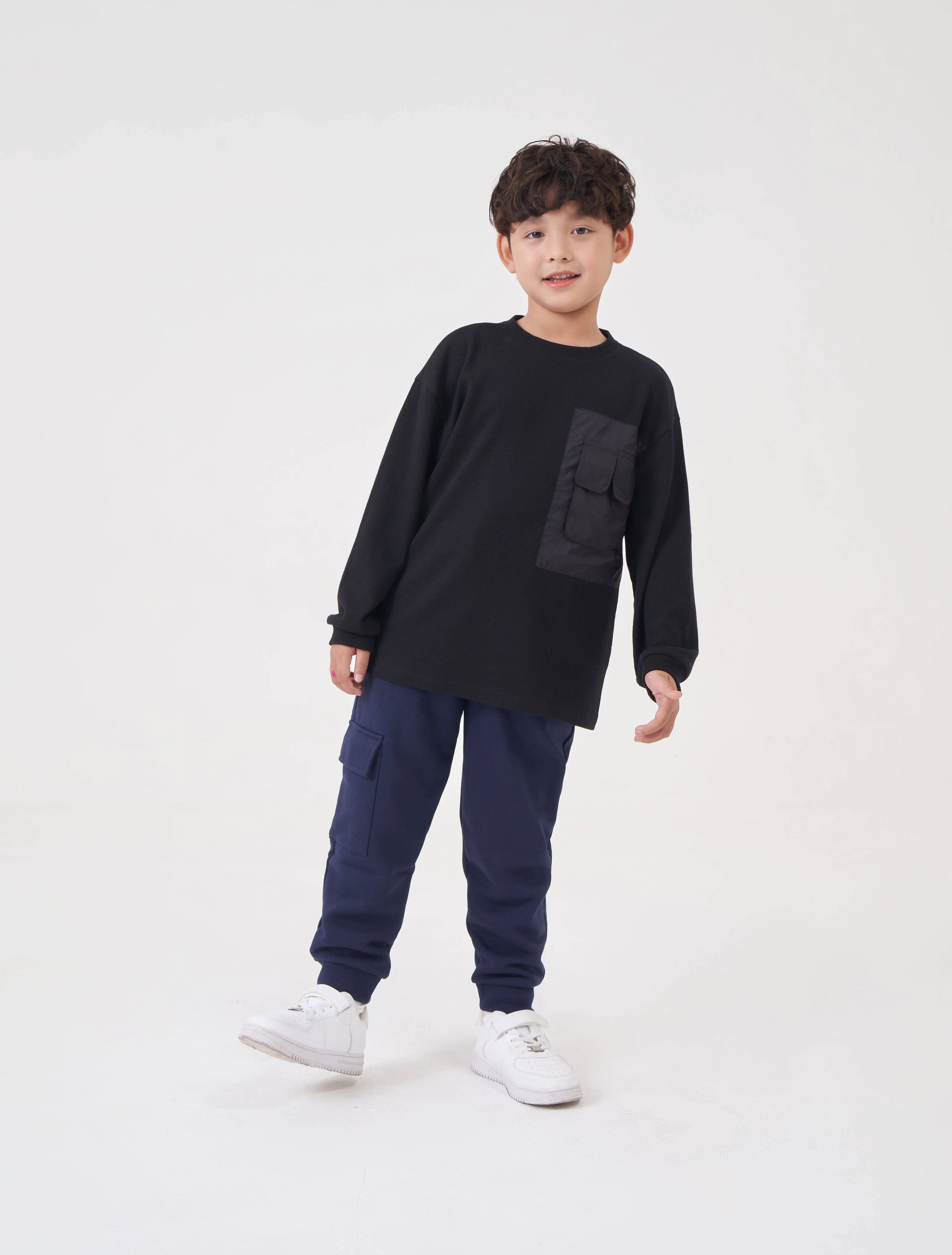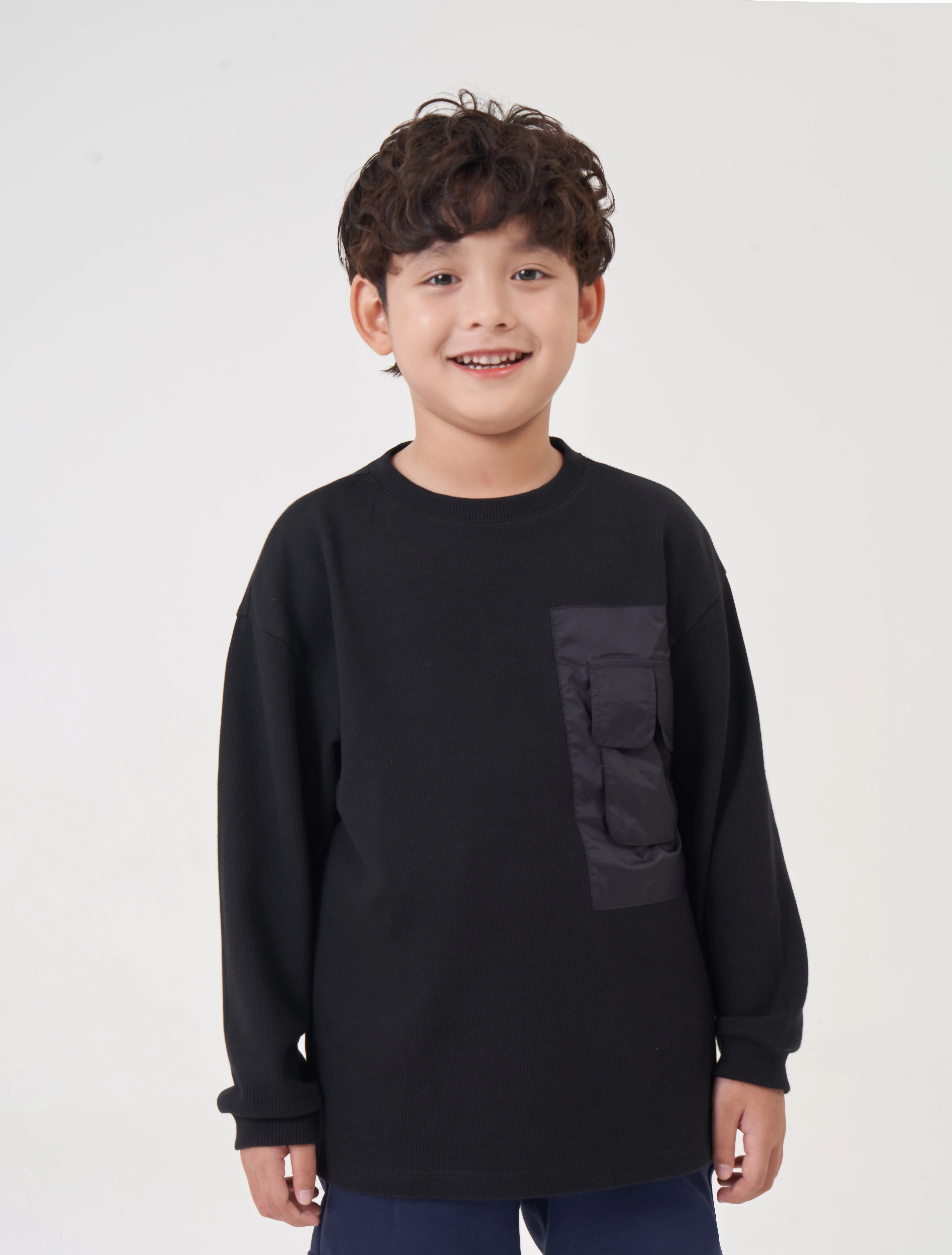 Áo phông dài tay bé trai dáng oversize thoải mái, túi ốp gió tạo sự khỏe khoắn và năng động.