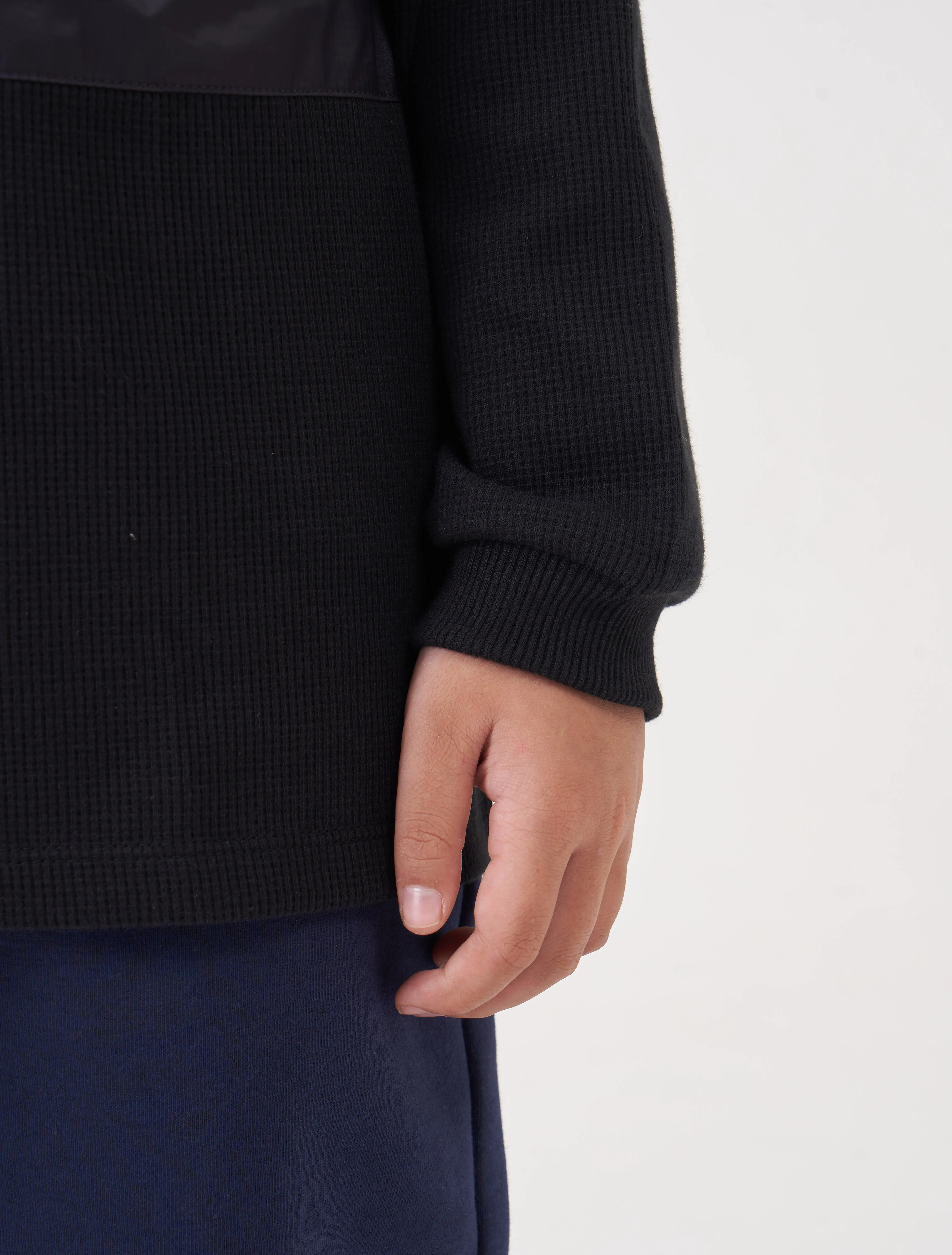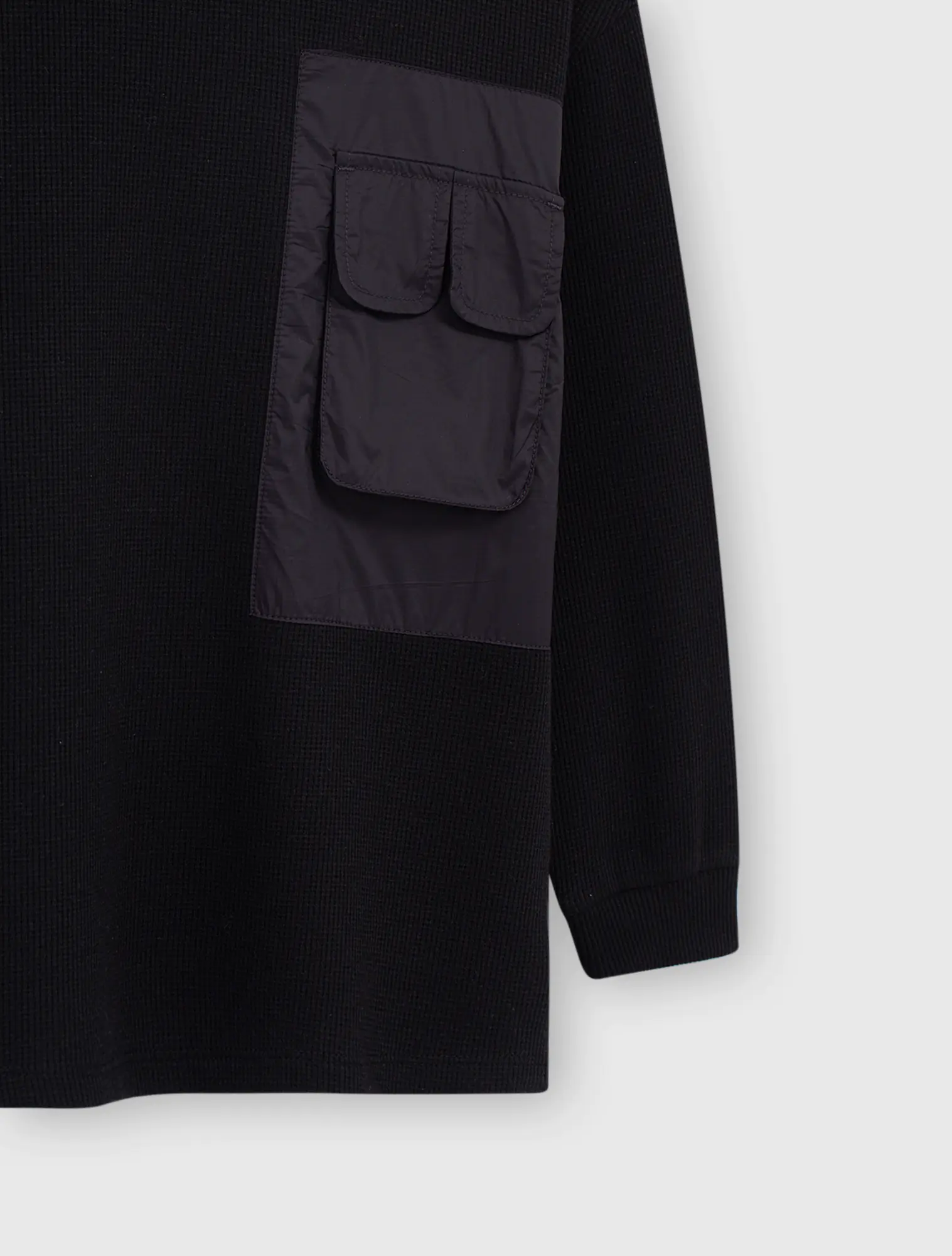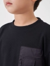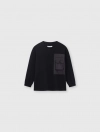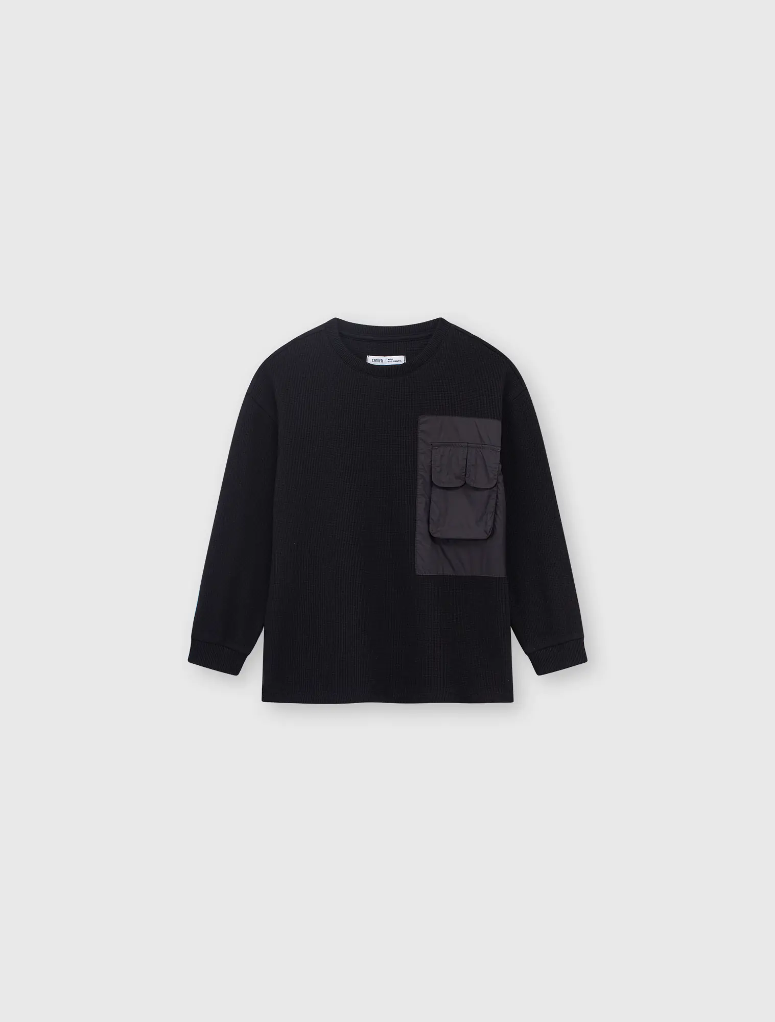 Áo phông dài tay bé trai dáng oversize thoải mái, túi ốp gió tạo sự khỏe khoắn và năng động.