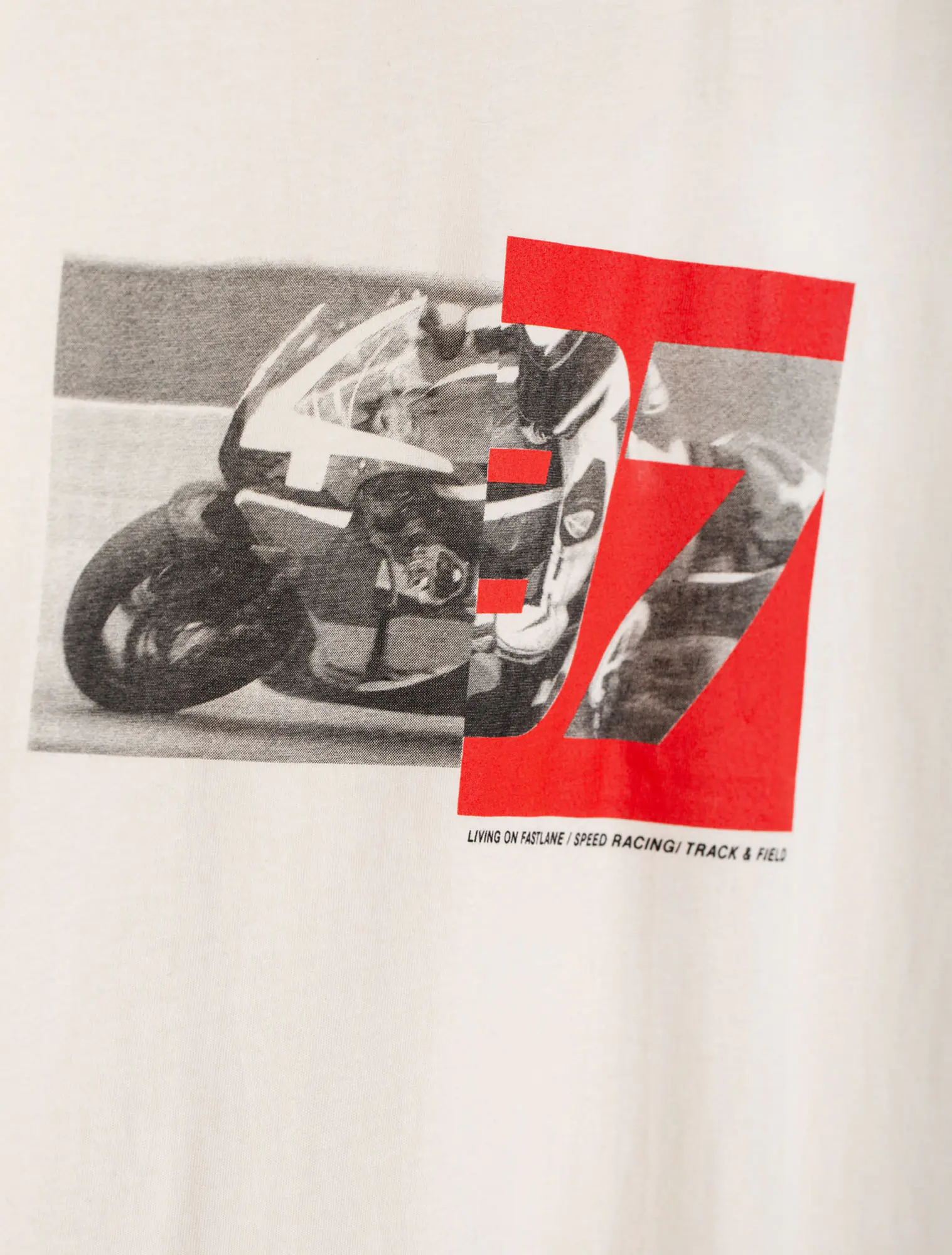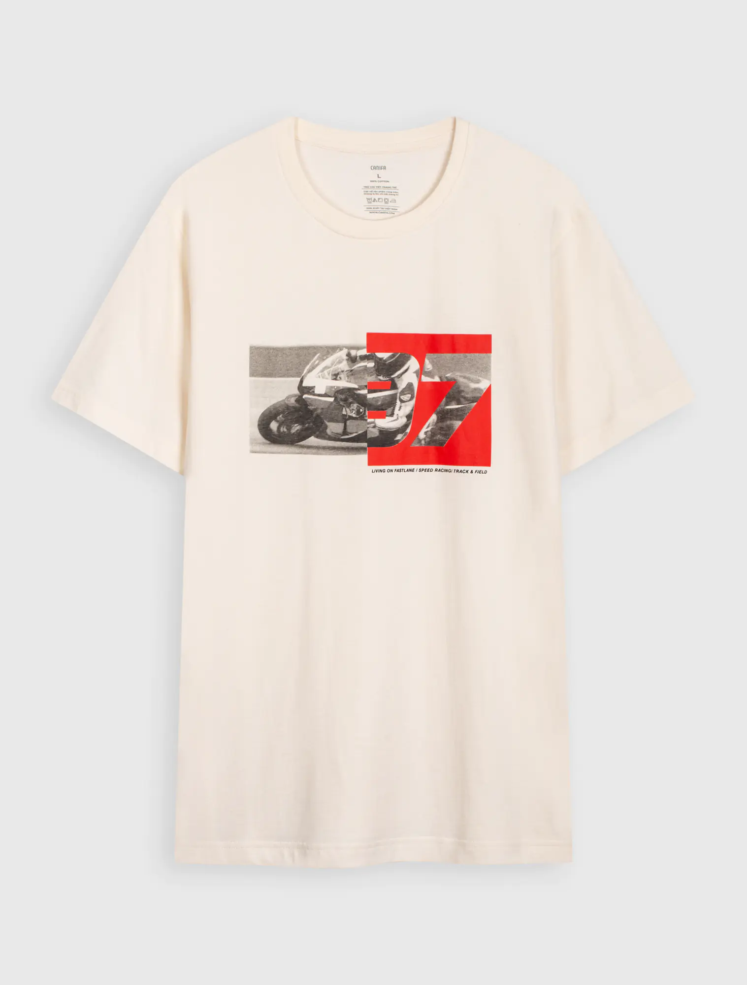 Áo phông chất liệu cotton USA cổ tròn dáng regular, cổ tròn, tay cộc.hình in typo và hình ảnh
