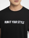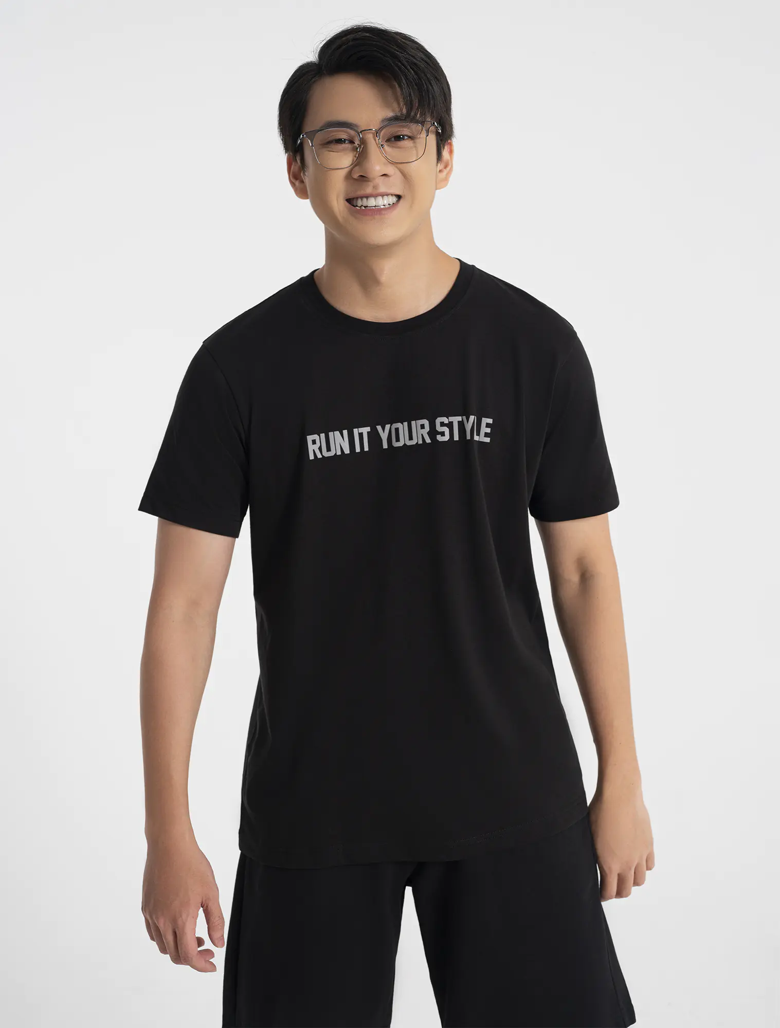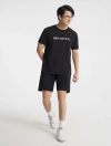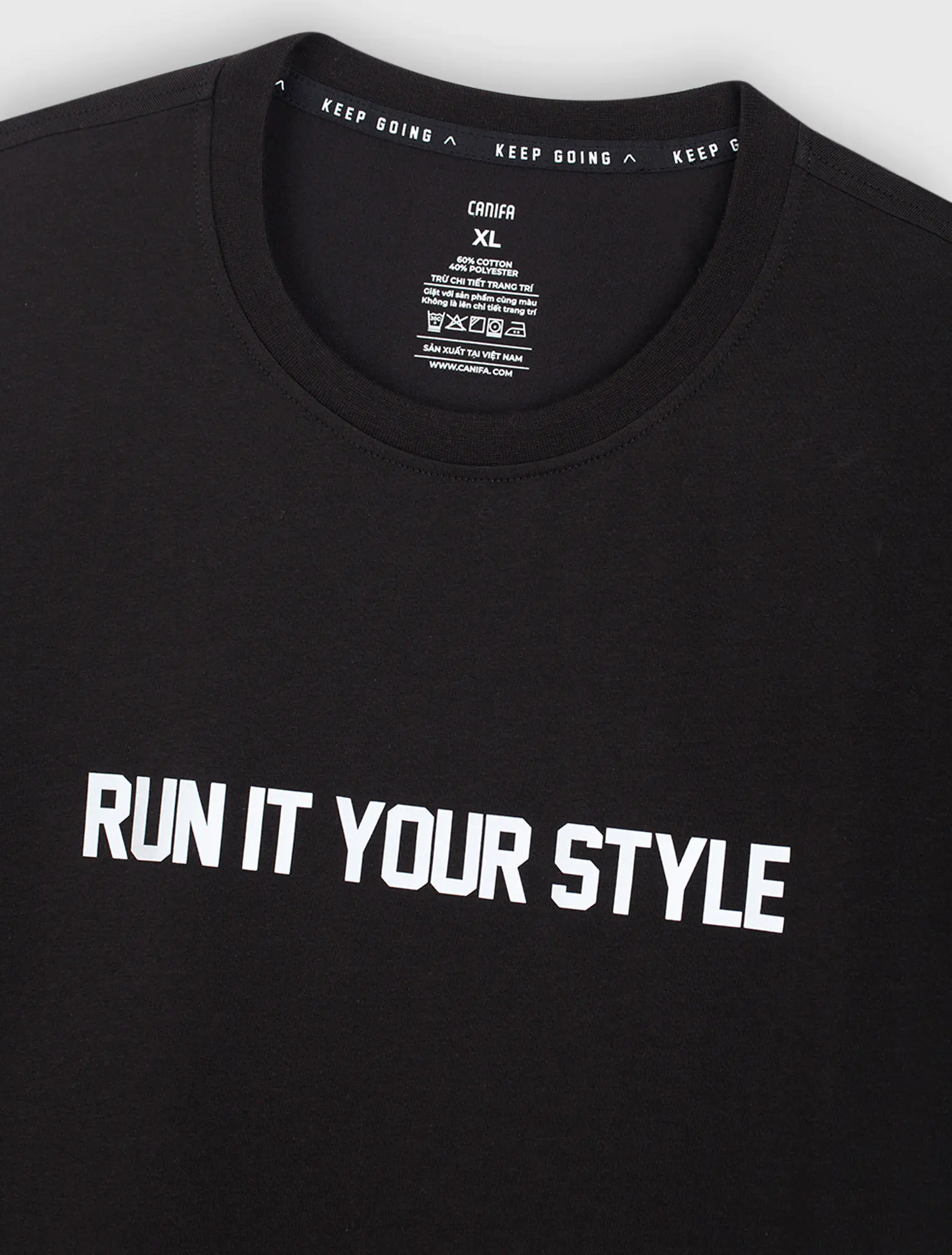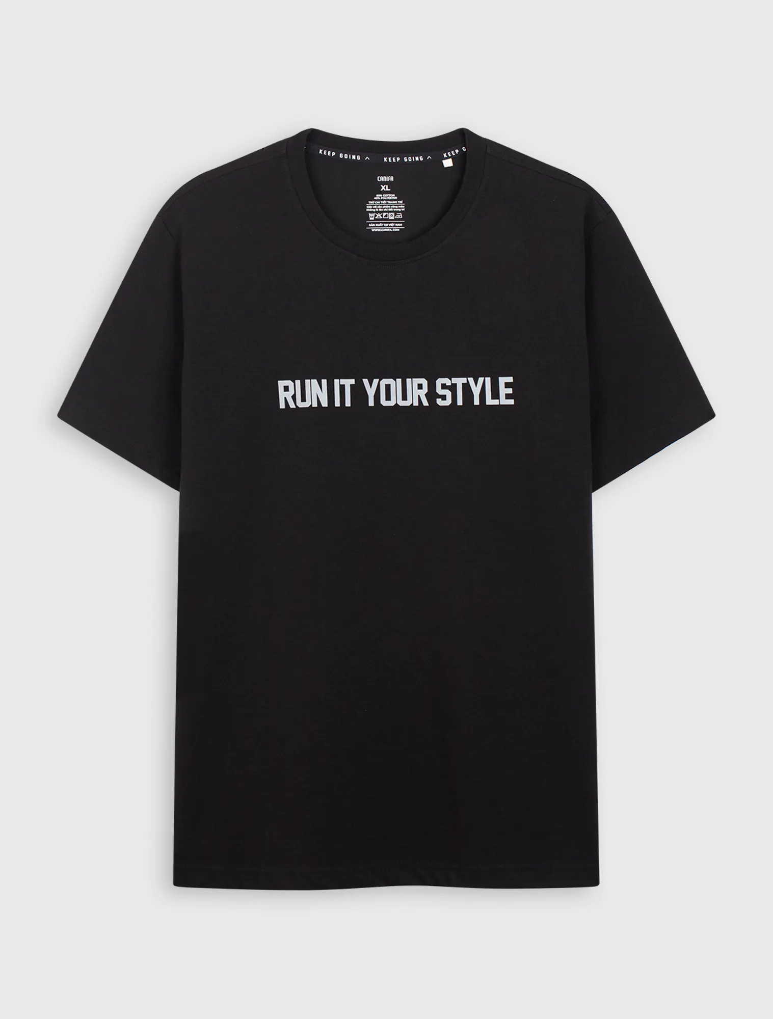 Áo phông chất liệu cotton pha, in chữ ở ngực.