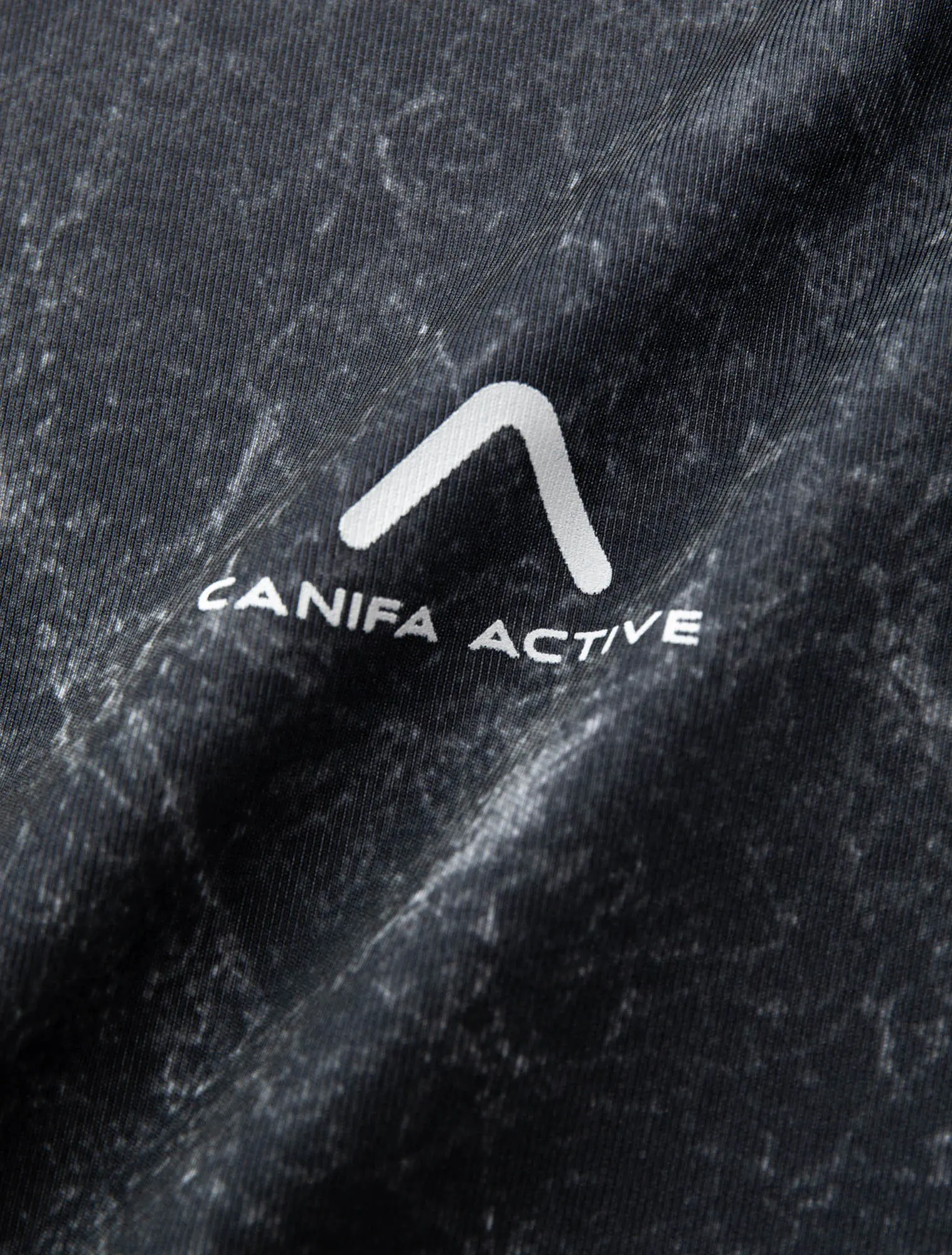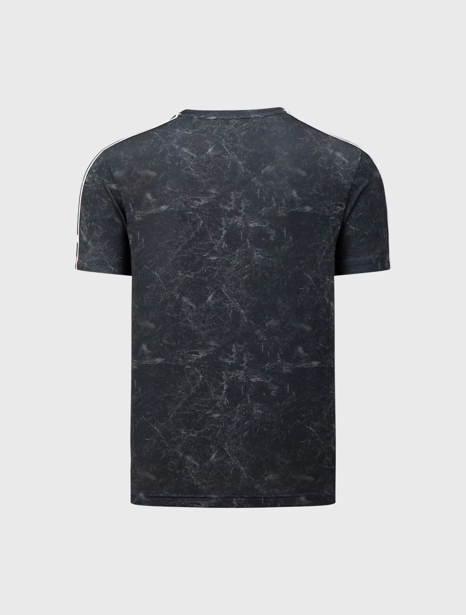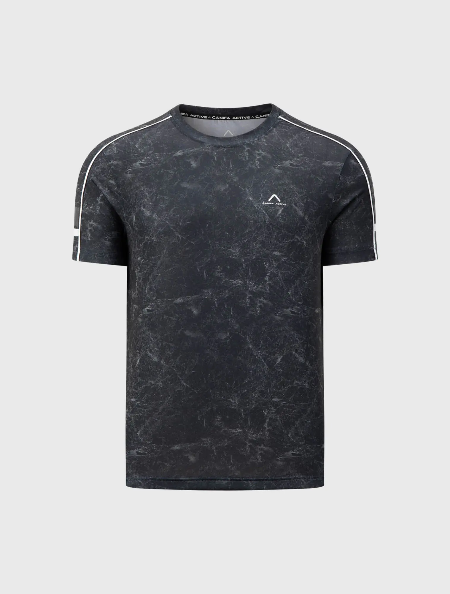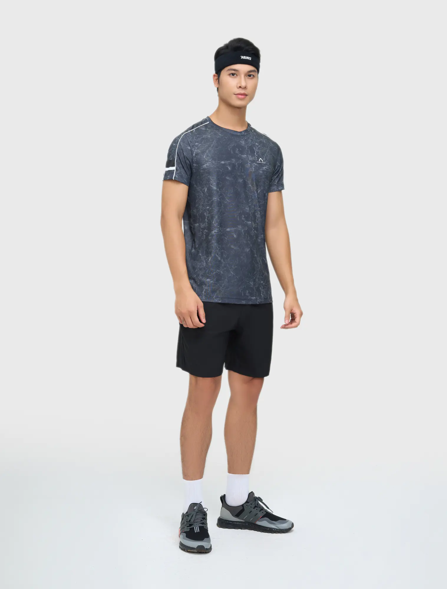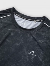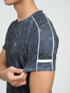 Áo phông active nam có họa tiết in tràn ấn tượng, kết hợp phối lé dọc tay và hình in tại tay.
