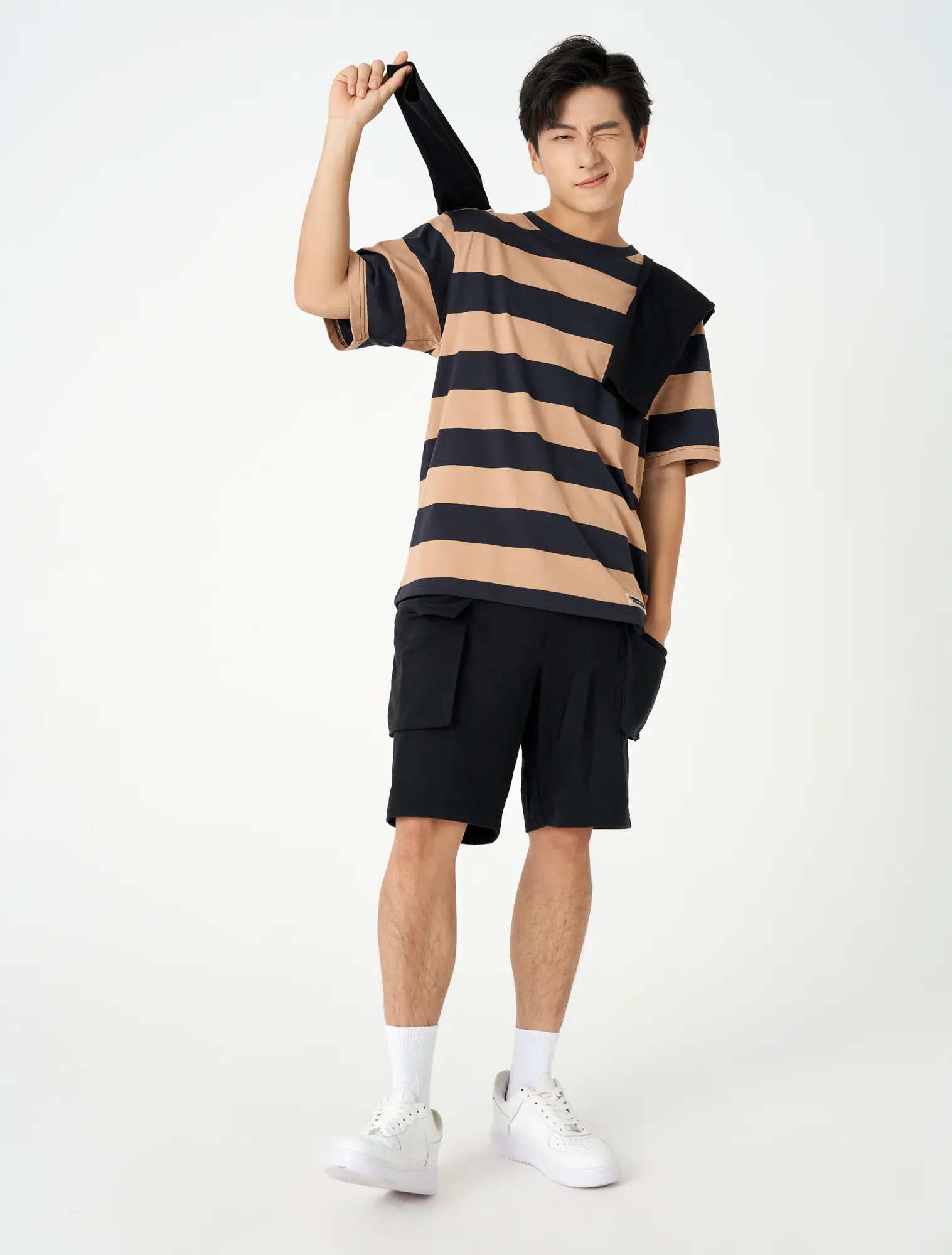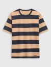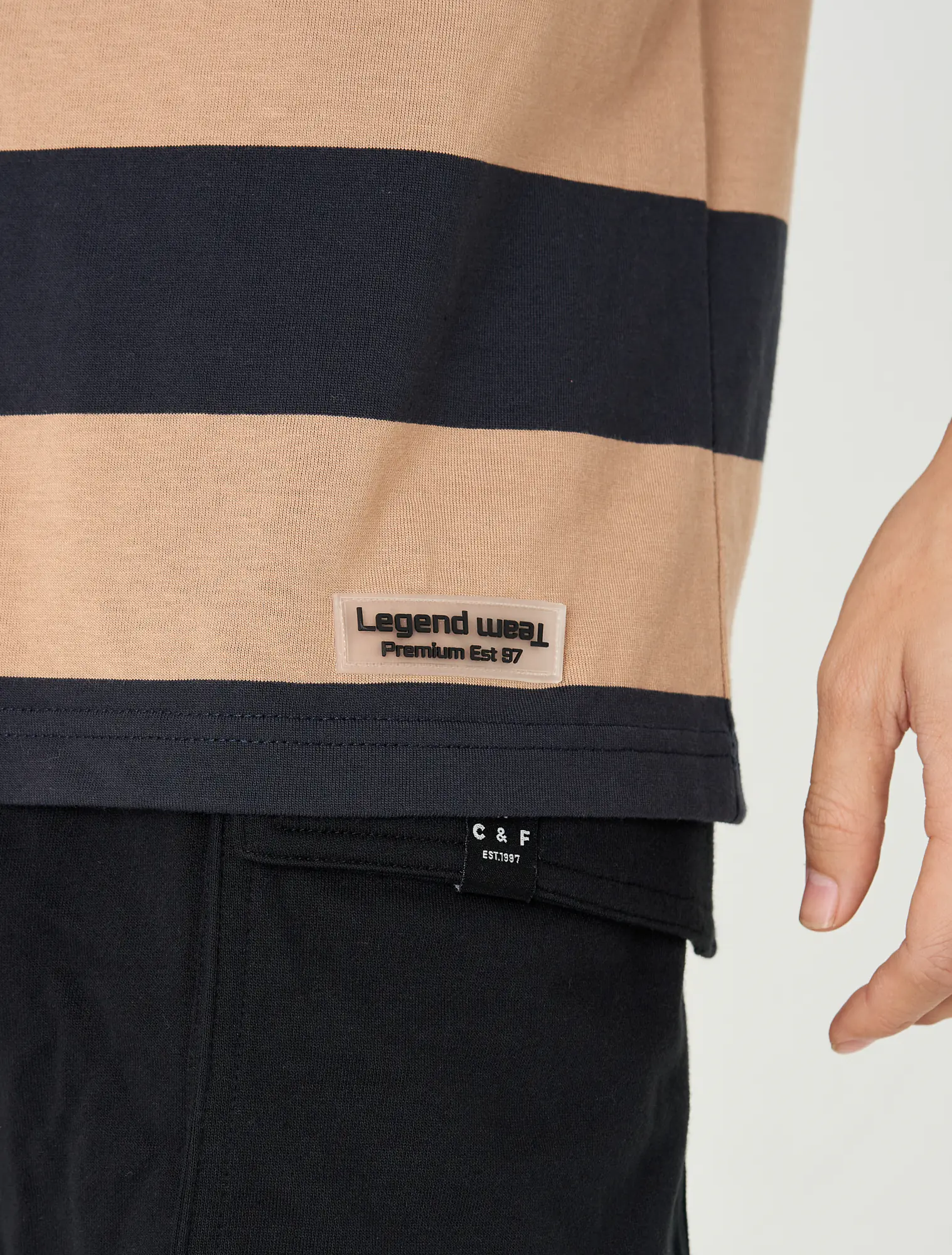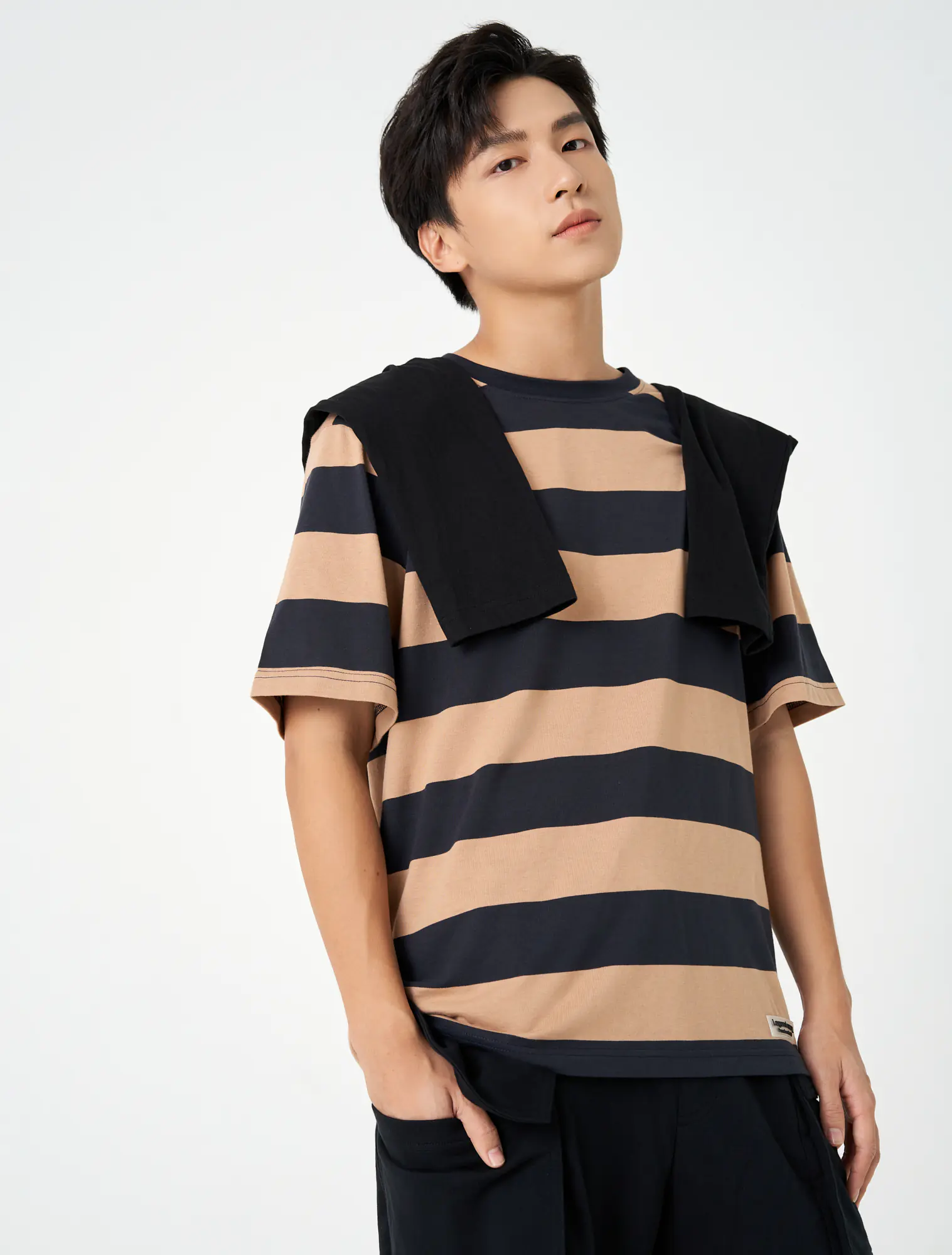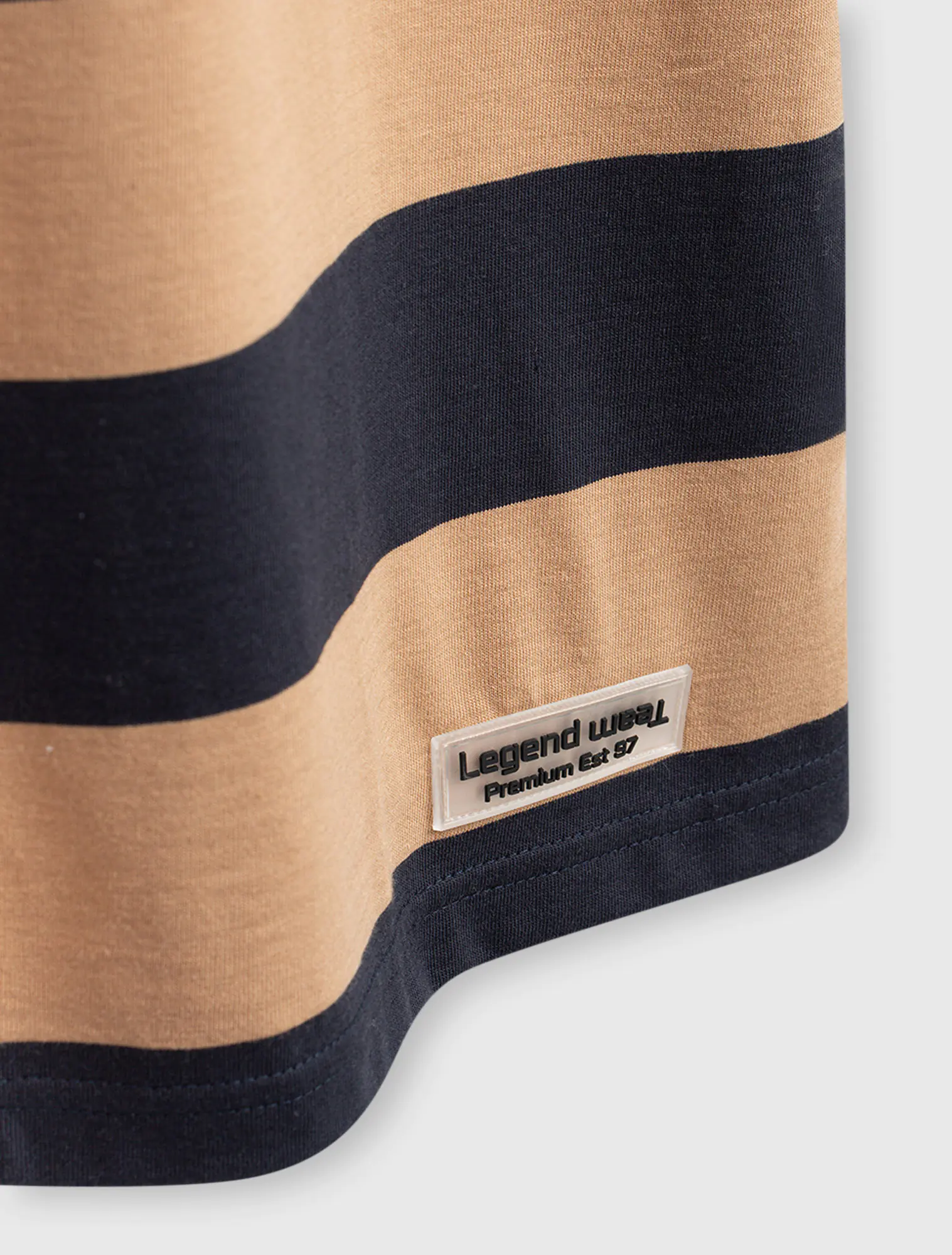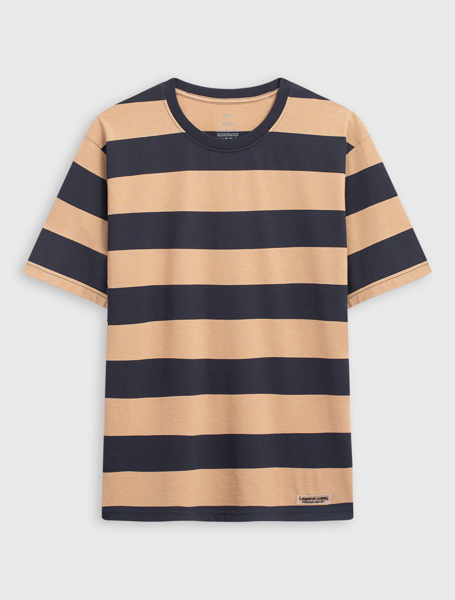 Áo phông nam chất liệu cotton pha, cổ tròn tra bo, tay cộc, đính patch trang trí gấu áo, phom regular.