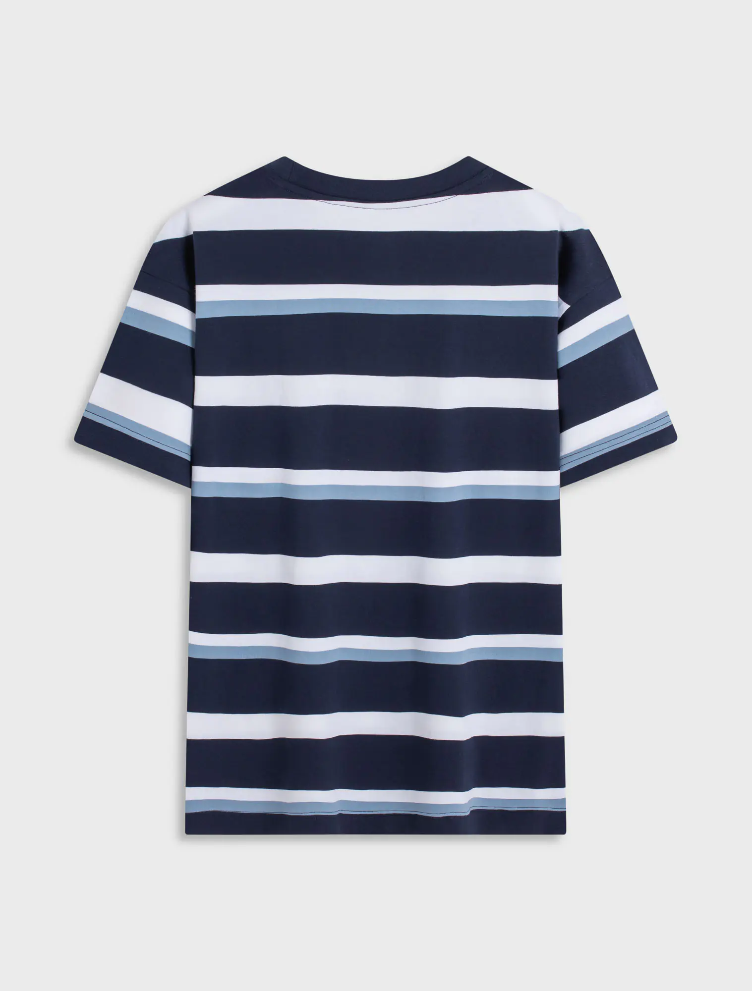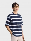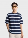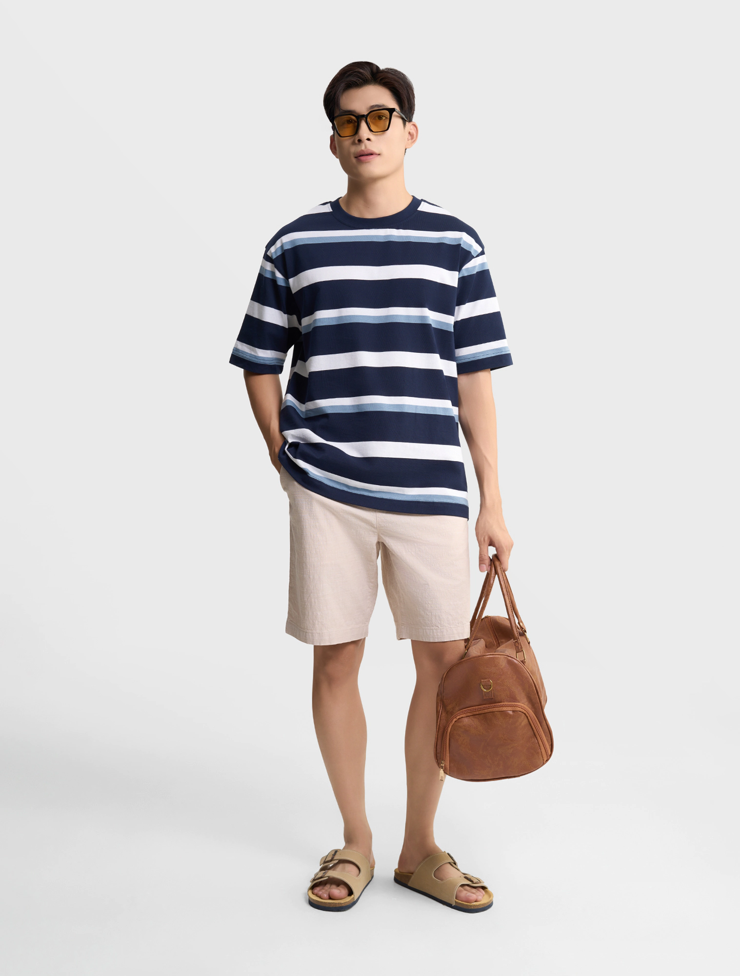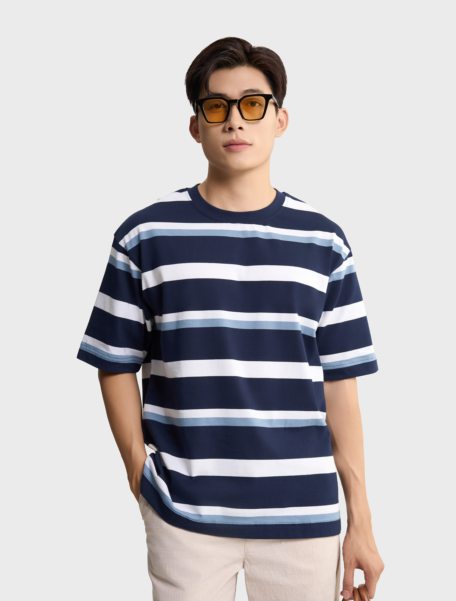 Áo phông nam dệt kẻ dáng relax với chi tiết thêu nhỏ trên ngực làm điểm nhấn.