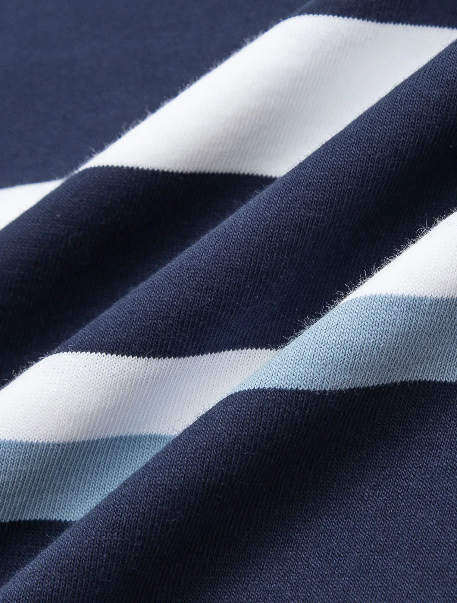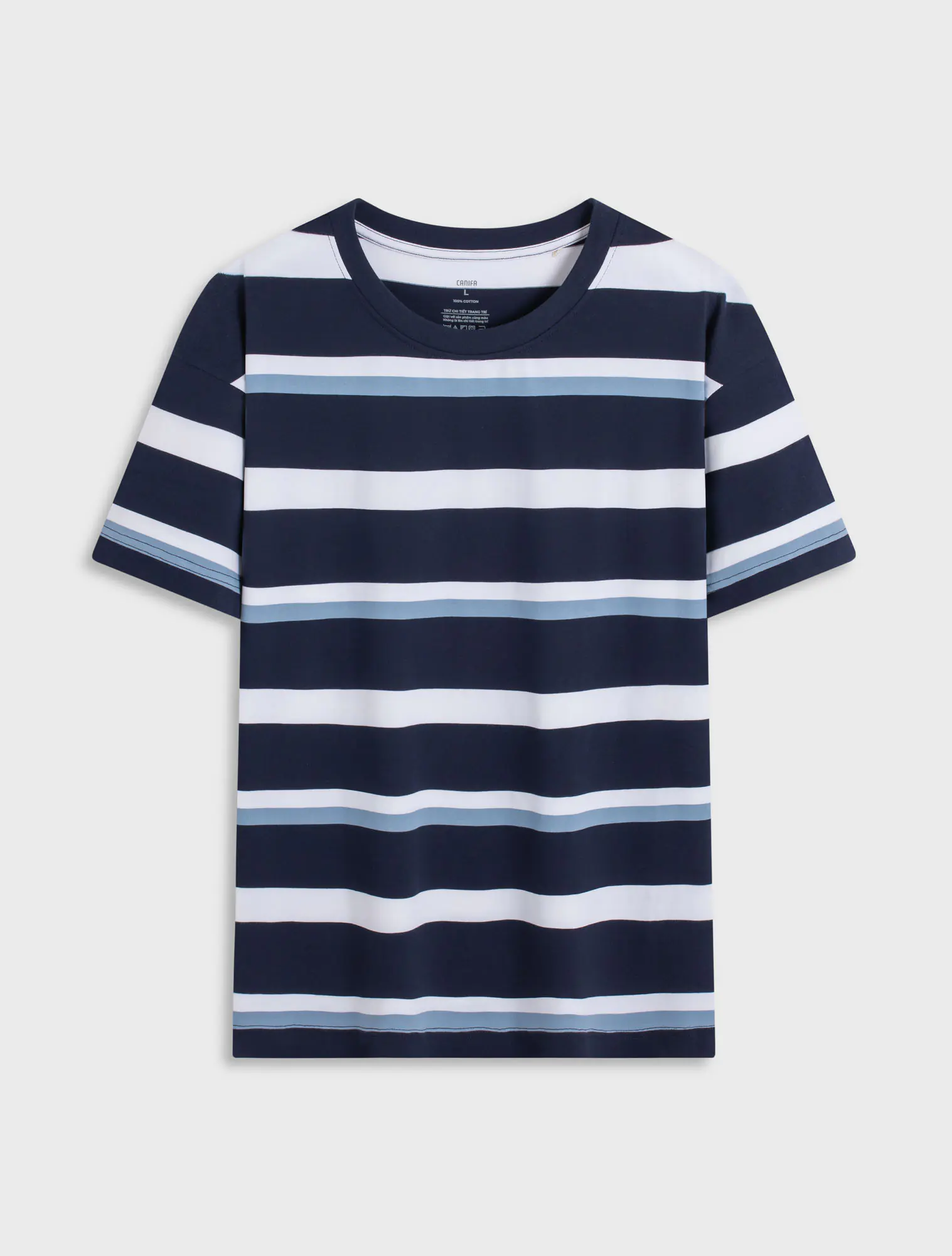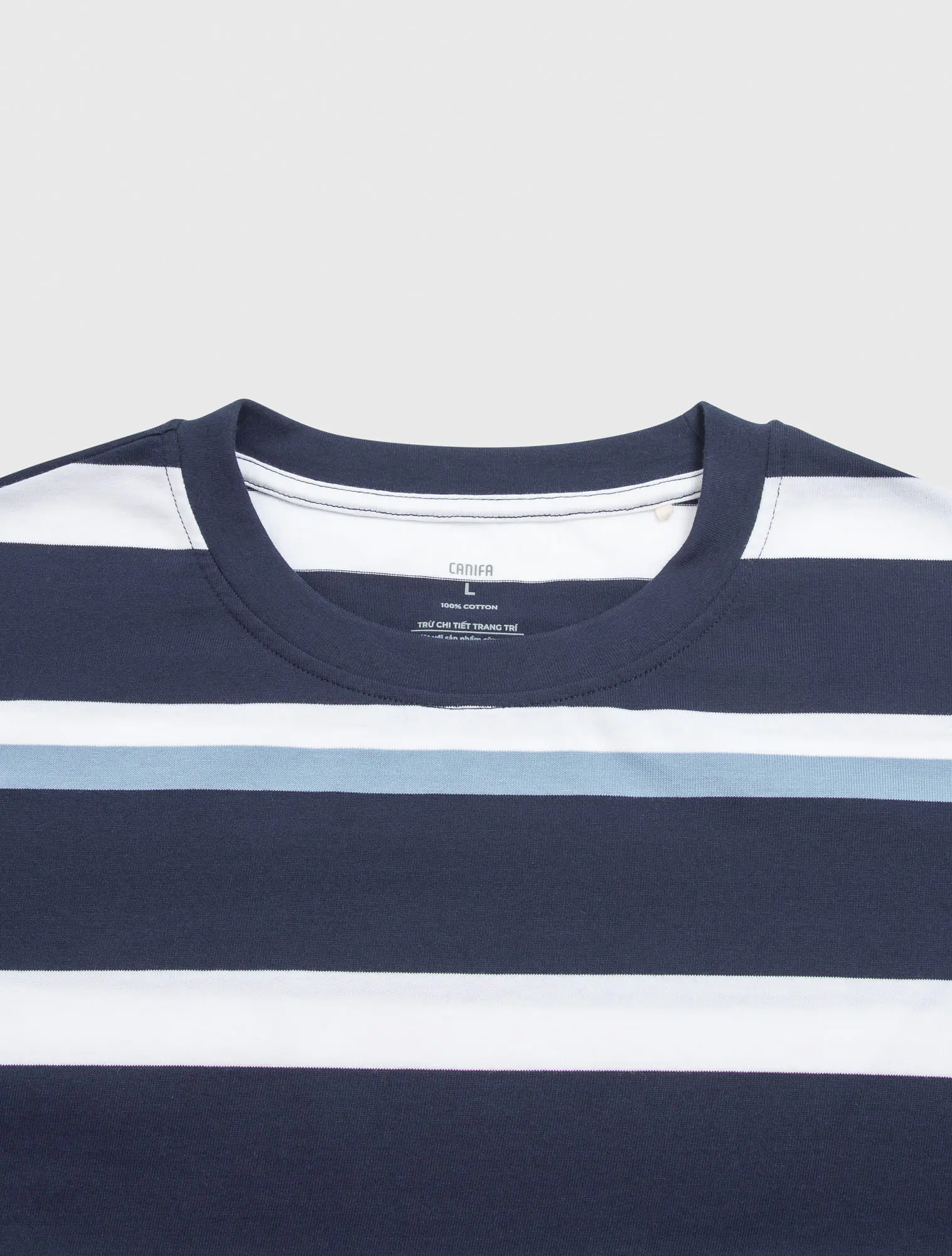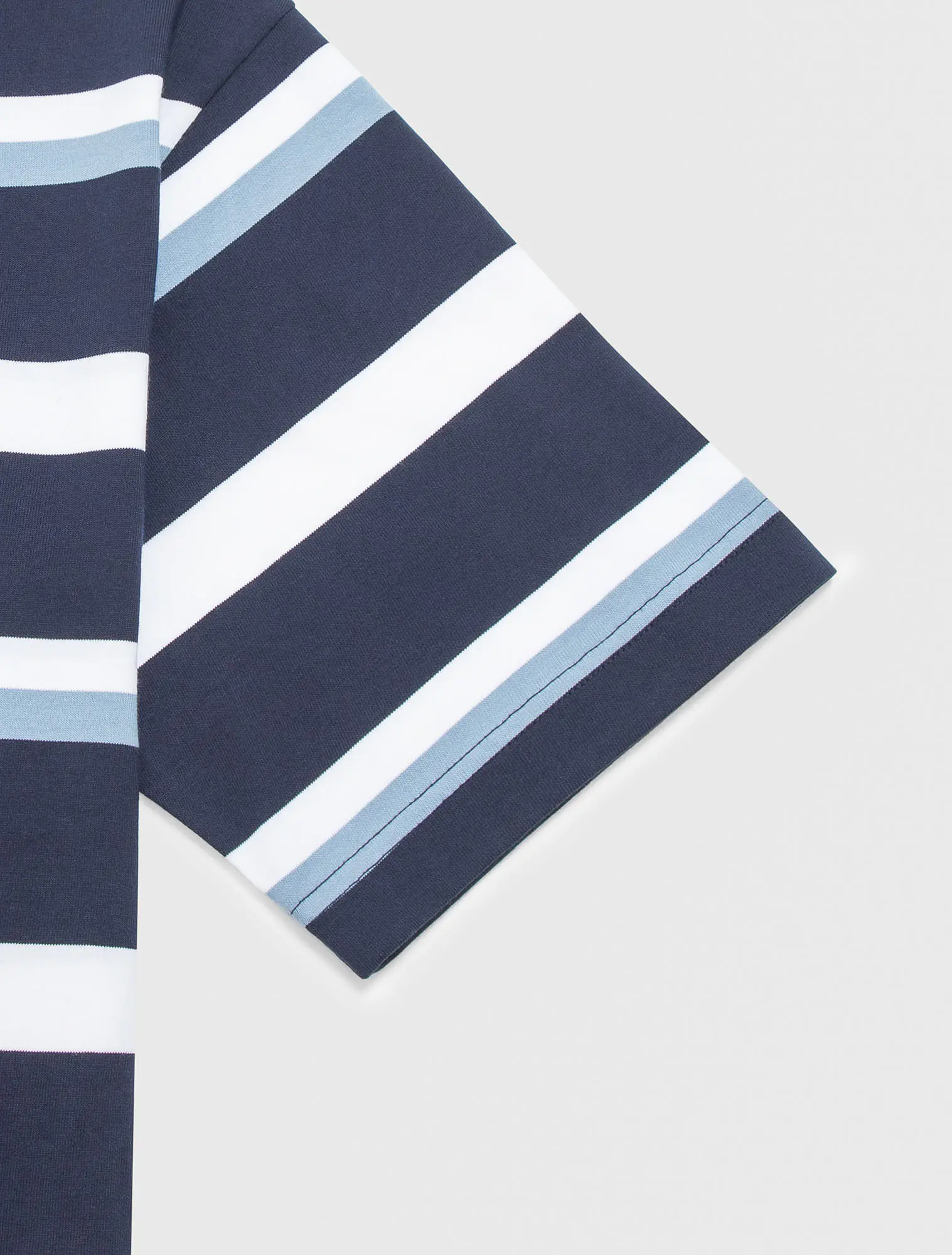 Áo phông nam dệt kẻ dáng relax với chi tiết thêu nhỏ trên ngực làm điểm nhấn.
