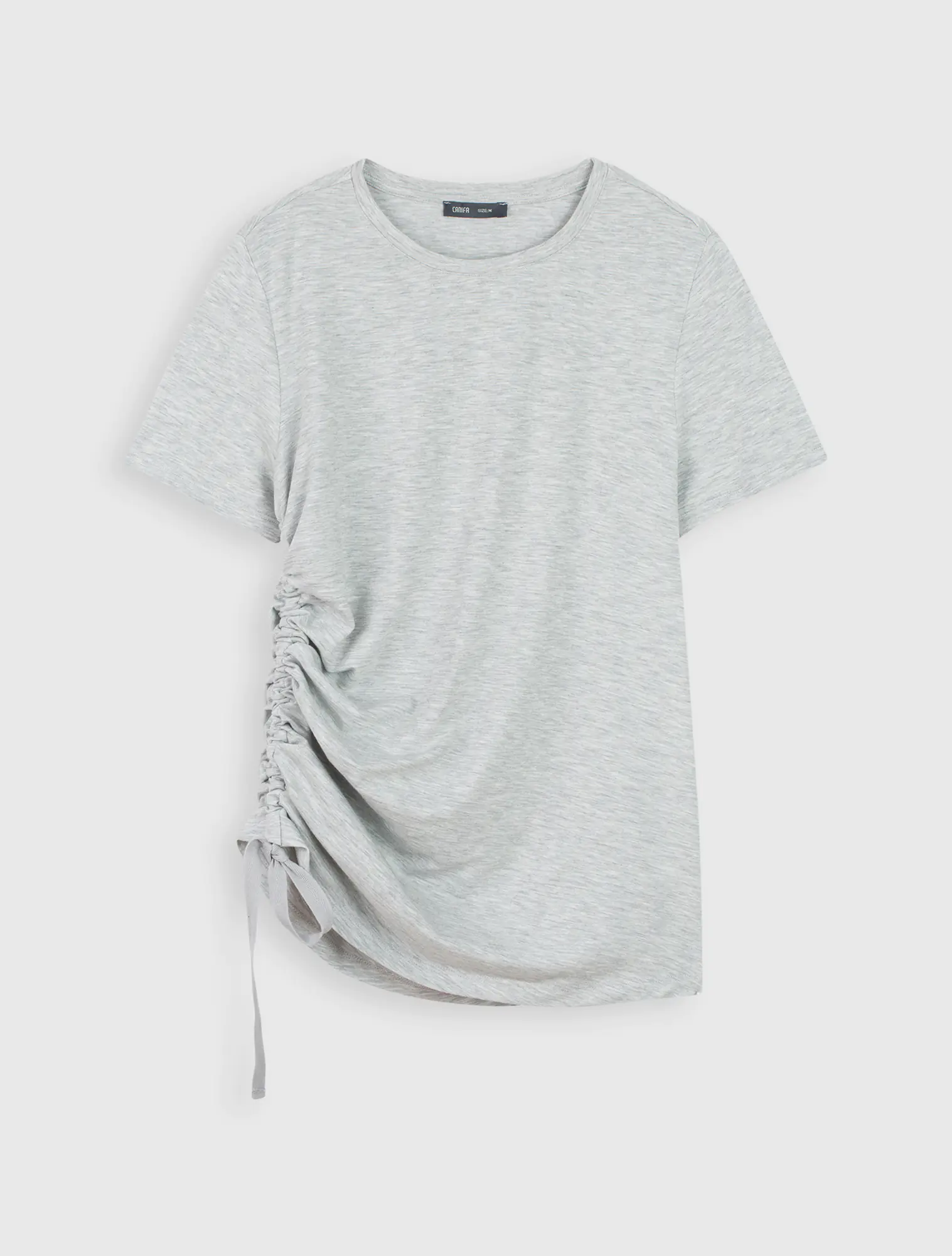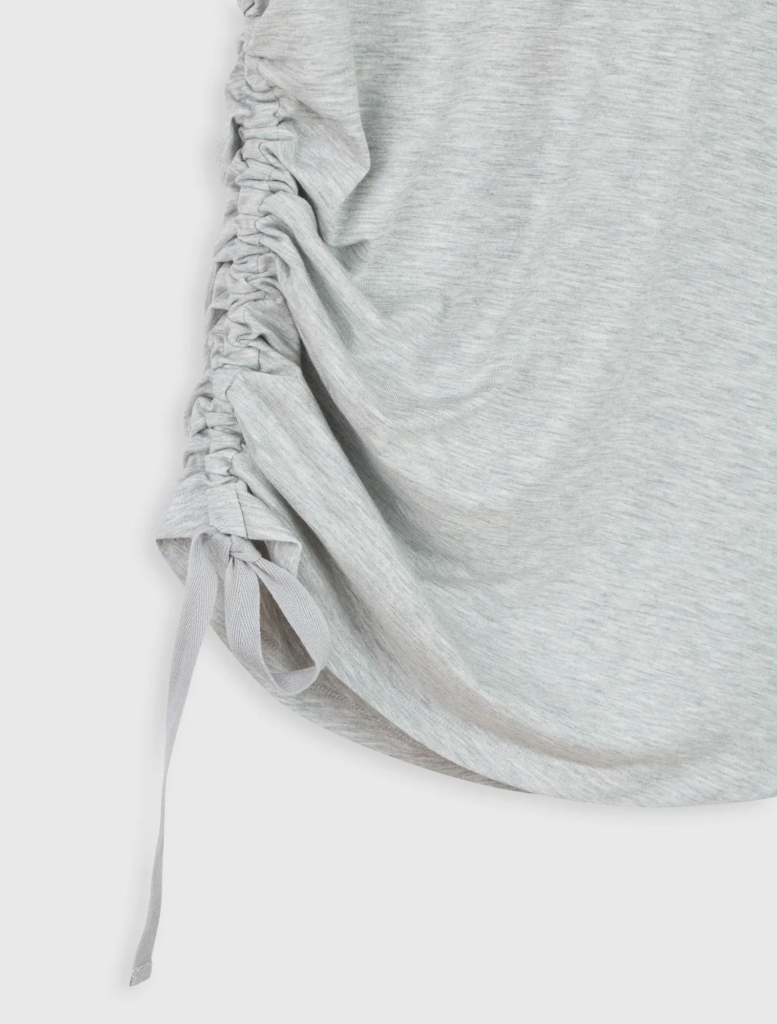 Dáng regular, cổ tròn, tay cộc, rút dây sườn.