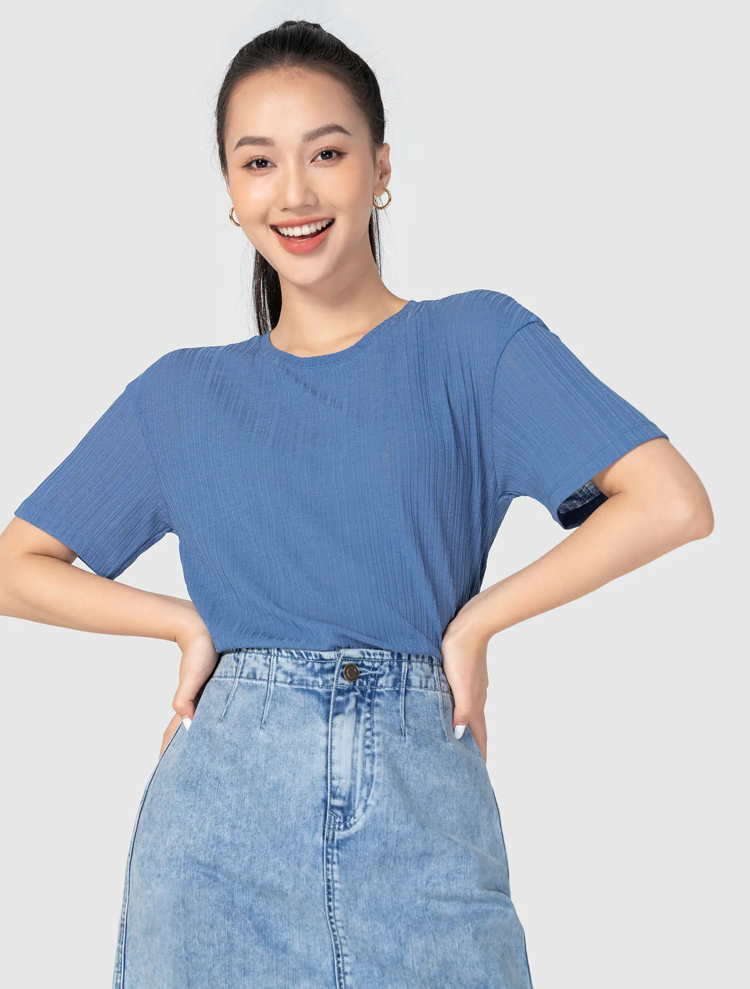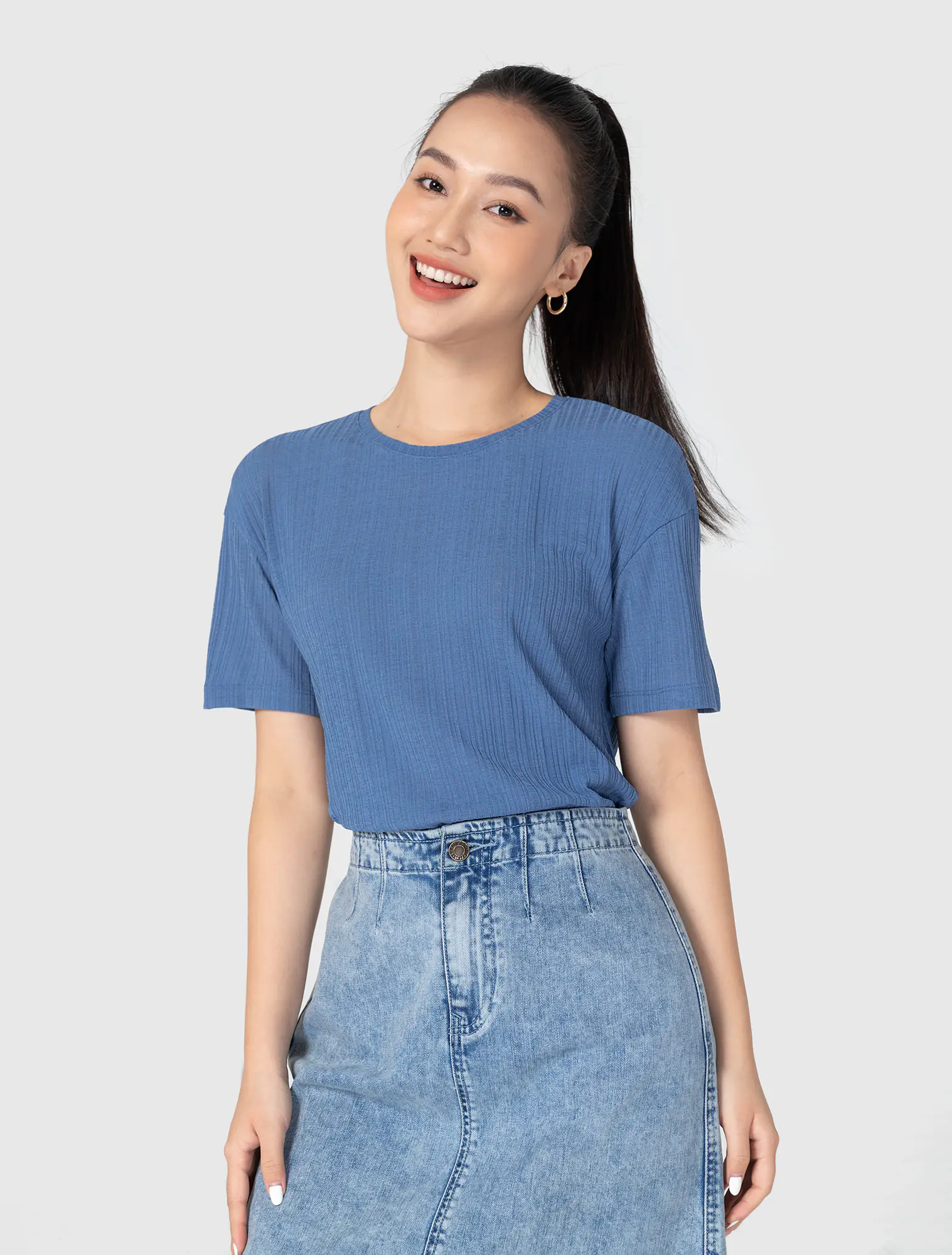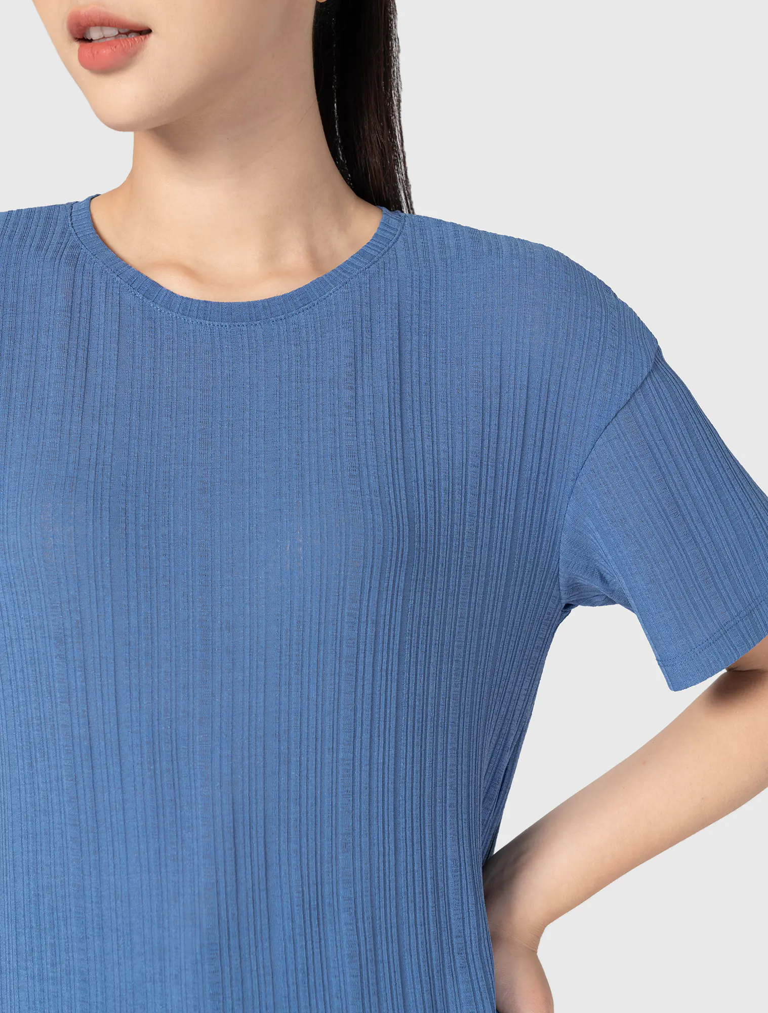 Dáng regular, cổ tròn, tay cộc, xẻ vạt áo.