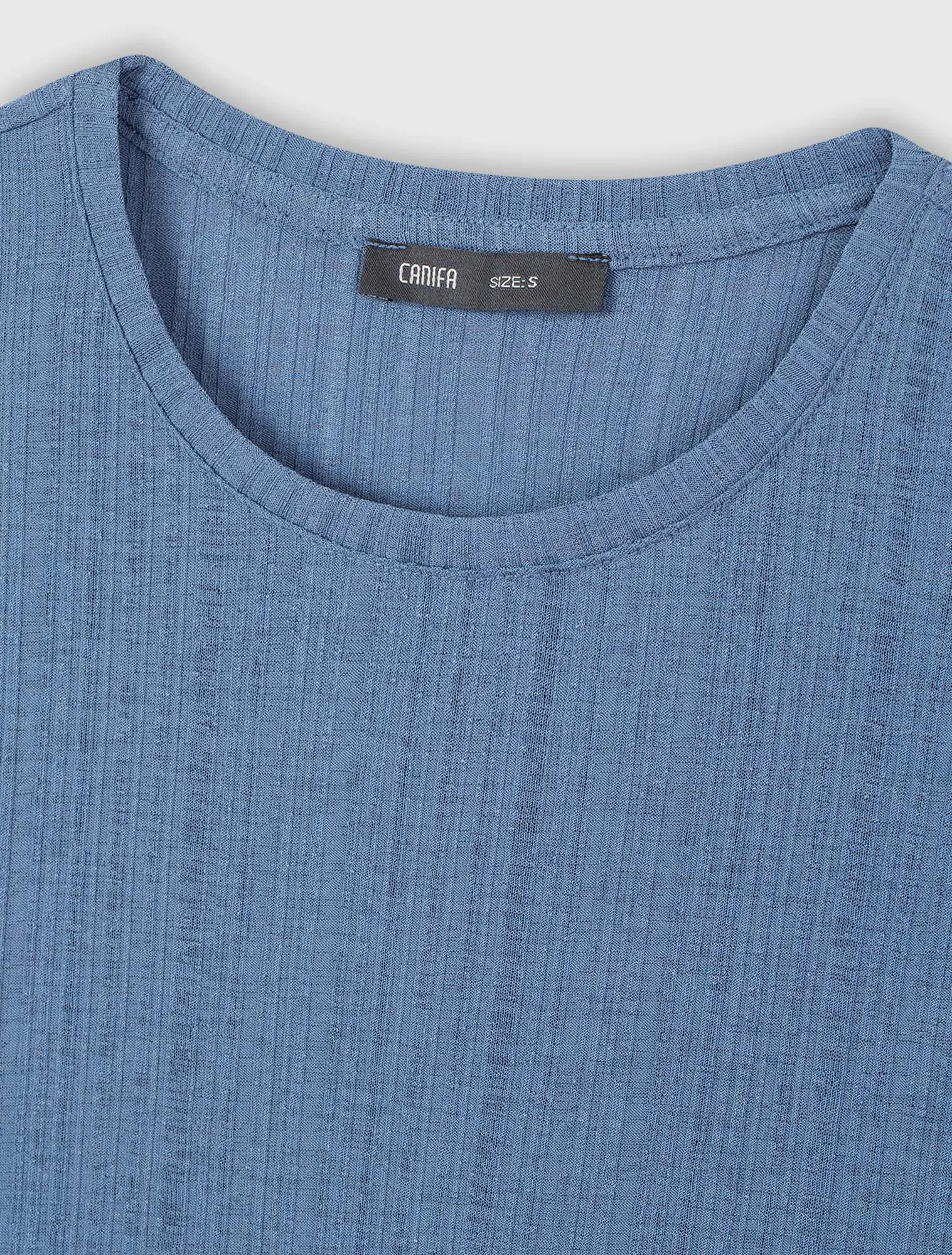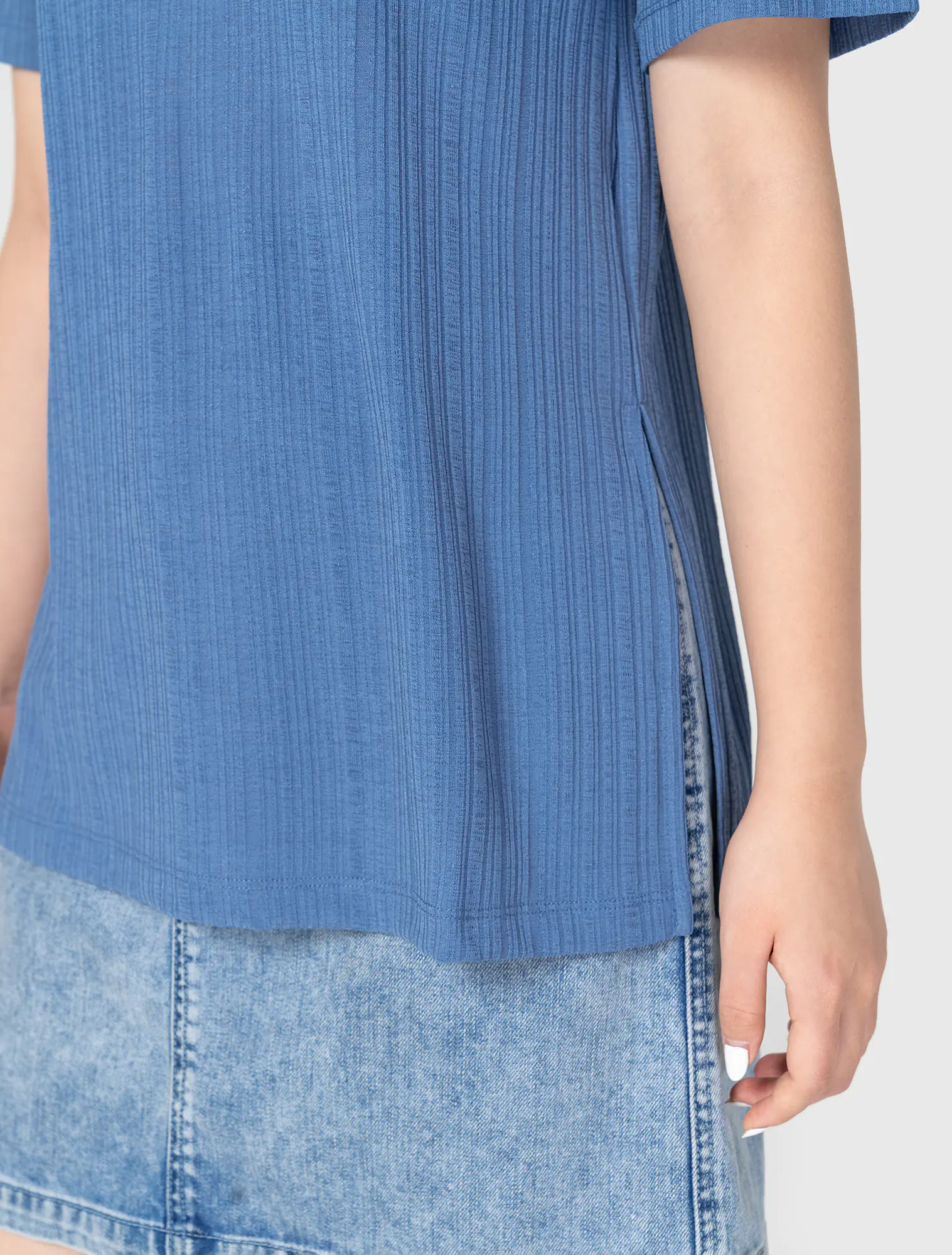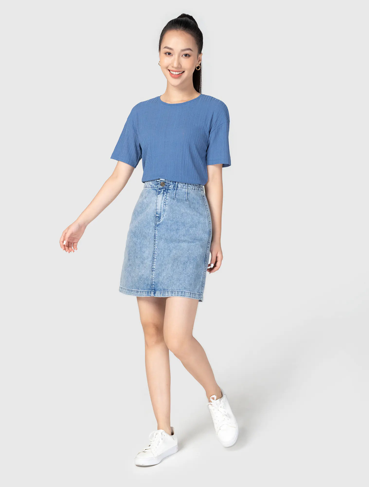 Dáng regular, cổ tròn, tay cộc, xẻ vạt áo.