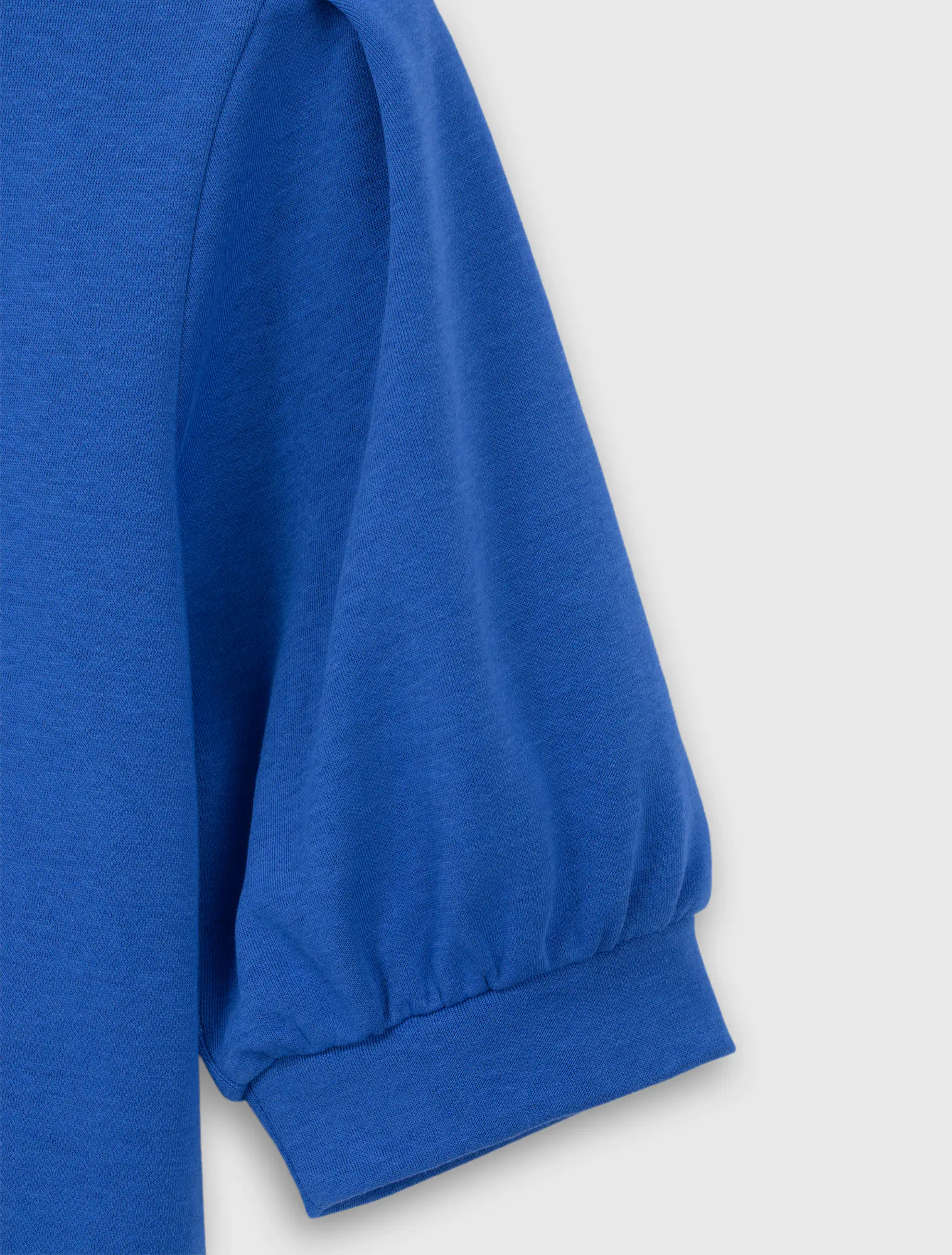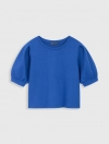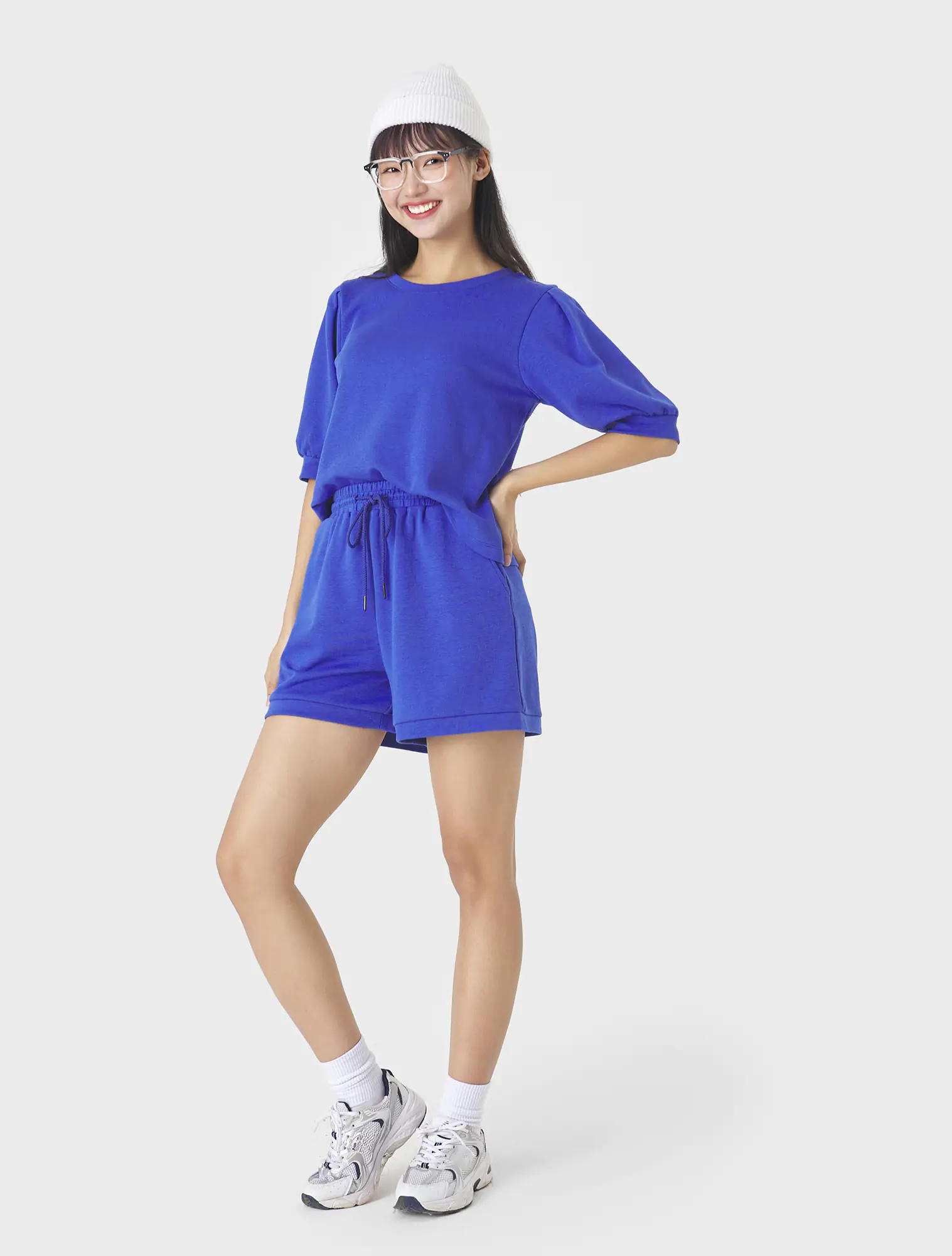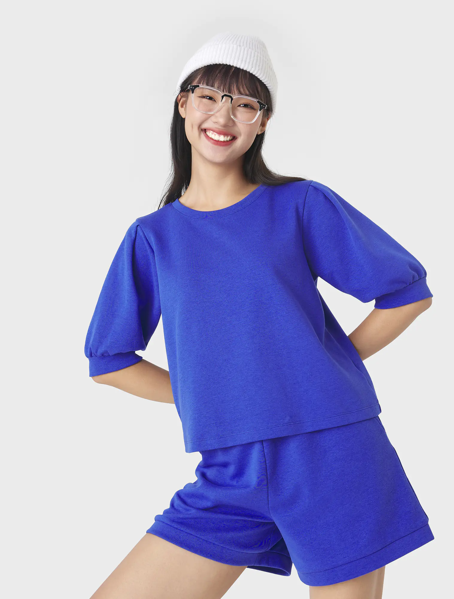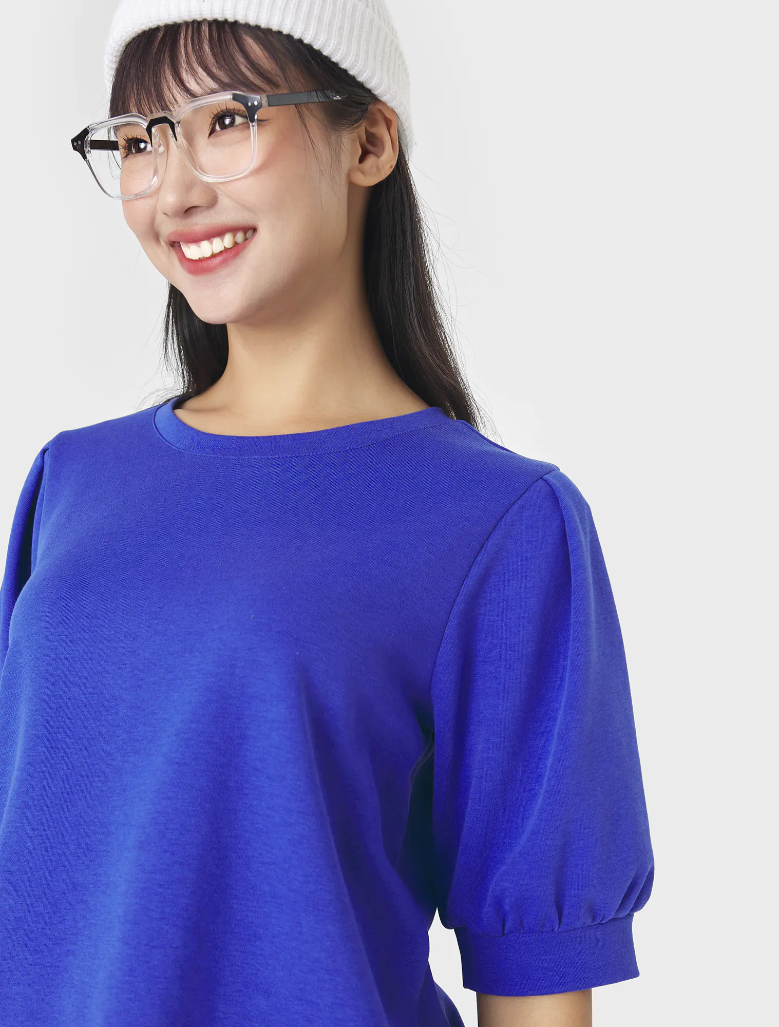 Áo cộc tay cổ tròn dáng ngắn, dáng vừa vặn, phần tay áo xếp ly tạo độ bồng vừa phải, mang lại sự nữ tính nhẹ nhàng cho người mặc, chất liệu interlock dầy dặn, thoải mái, dễ chịu cho người mặc, phù hợp với đi chơi,đi làm, thời tiết mùa thu, mùa xuân.