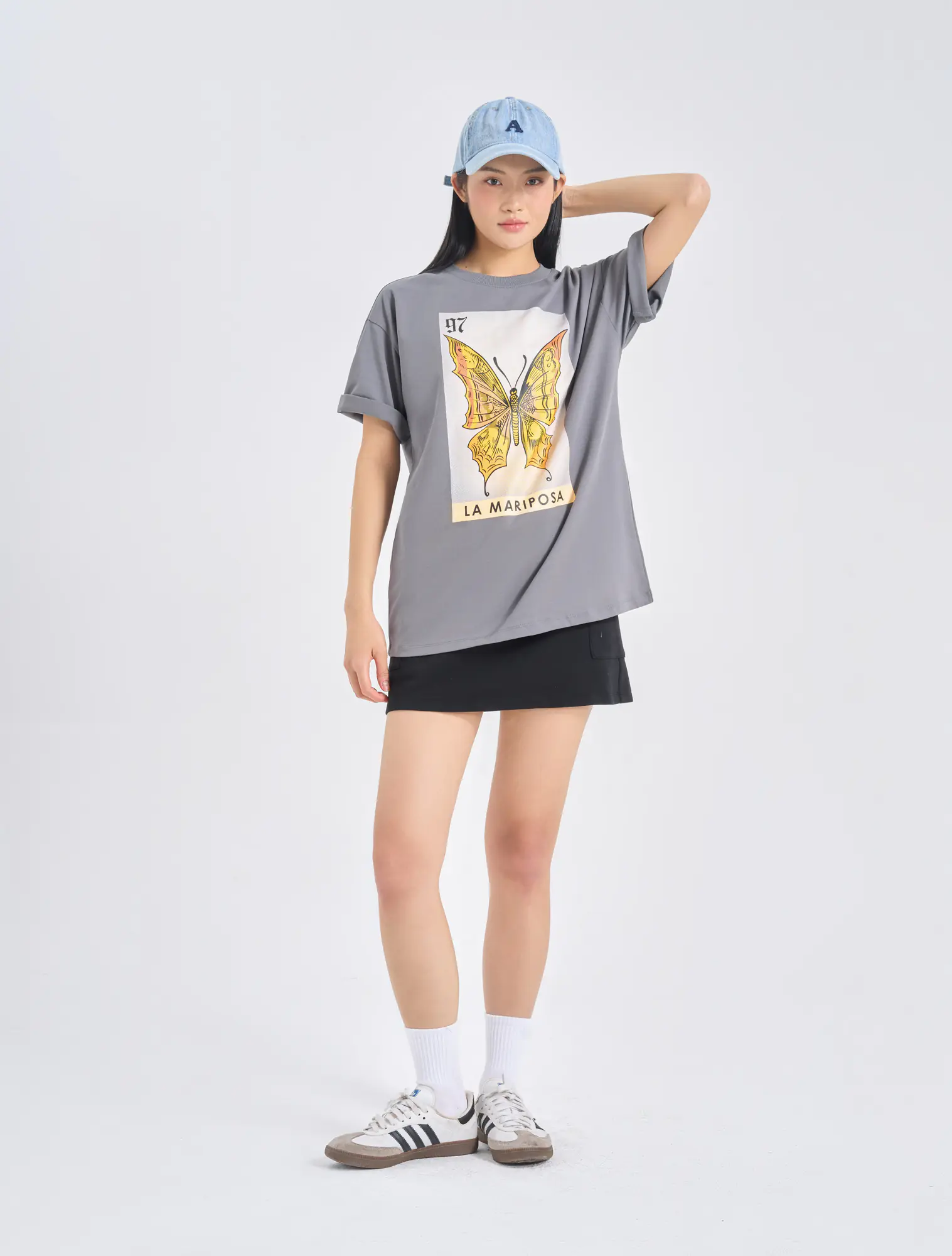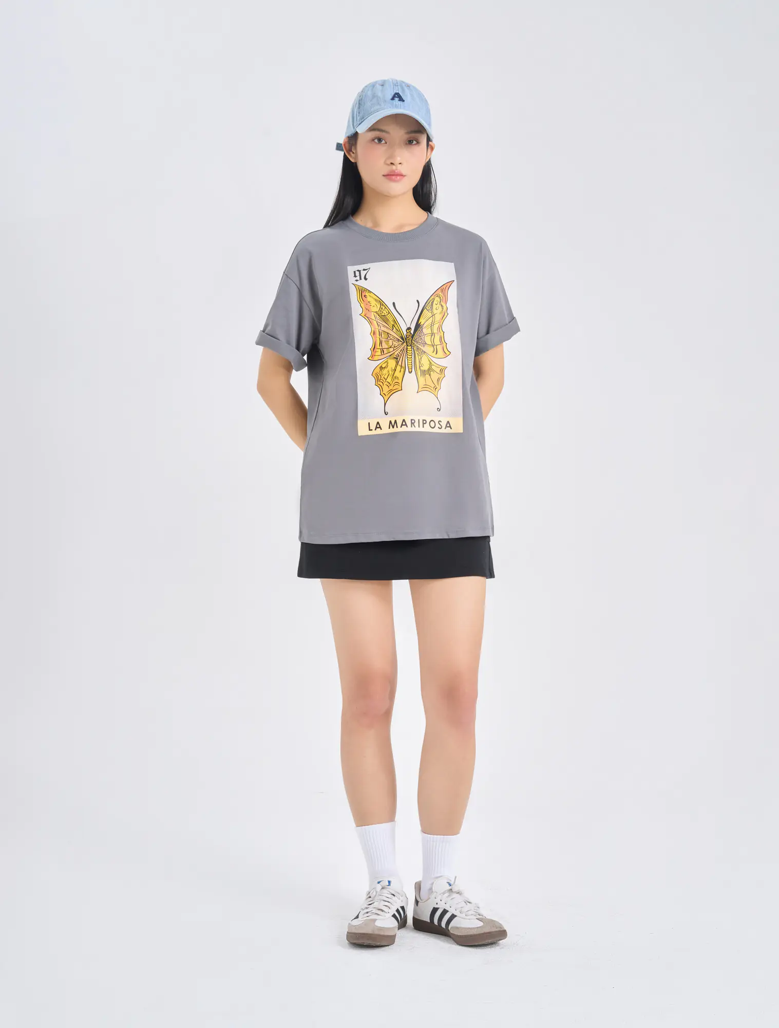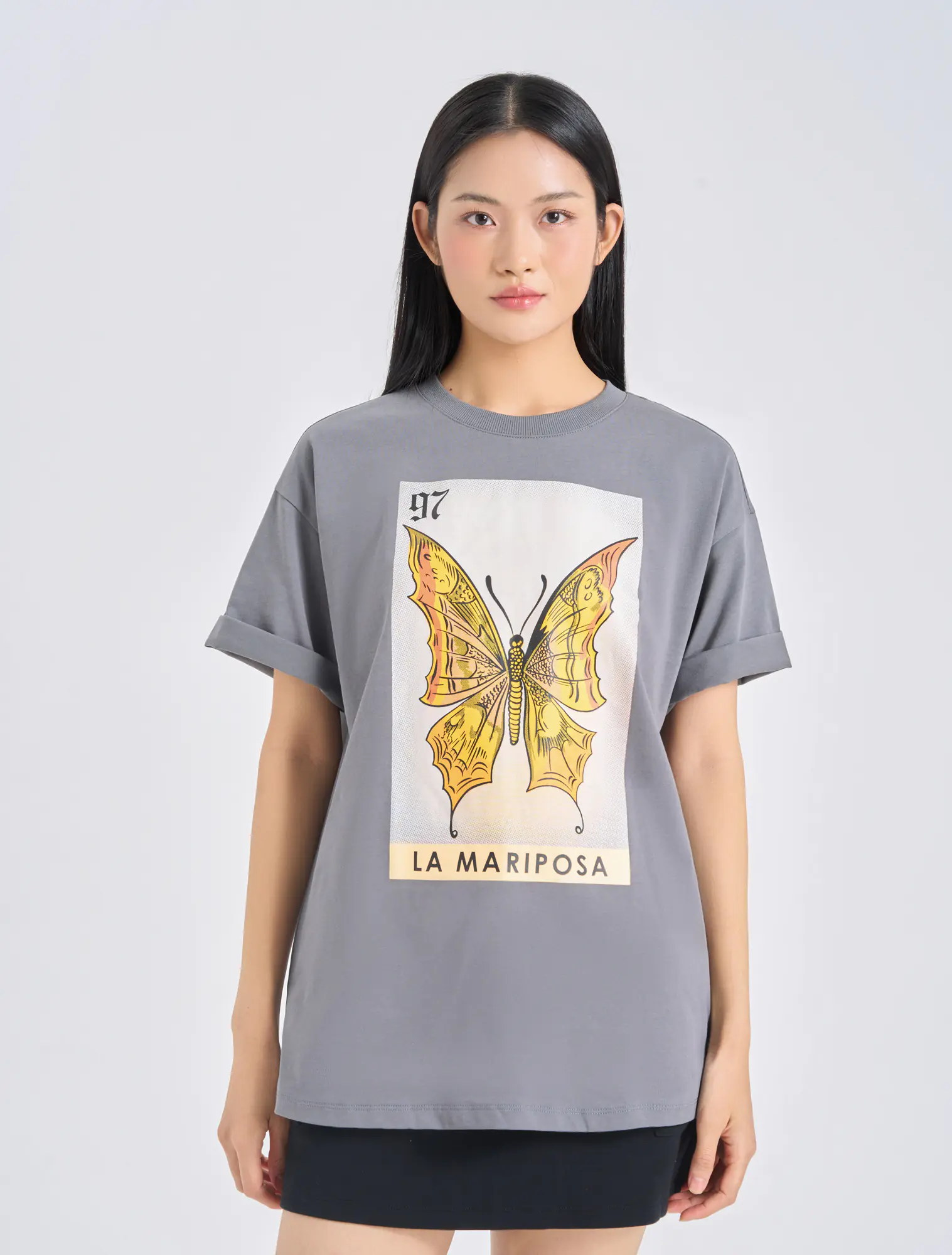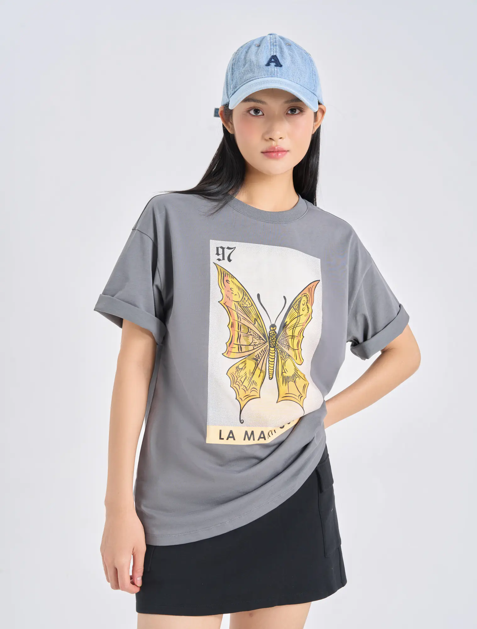Áo t-shirt nữ dáng oversize với chất liệu cotton dày dặn thoáng mát và đồ họa ấn tượng nổi bật.