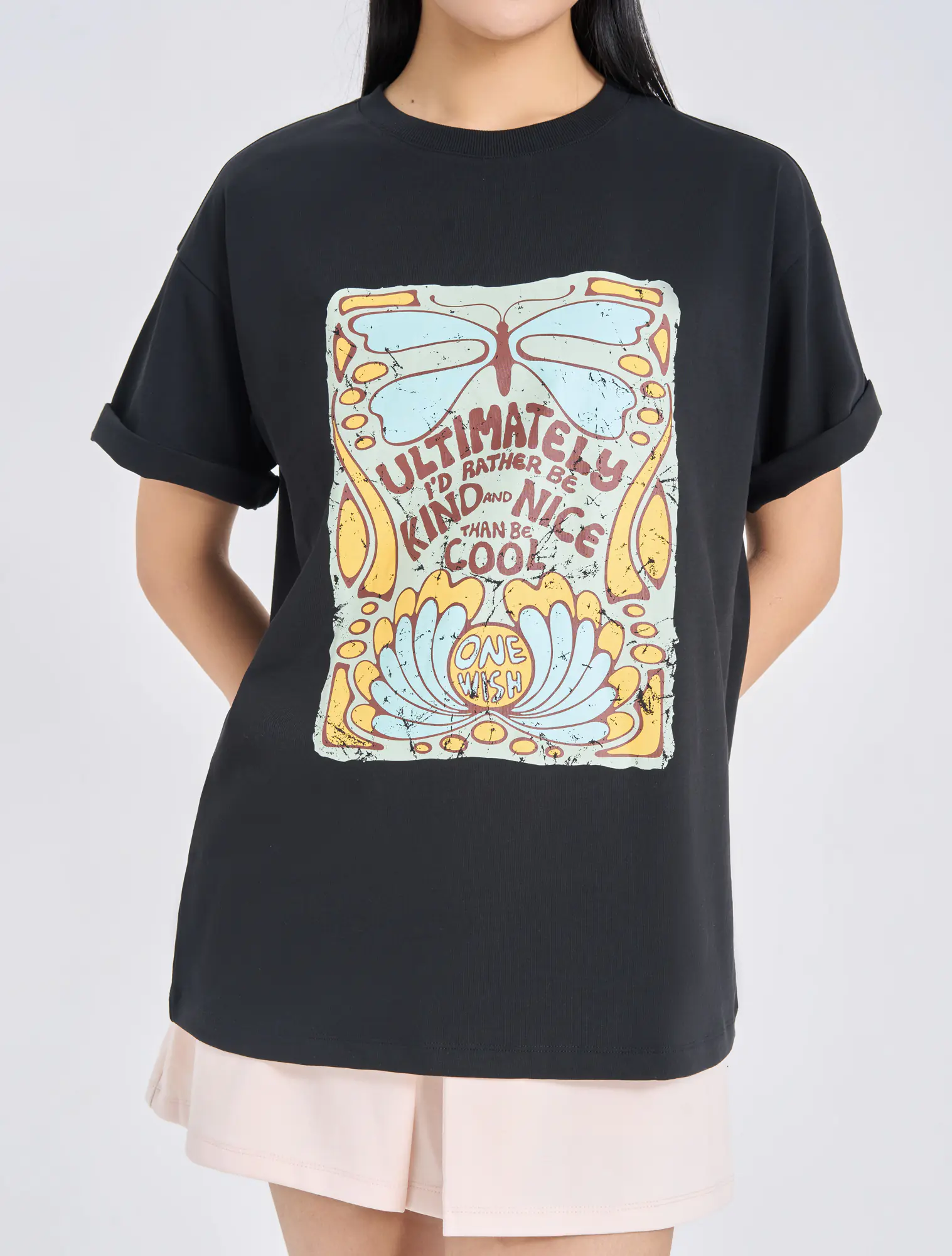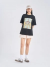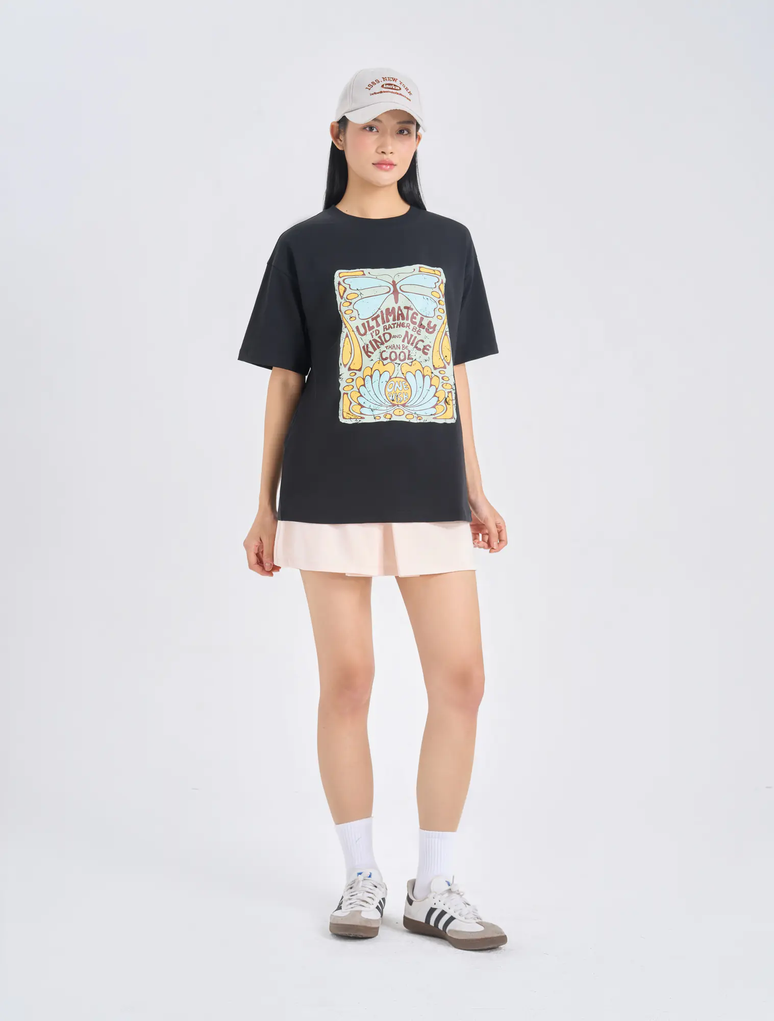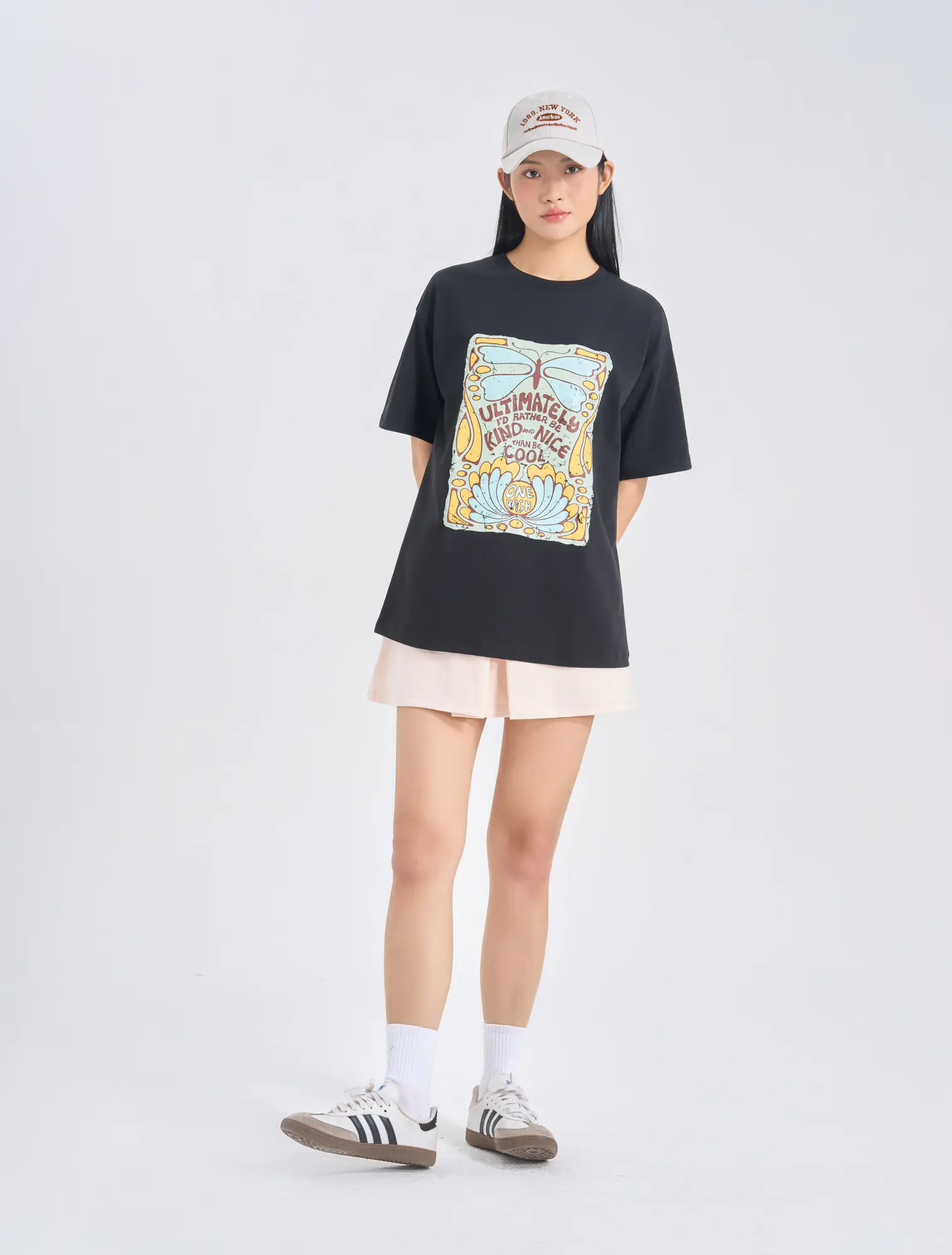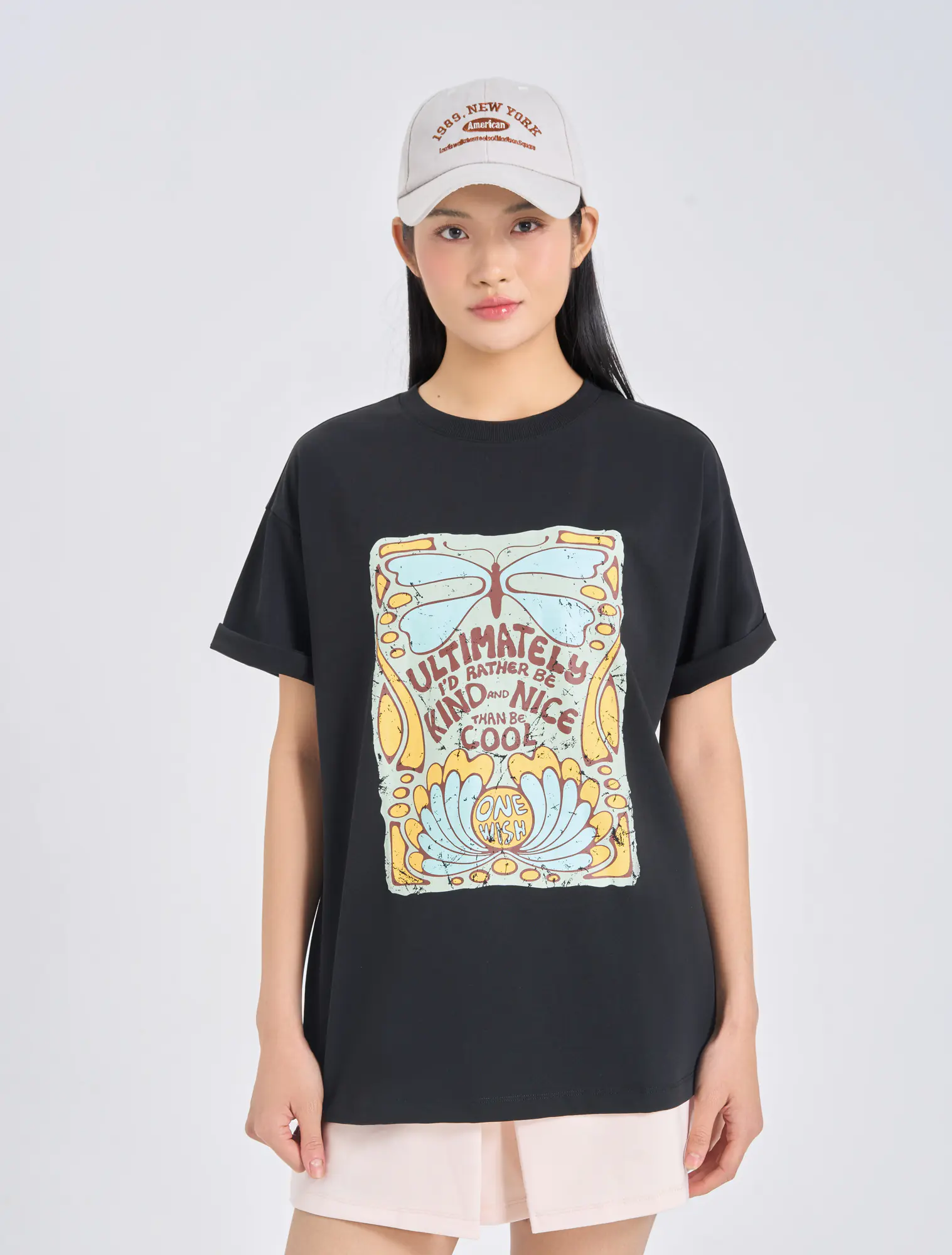 Áo t-shirt nữ dáng oversize với chất liệu cotton dày dặn thoáng mát và đồ họa ấn tượng nổi bật.