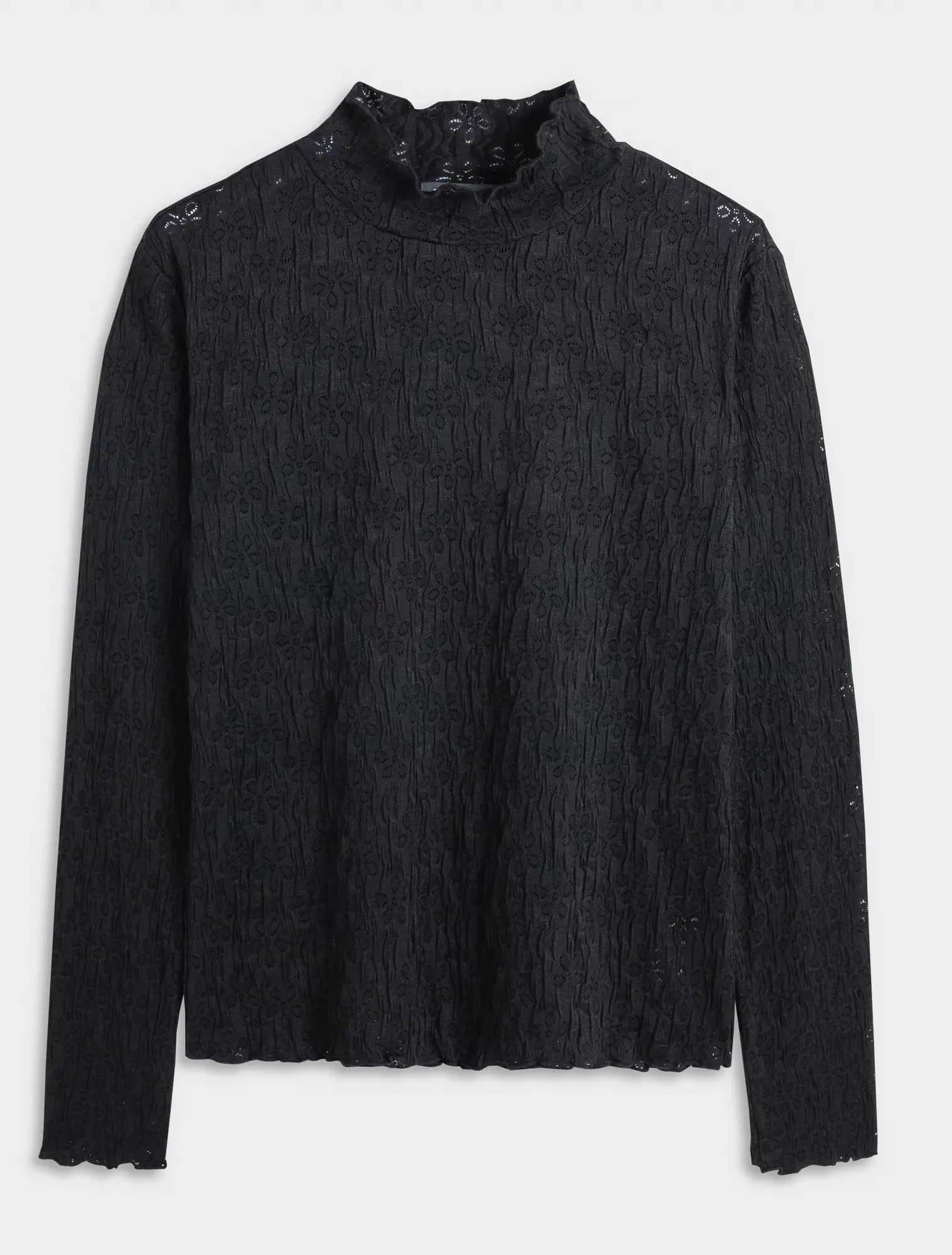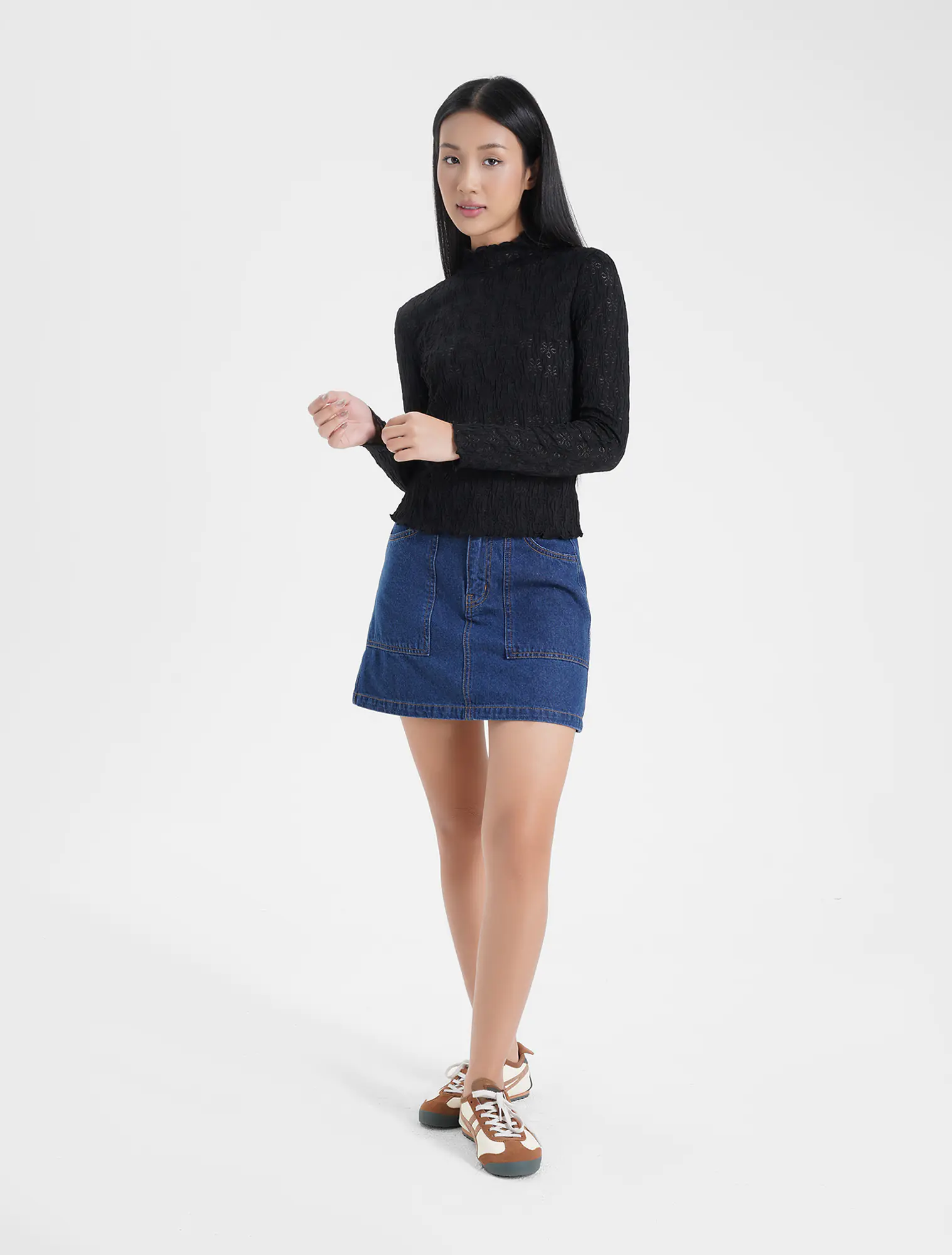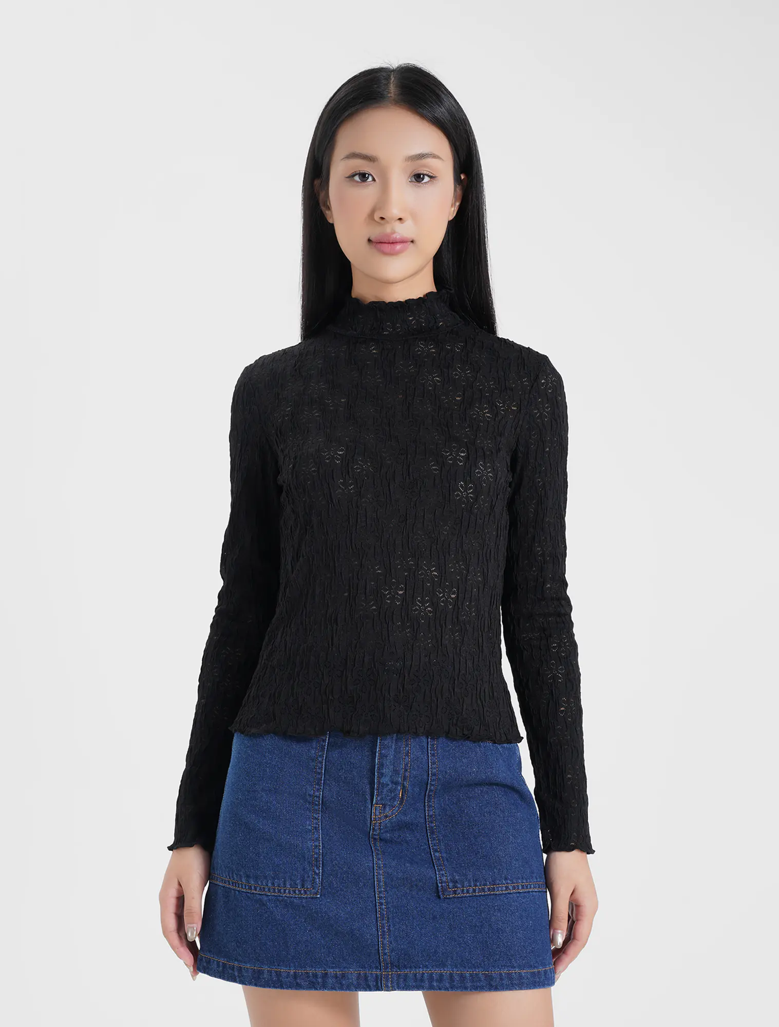 Áo t-shirt nữ cổ cao dáng ôm, điểm nhấn là bề mặt vải dệt hoa chìm và độ xốp của vải tạo nên 1 sản phẩm tinh tế và rất dễ kết hợp với nhiều loại trang phục.