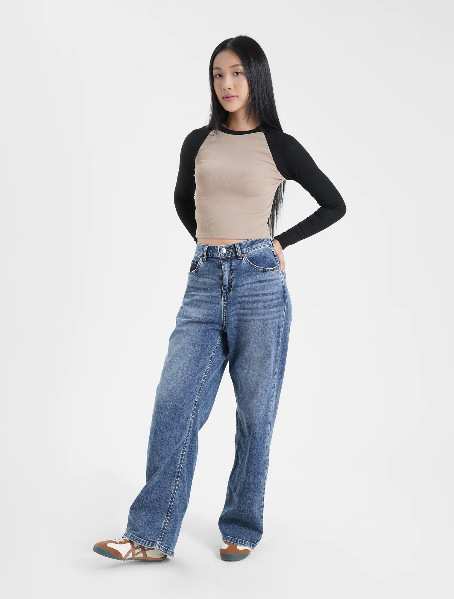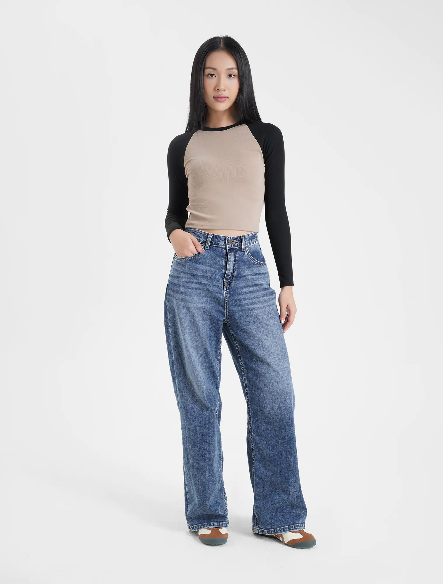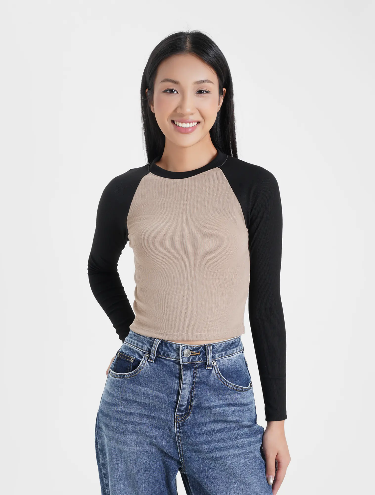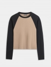 Áo t-shirt nữ dài tay vai raglan phối màu. Sản phẩm kết hợp màu sắc trẻ trung và nổi bật, cùng với dáng áo crop ôm sát tạo sự trẻ trung và năng động.