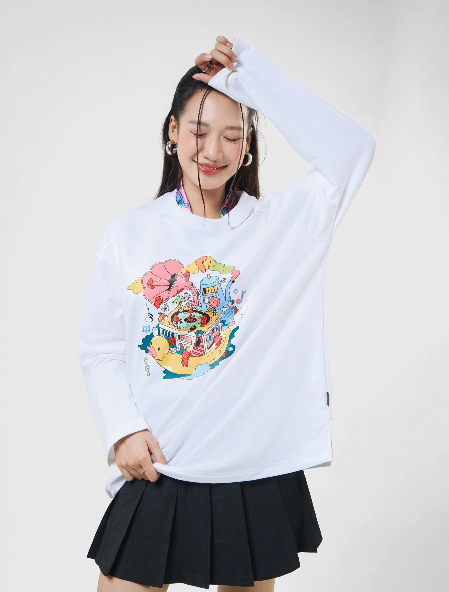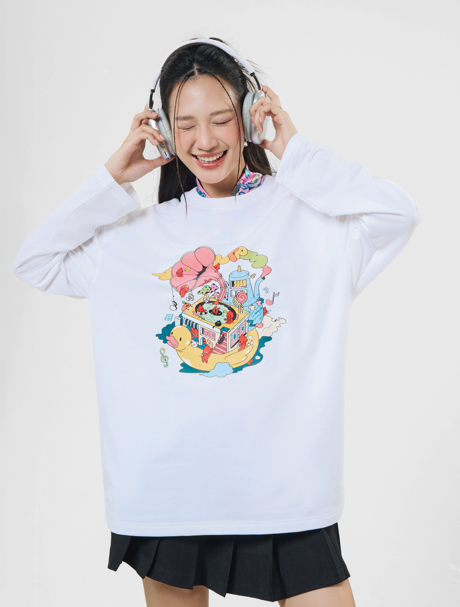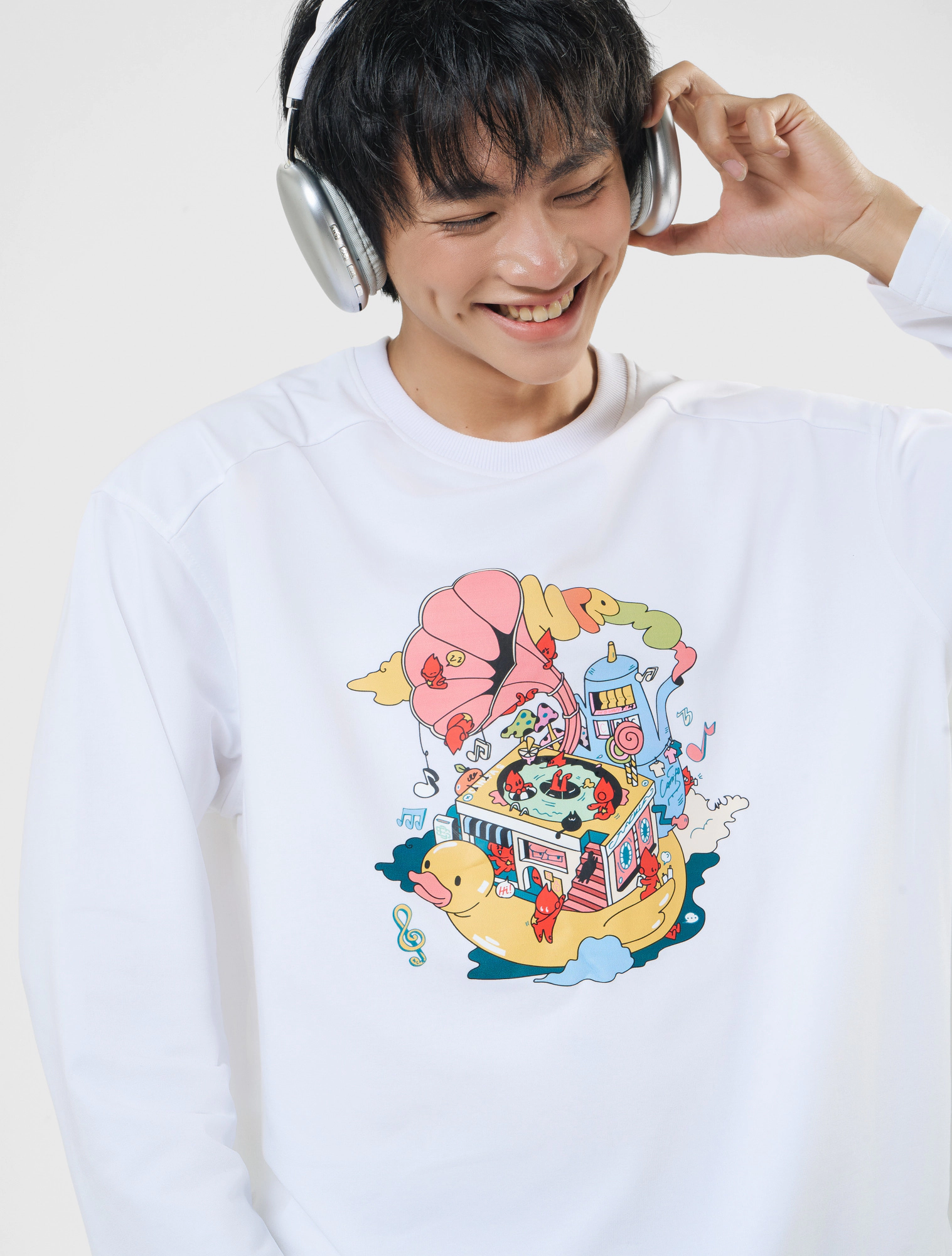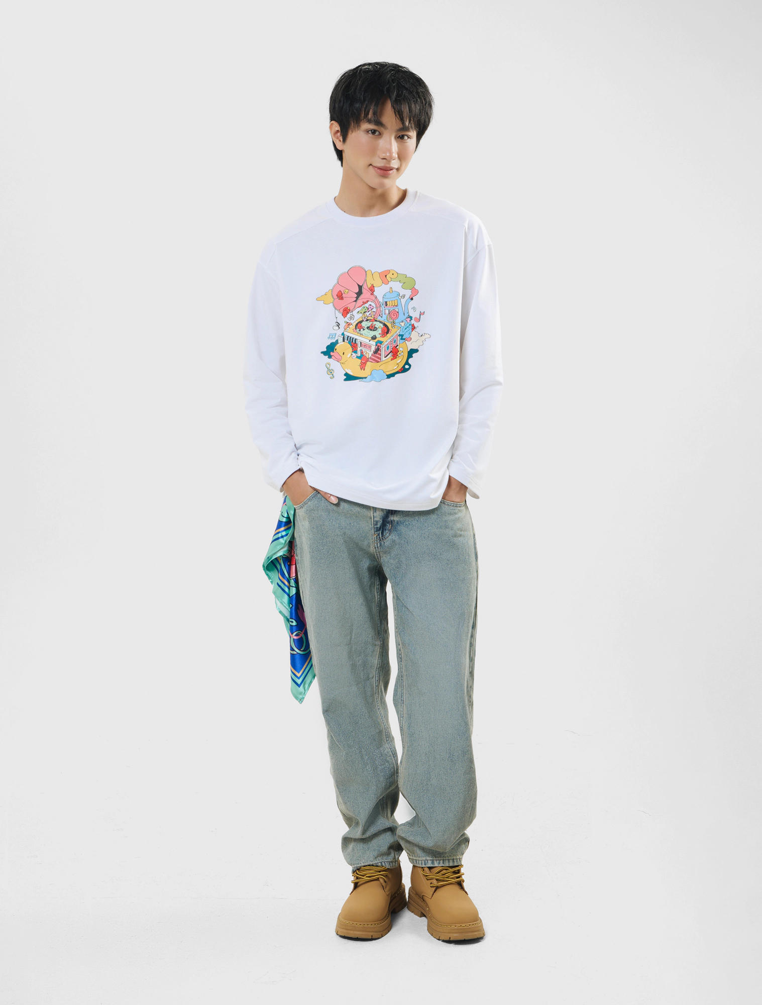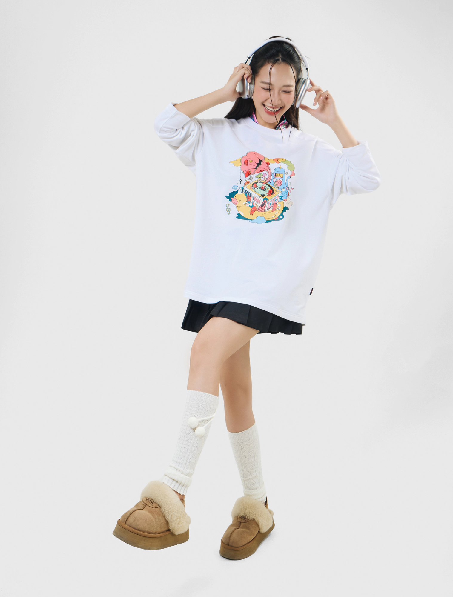 Áo phông dài tay với artwork thành phố mơ màng trôi giữa mây và sóng nhạc, kết hợp bảng màu tươi sáng mang hơi thở pop-art, tạo nên thiết kế trẻ trung, phóng khoáng cho những tâm hồn yêu tự do giữa nhịp sống đô thị.