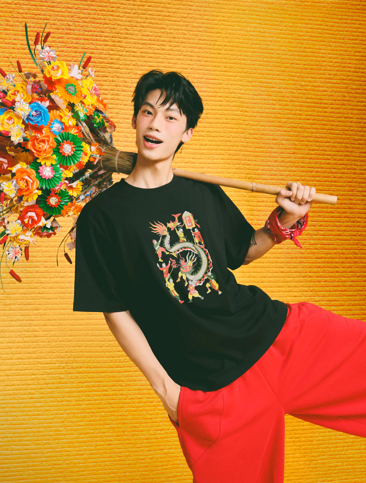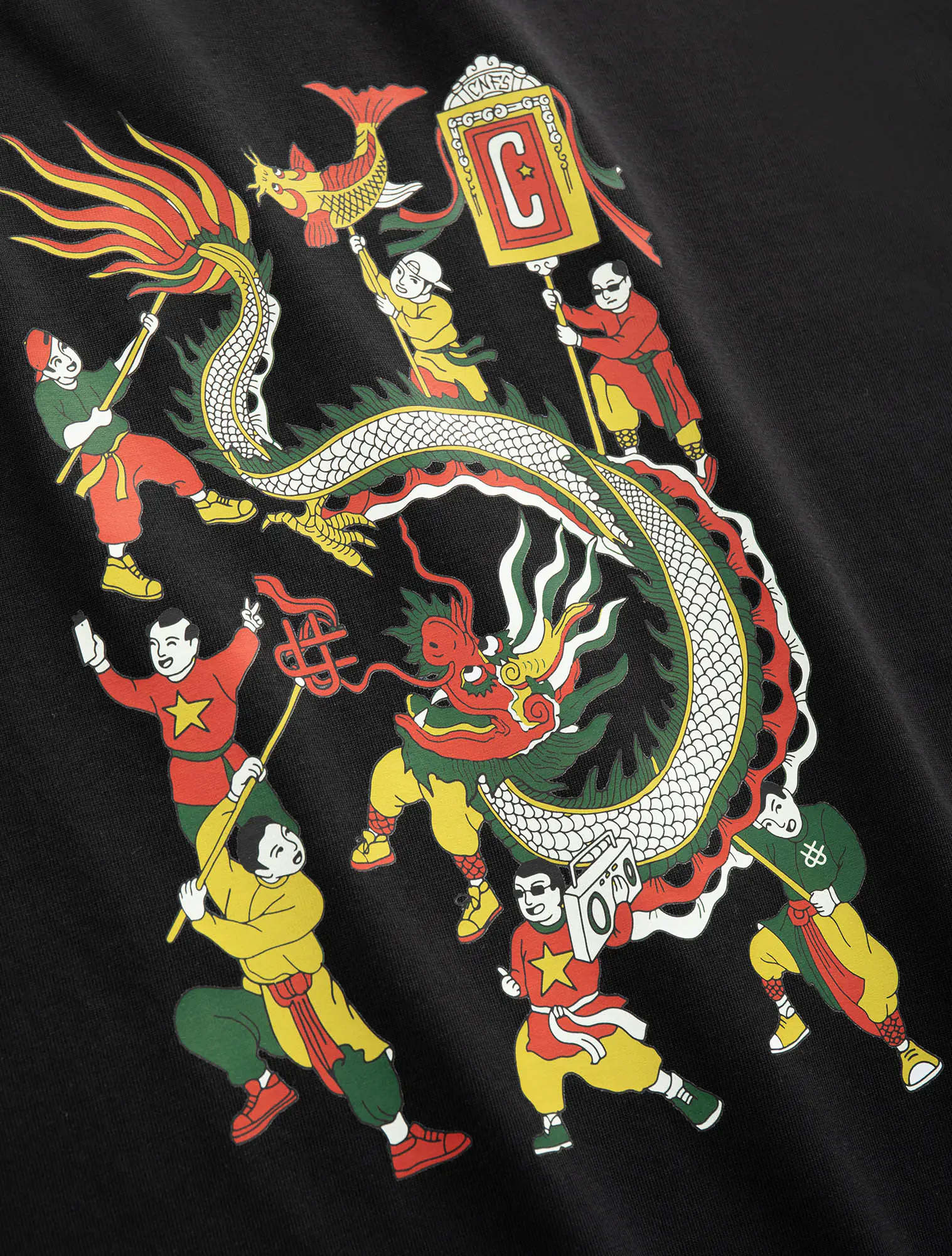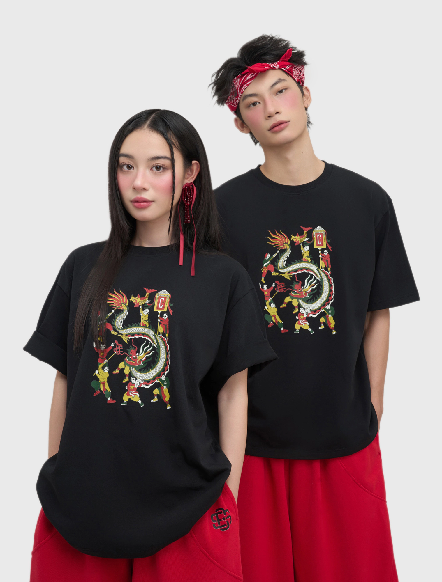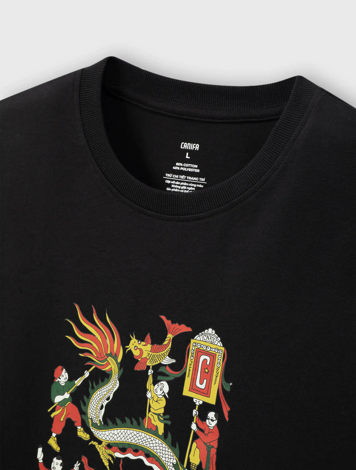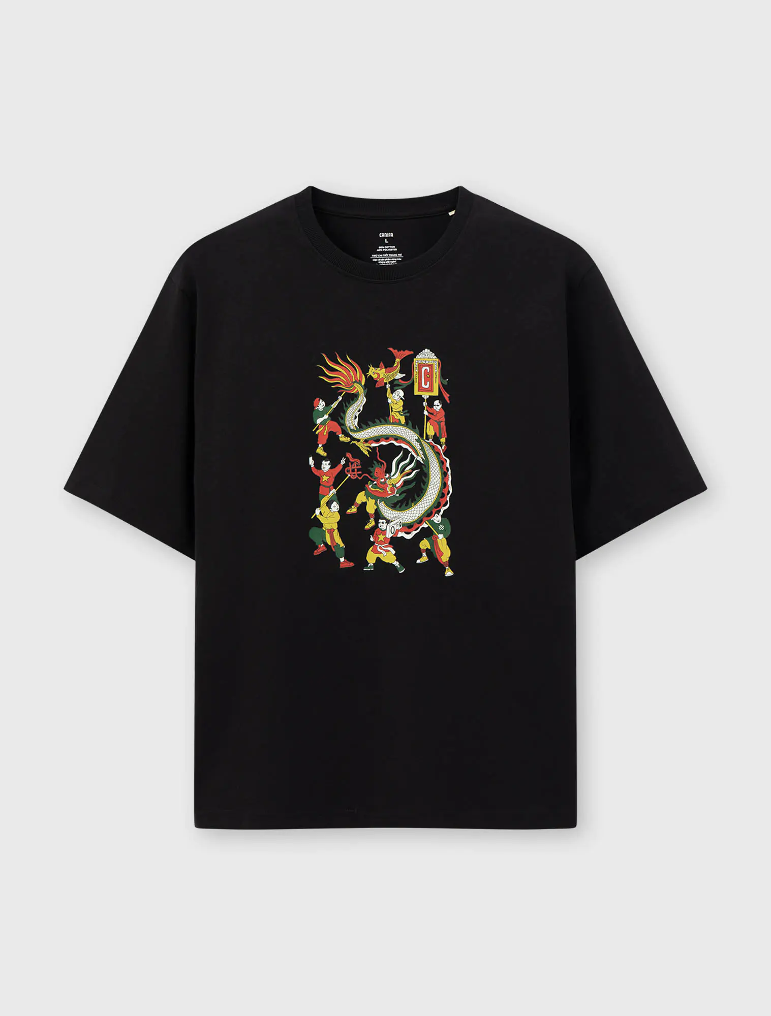 Hình ảnh múa rồng rực rỡ trong hội làng xưa – biểu tượng của sự thịnh vượng, gắn kết cộng đồng và tinh thần dân tộc – được đưa vào thiết kế với các điểm nhấn hiện đại, trẻ trung. Từng đường nét uốn lượn của thân rồng, từng gam màu lễ hội đều mang theo âm hưởng văn hóa dân gian Bắc Bộ, được “kể lại” trên chất liệu áo phông gần gũi, năng động.