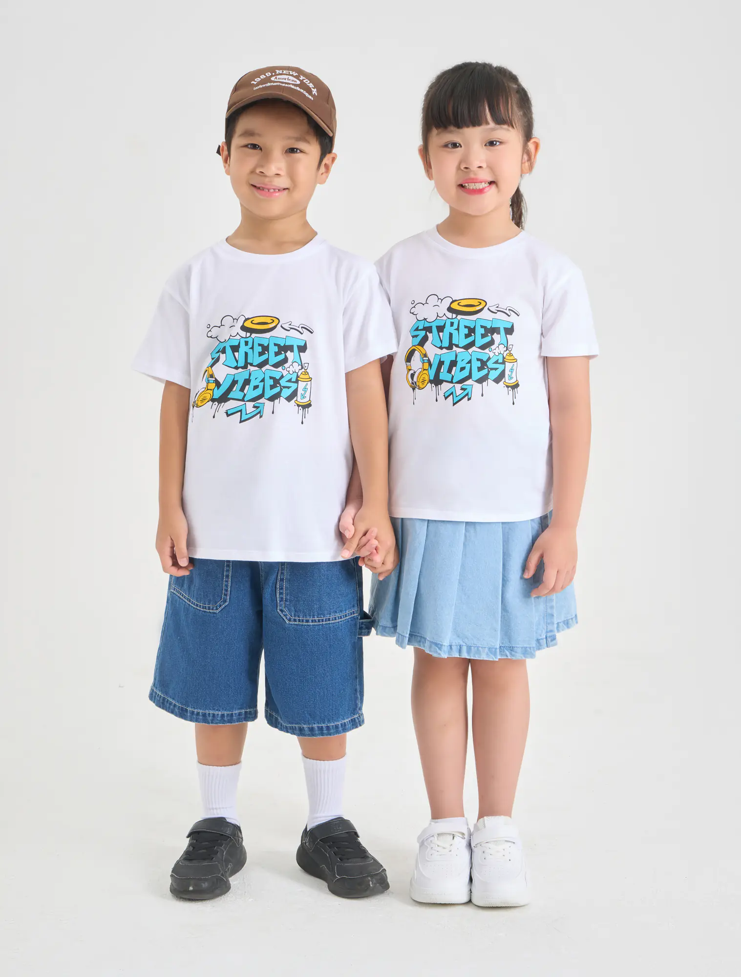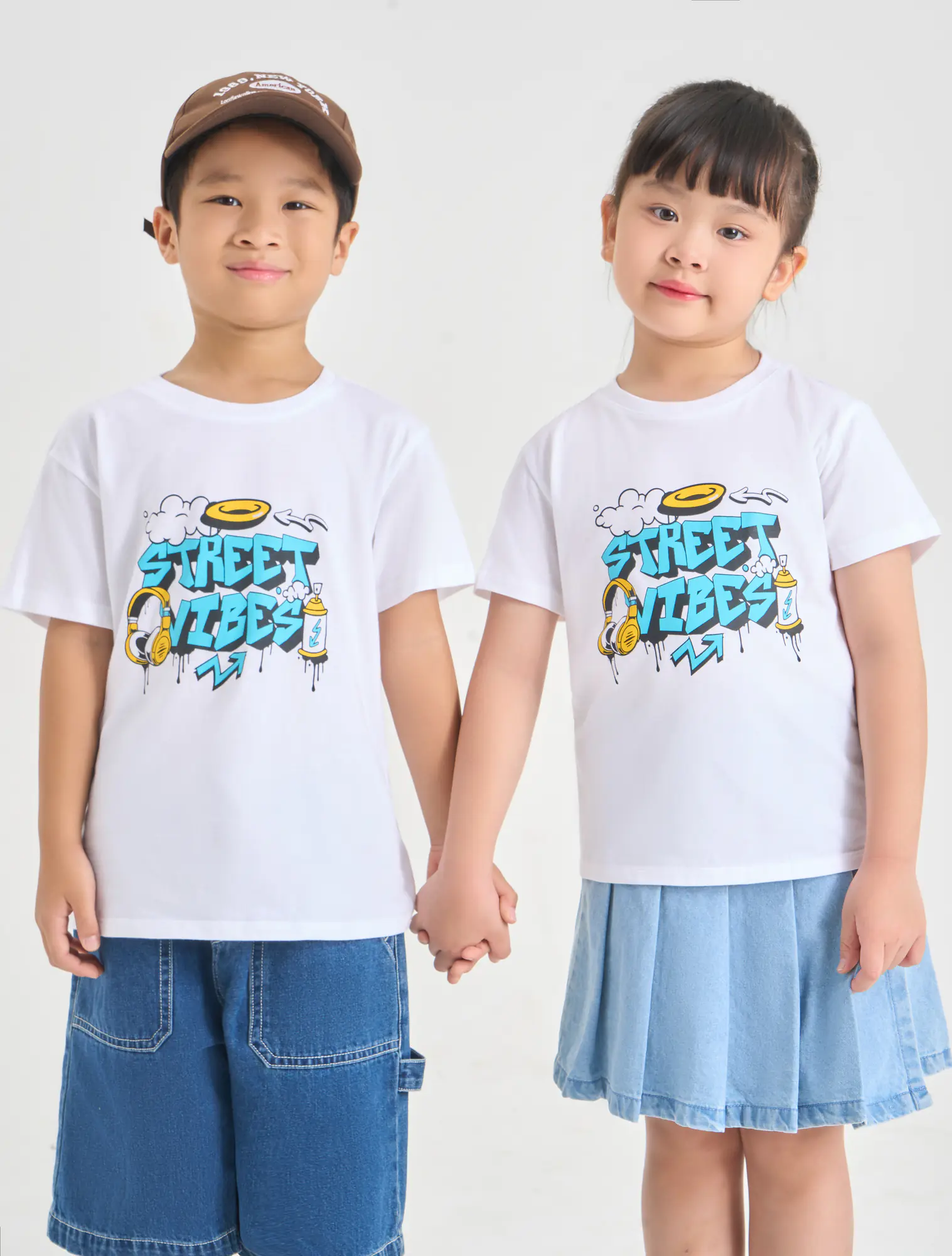 Áo phông unisex trẻ em cotton có hình in, chất liệu cotton thoáng mát. Màu sắc tươi sáng, phù hợp cho cả bé trai và bé gái