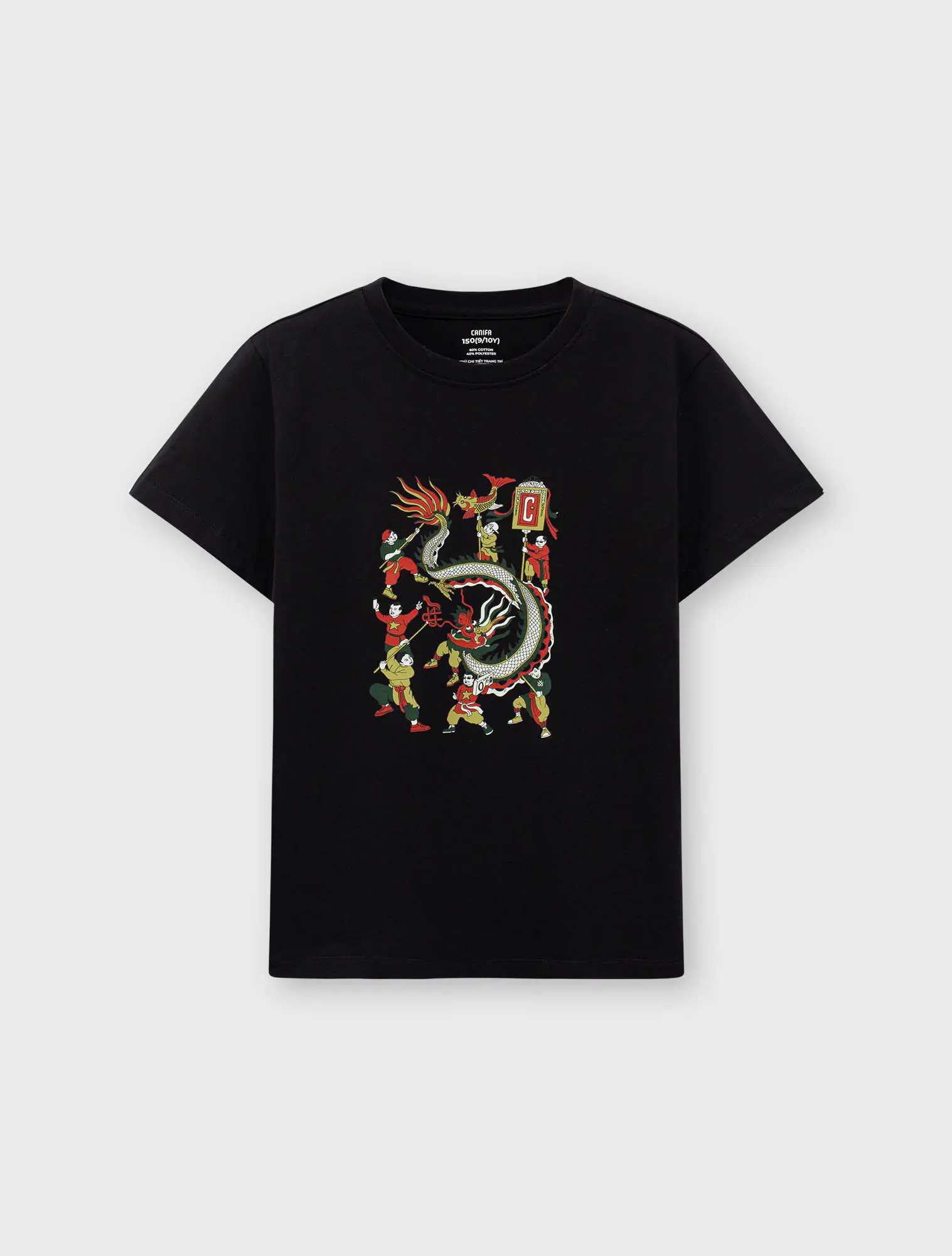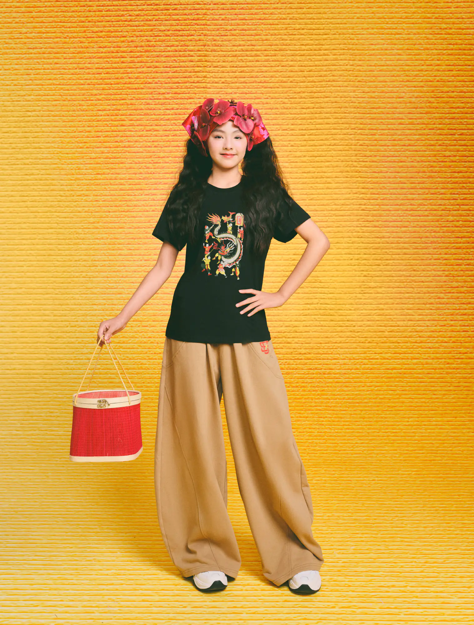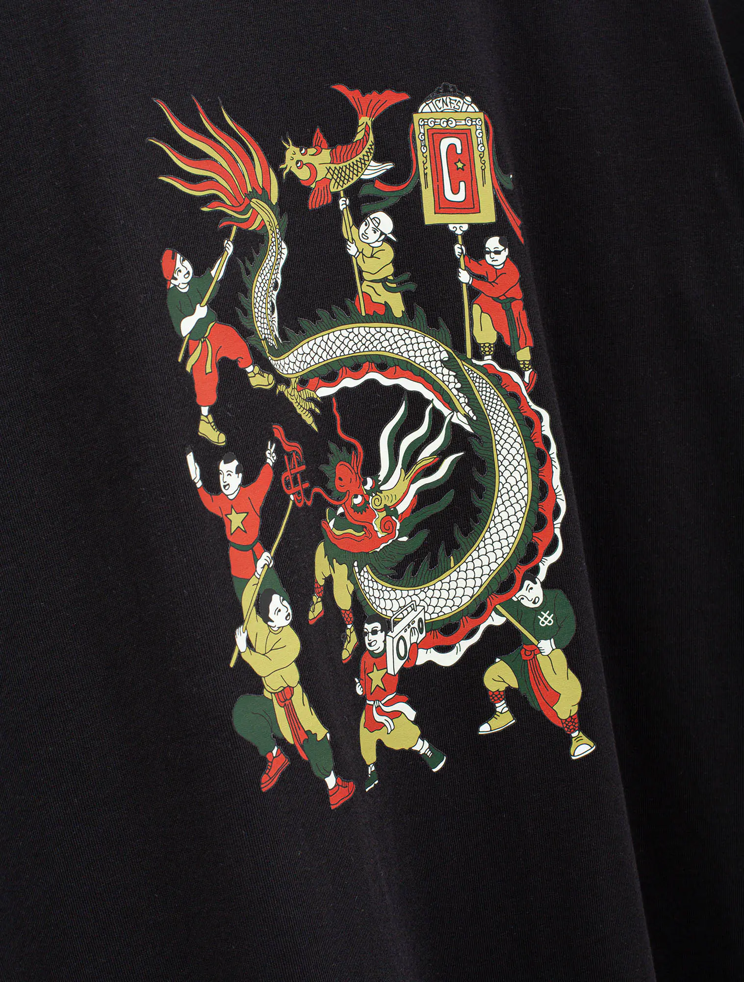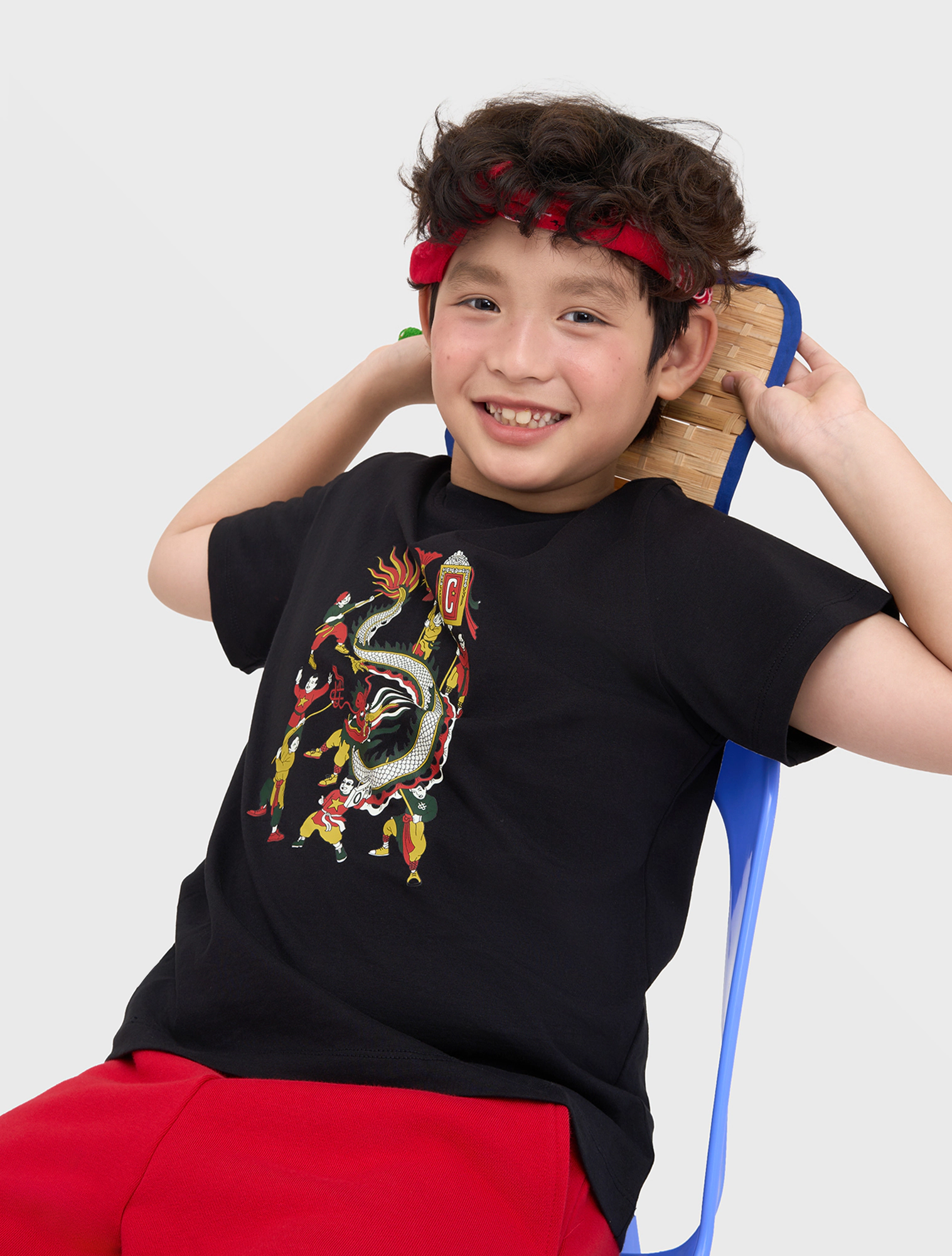 Hình ảnh múa rồng rực rỡ trong hội làng xưa – biểu tượng của sự thịnh vượng, gắn kết cộng đồng và tinh thần dân tộc – được đưa vào thiết kế với các điểm nhấn hiện đại, trẻ trung. Từng đường nét uốn lượn của thân rồng, từng gam màu lễ hội đều mang theo âm hưởng văn hóa dân gian Bắc Bộ, được “kể lại” trên chất liệu áo phông gần gũi, năng động.