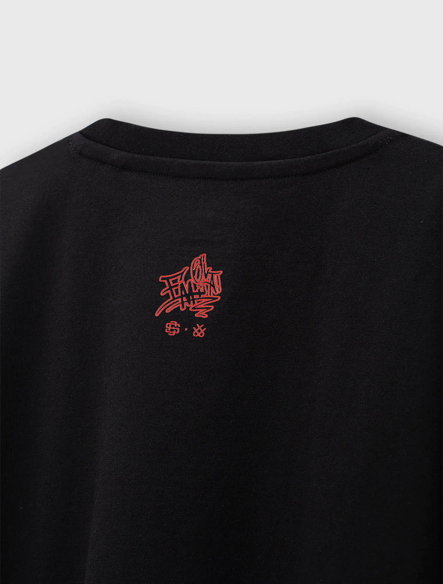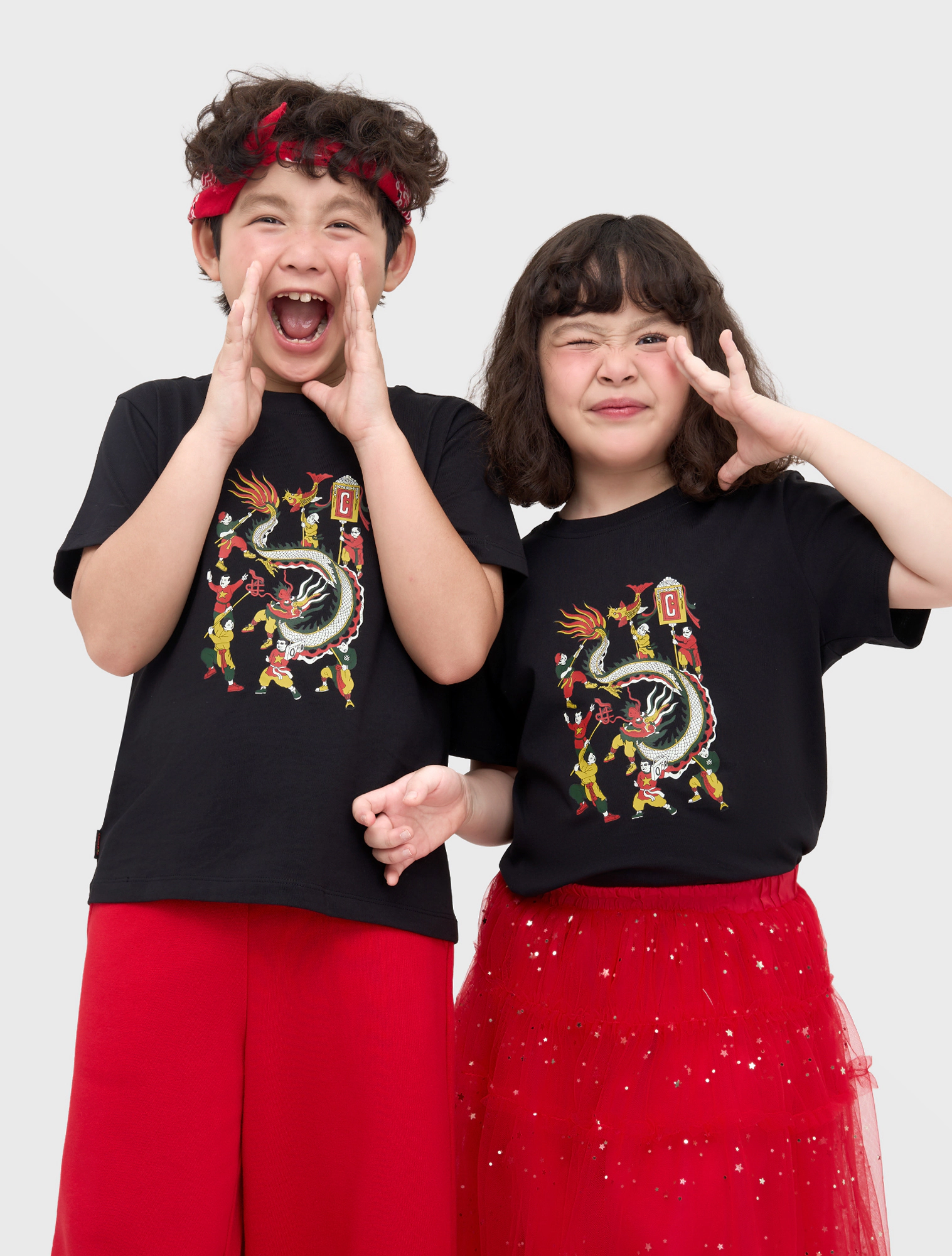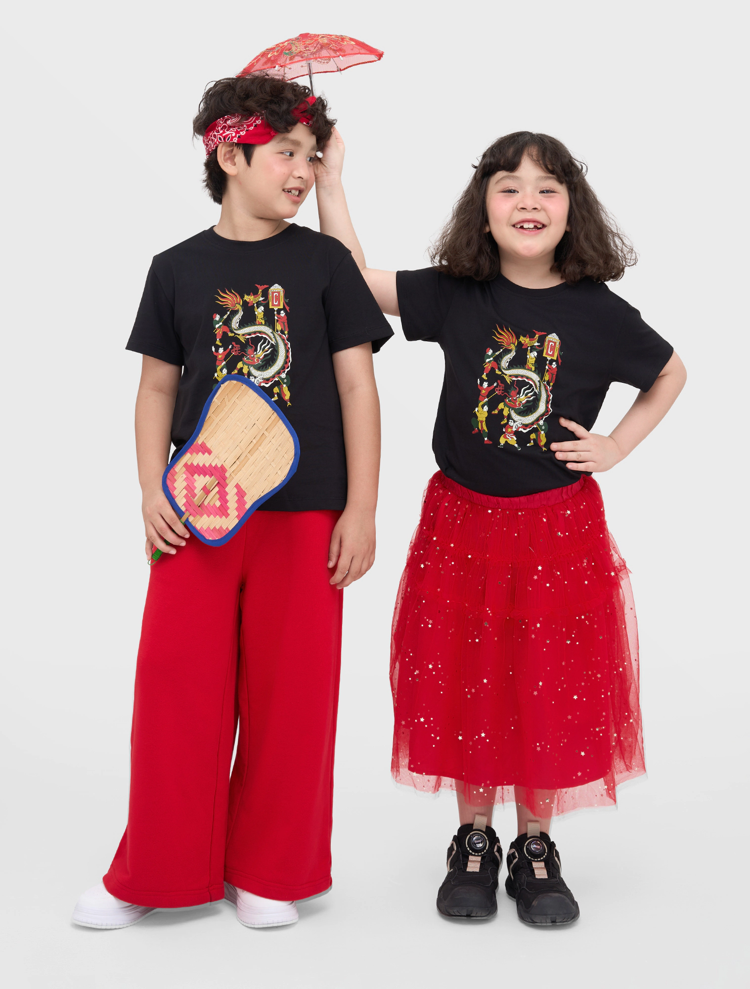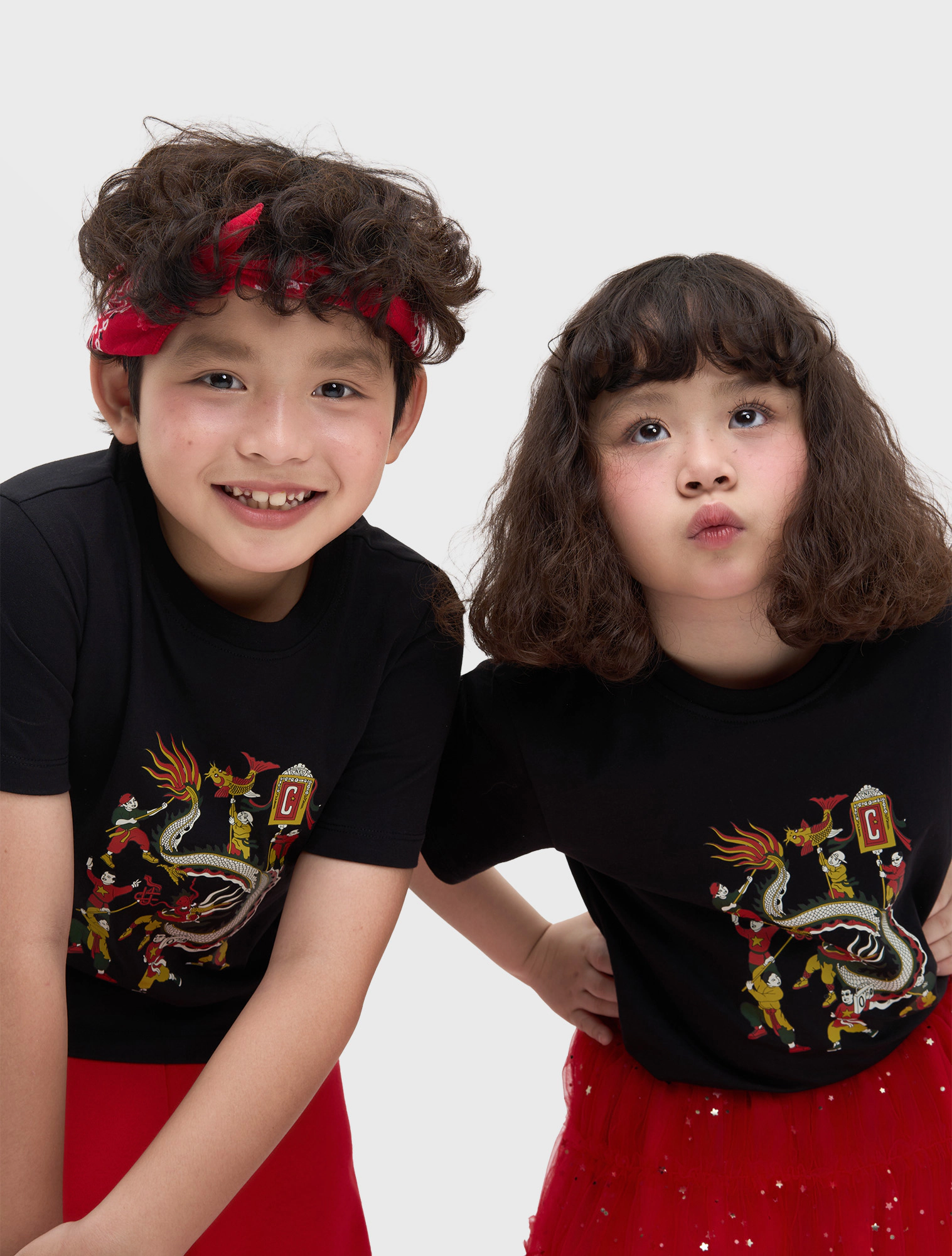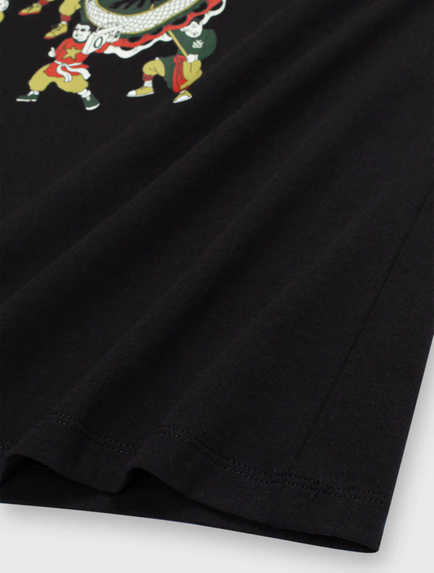 Hình ảnh múa rồng rực rỡ trong hội làng xưa – biểu tượng của sự thịnh vượng, gắn kết cộng đồng và tinh thần dân tộc – được đưa vào thiết kế với các điểm nhấn hiện đại, trẻ trung. Từng đường nét uốn lượn của thân rồng, từng gam màu lễ hội đều mang theo âm hưởng văn hóa dân gian Bắc Bộ, được “kể lại” trên chất liệu áo phông gần gũi, năng động.