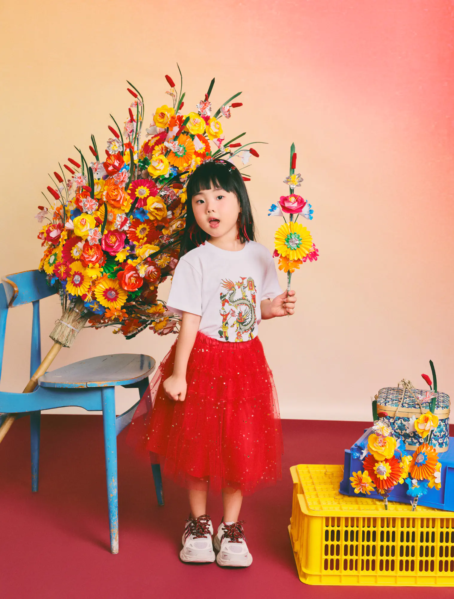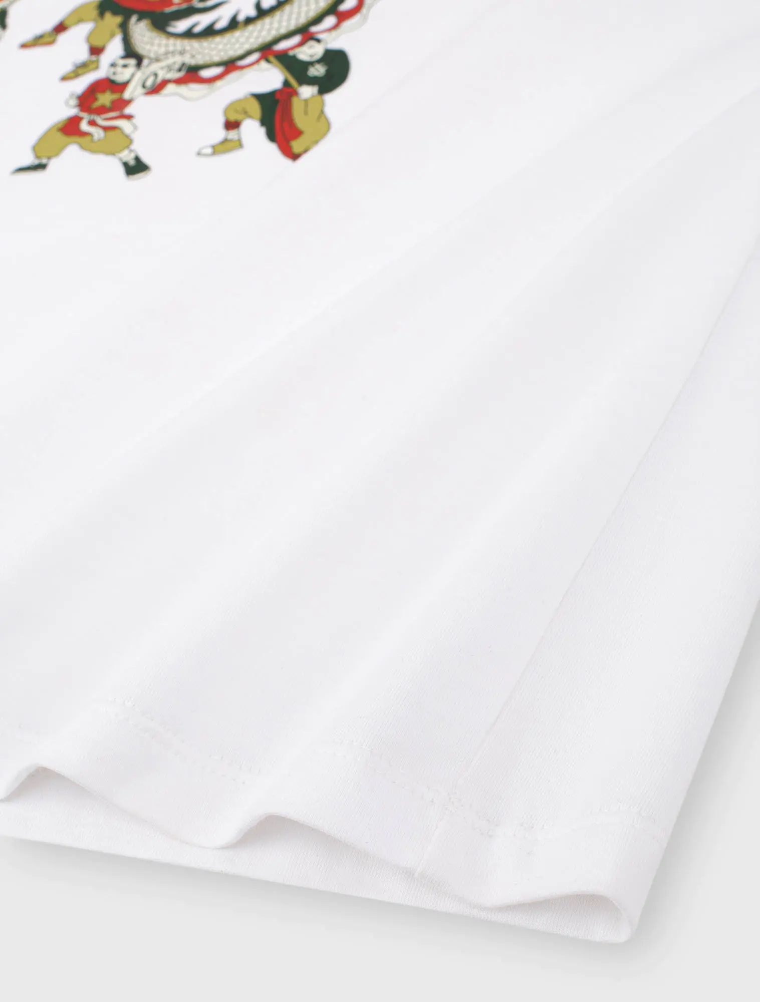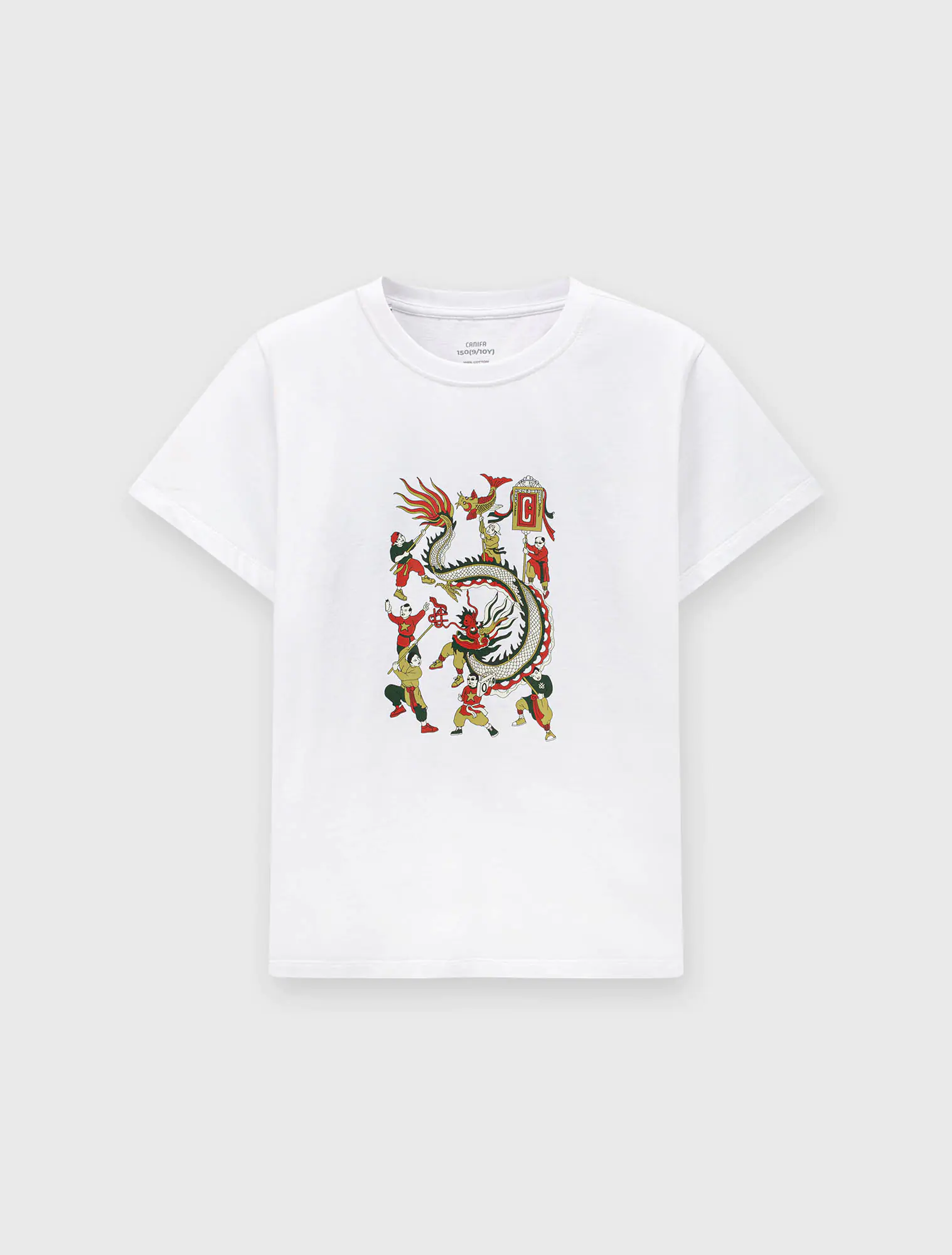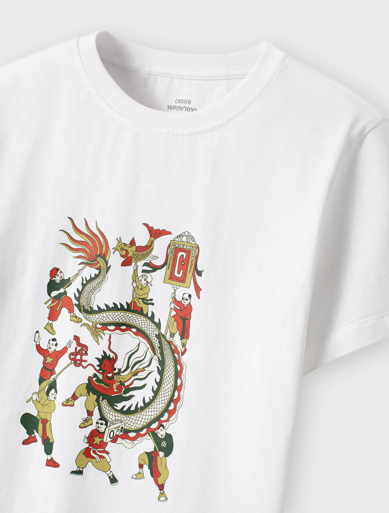 Hình ảnh múa rồng rực rỡ trong hội làng xưa – biểu tượng của sự thịnh vượng, gắn kết cộng đồng và tinh thần dân tộc – được đưa vào thiết kế với các điểm nhấn hiện đại, trẻ trung. Từng đường nét uốn lượn của thân rồng, từng gam màu lễ hội đều mang theo âm hưởng văn hóa dân gian Bắc Bộ, được “kể lại” trên chất liệu áo phông gần gũi, năng động.