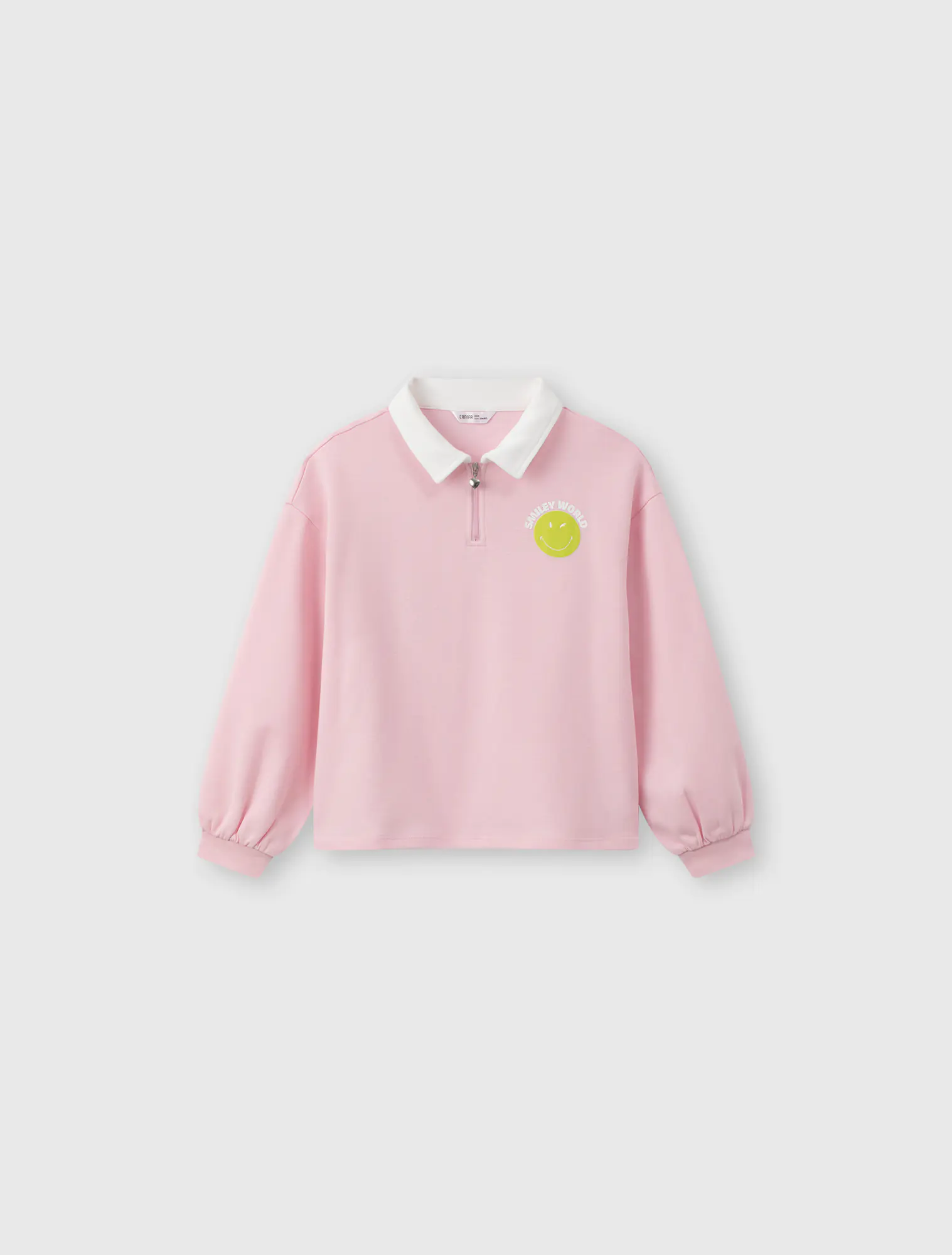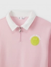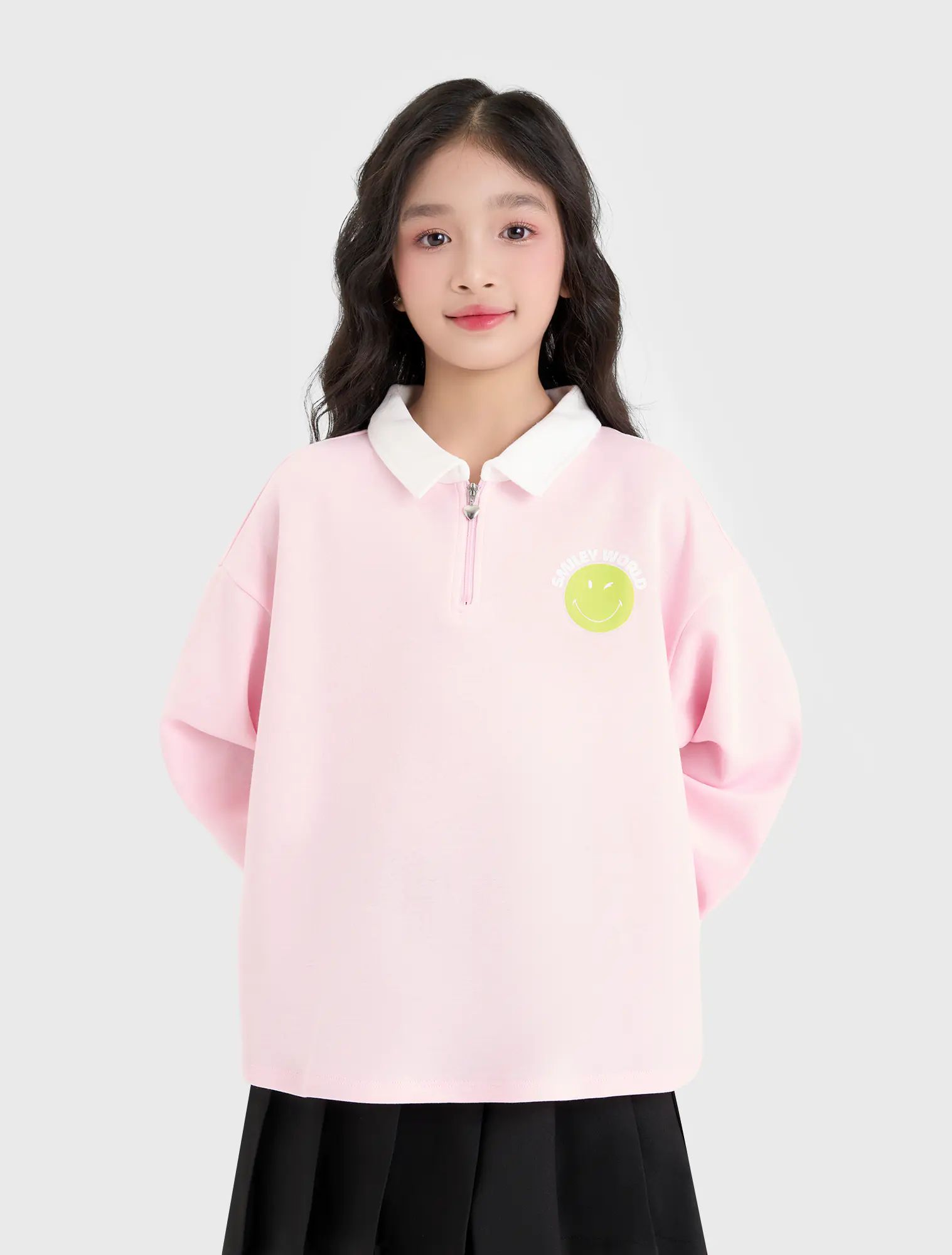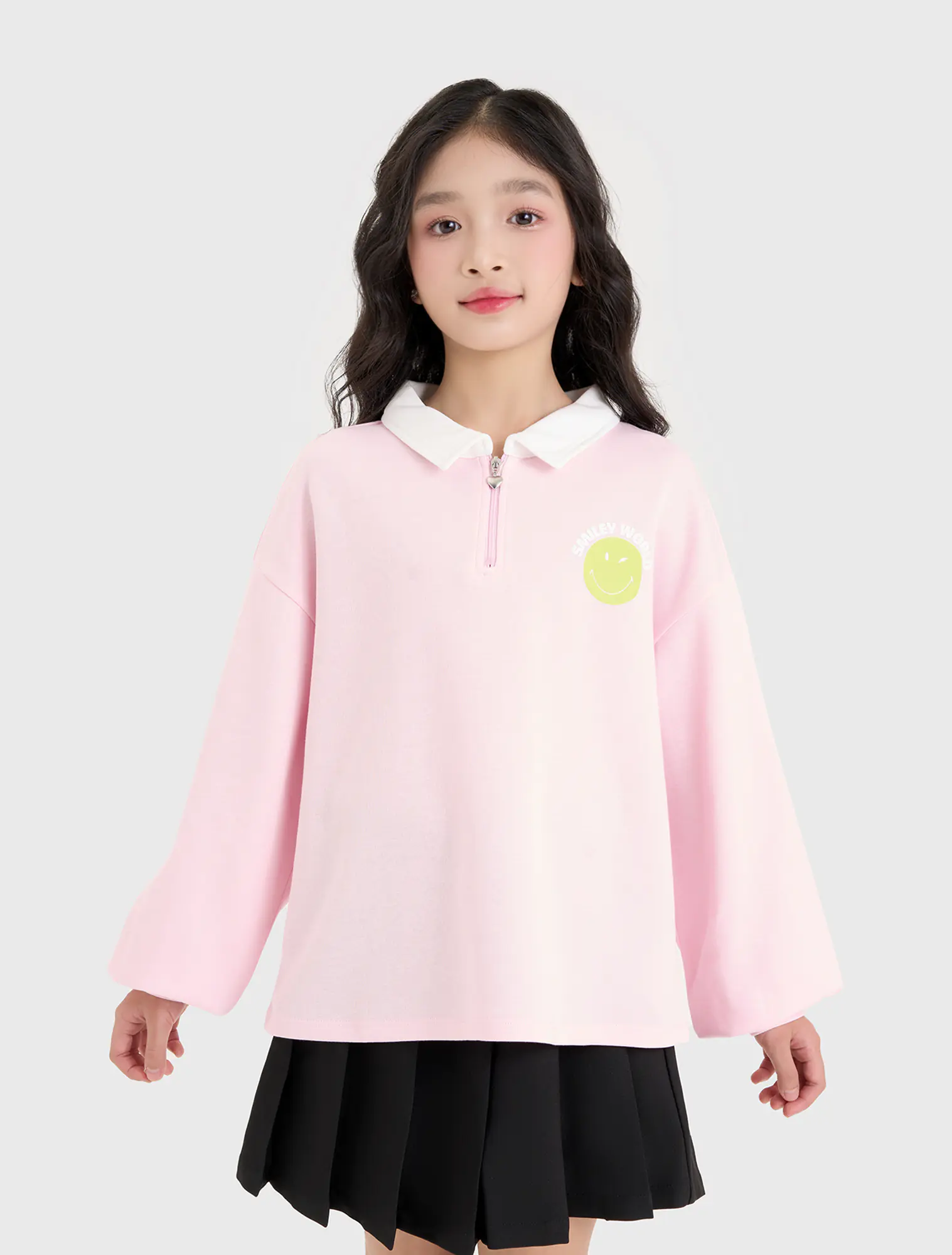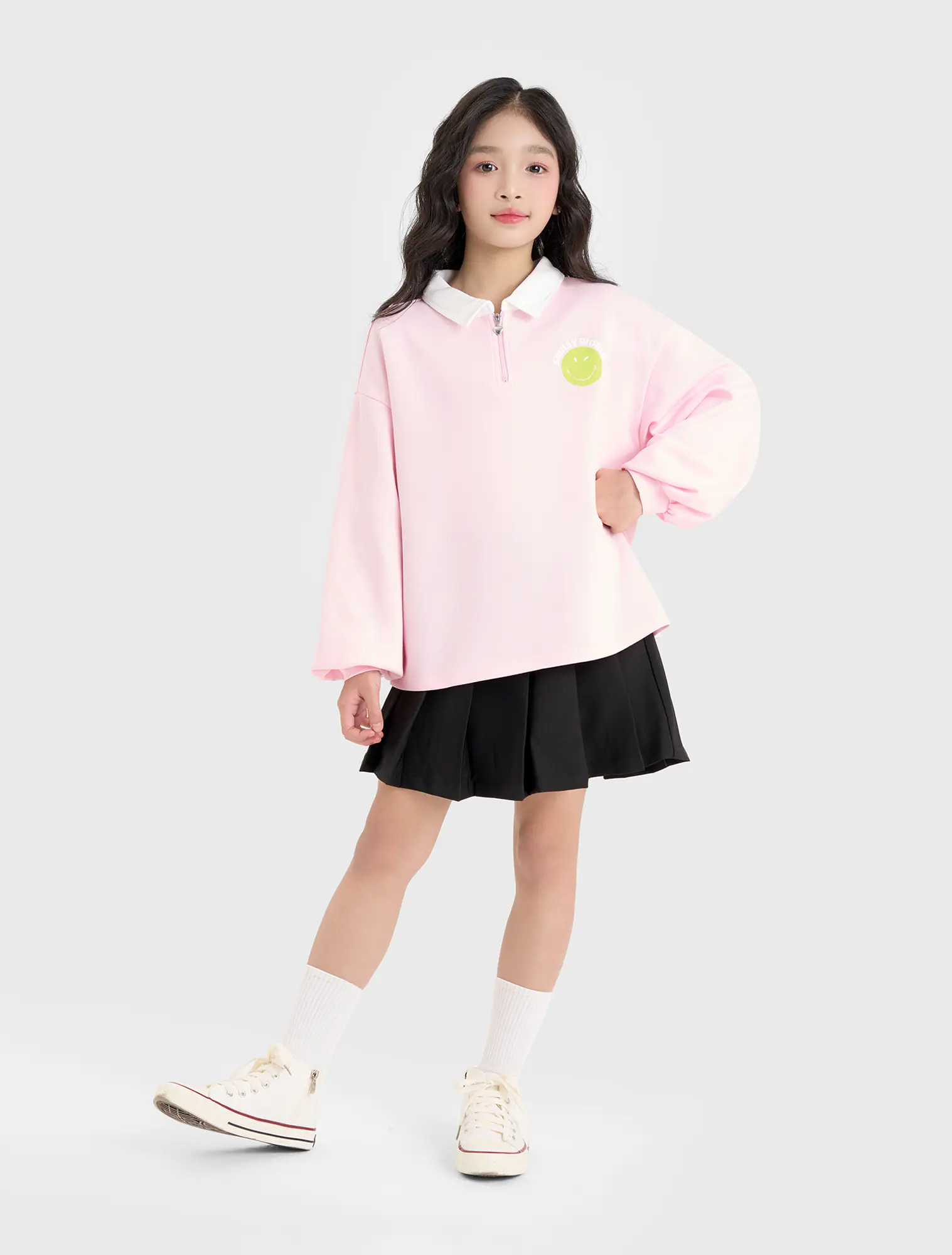 Áo bé gái cổ polo mở khóa kéo chui đầu. Màu sắc tươi sáng phối màu cổ áo, im hình thân trước thân sau hiện đại, thời trang, dễ kết hợp trang phục.