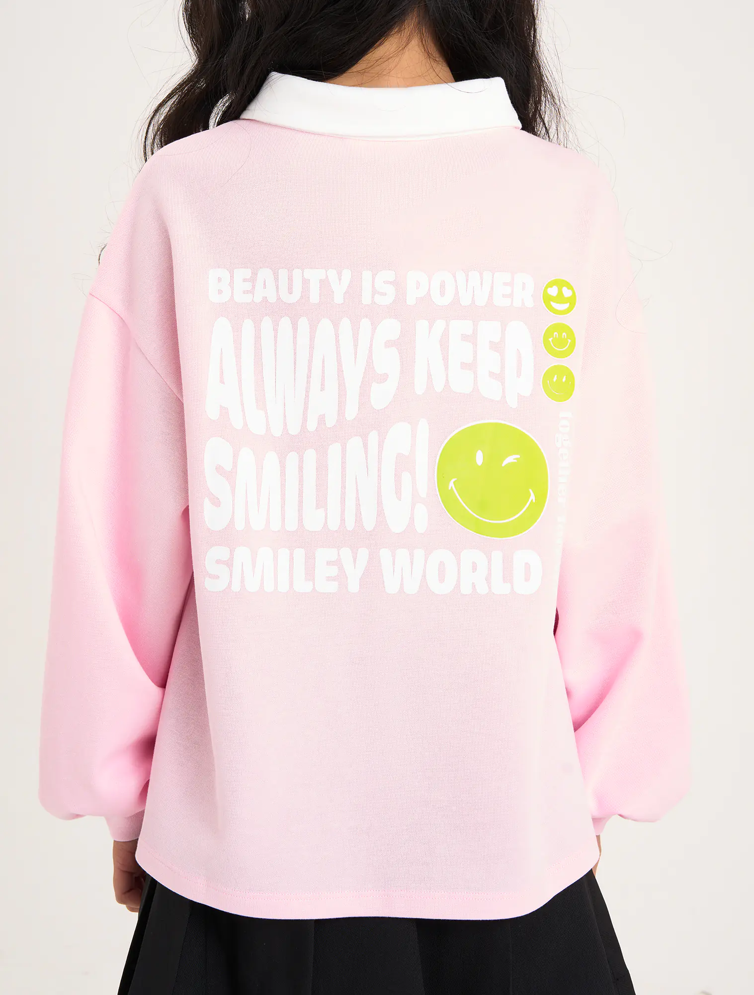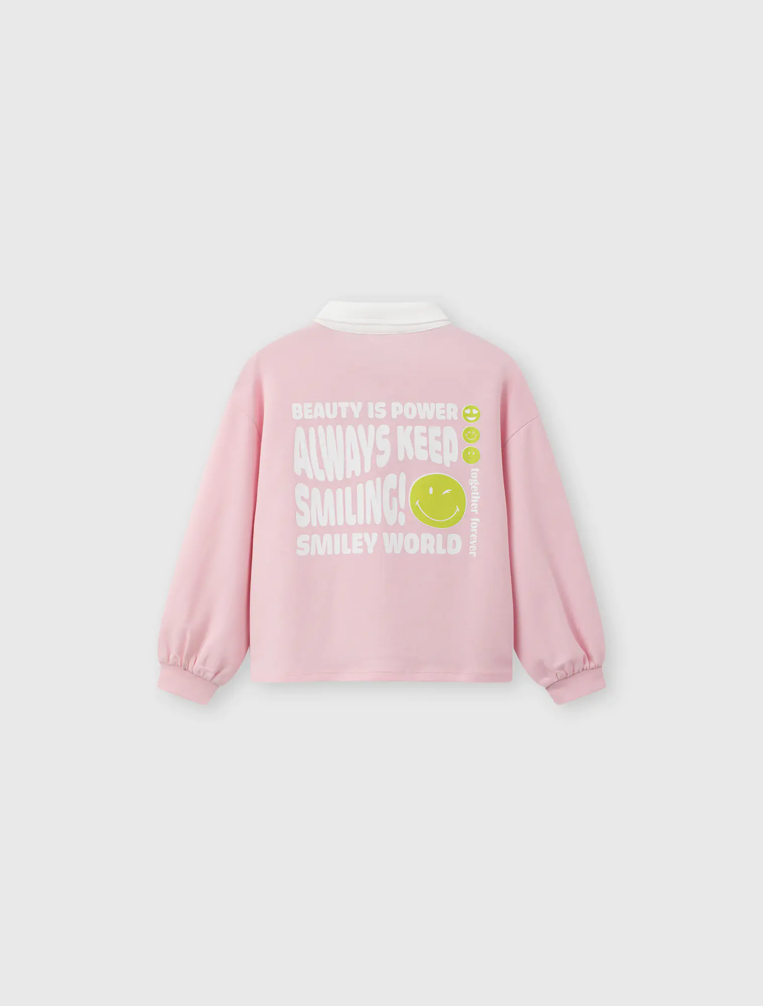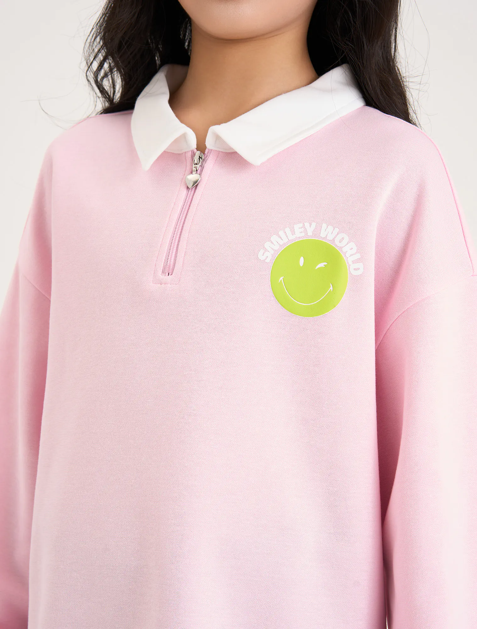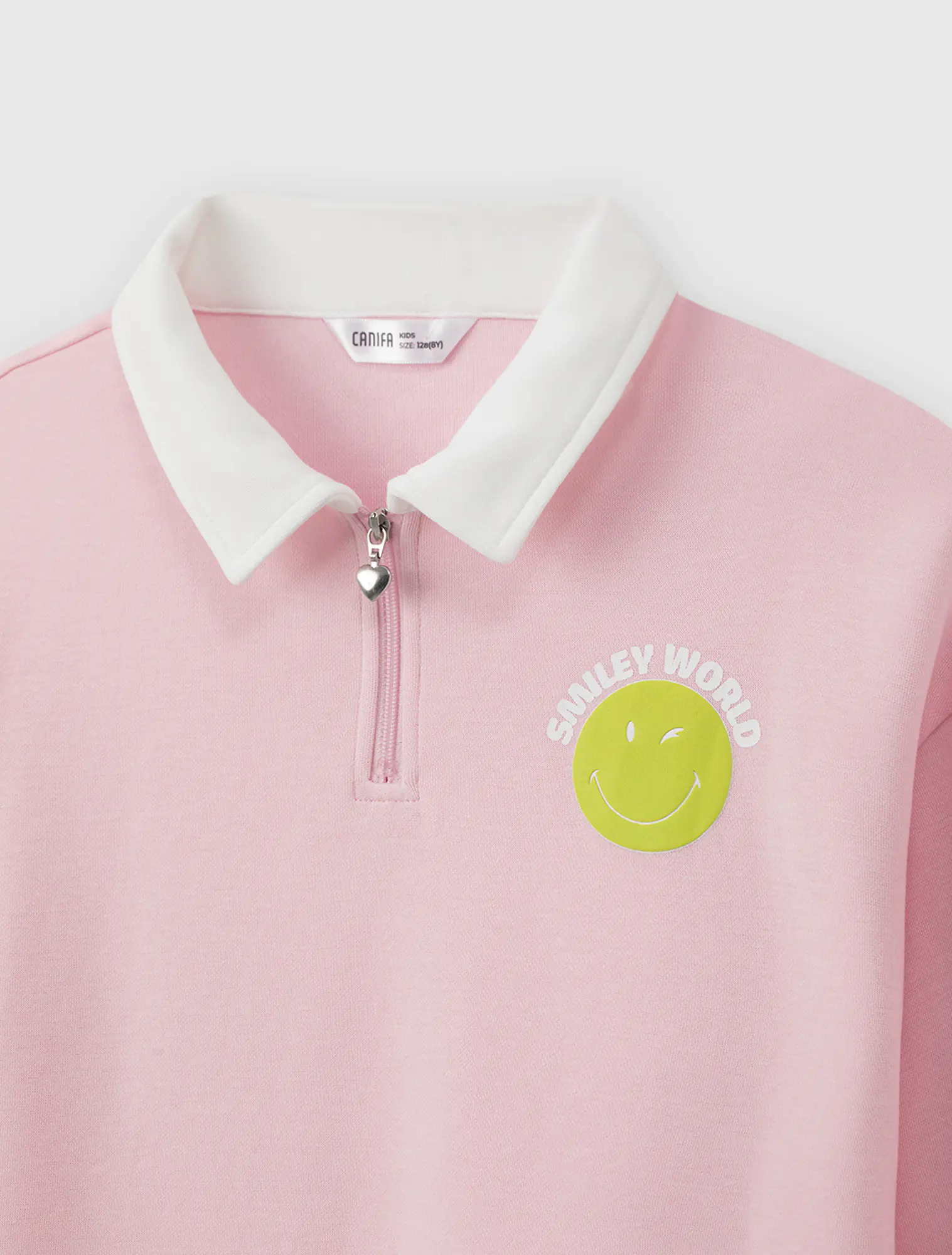 Áo bé gái cổ polo mở khóa kéo chui đầu. Màu sắc tươi sáng phối màu cổ áo, im hình thân trước thân sau hiện đại, thời trang, dễ kết hợp trang phục.