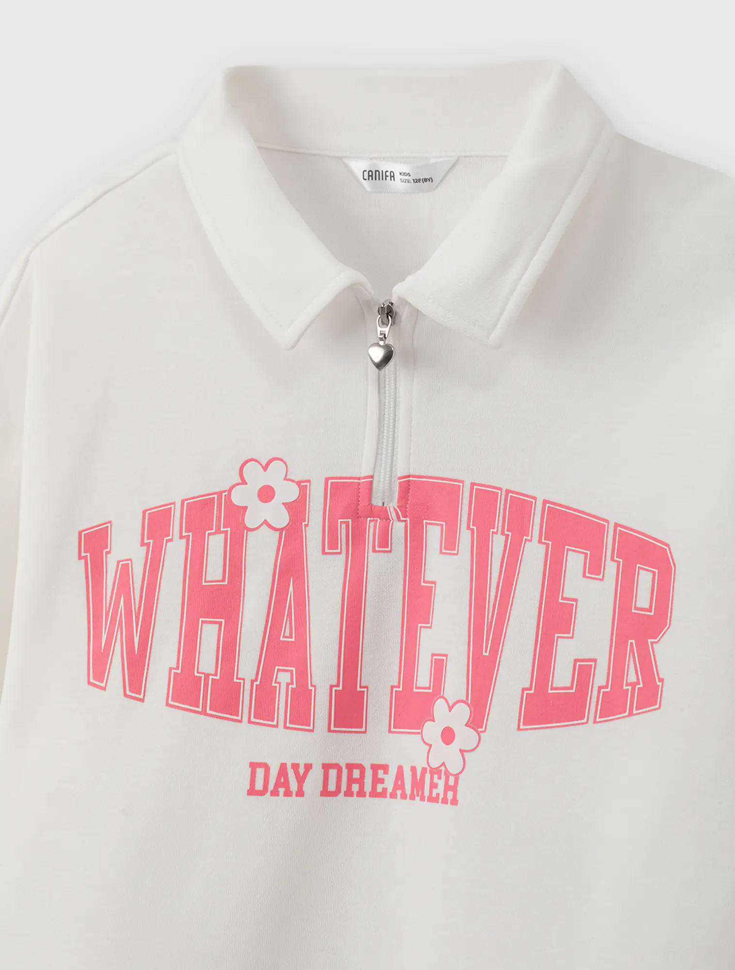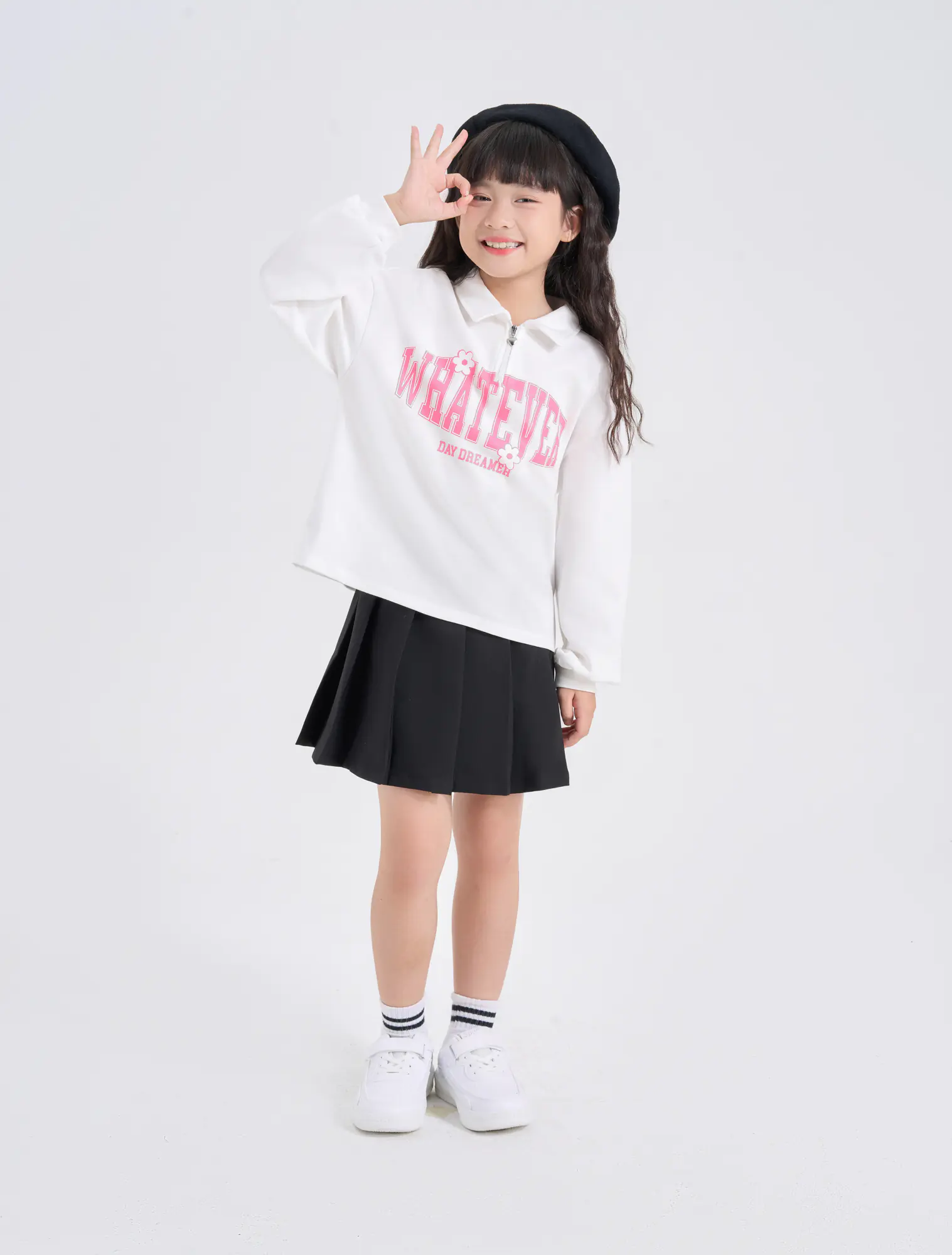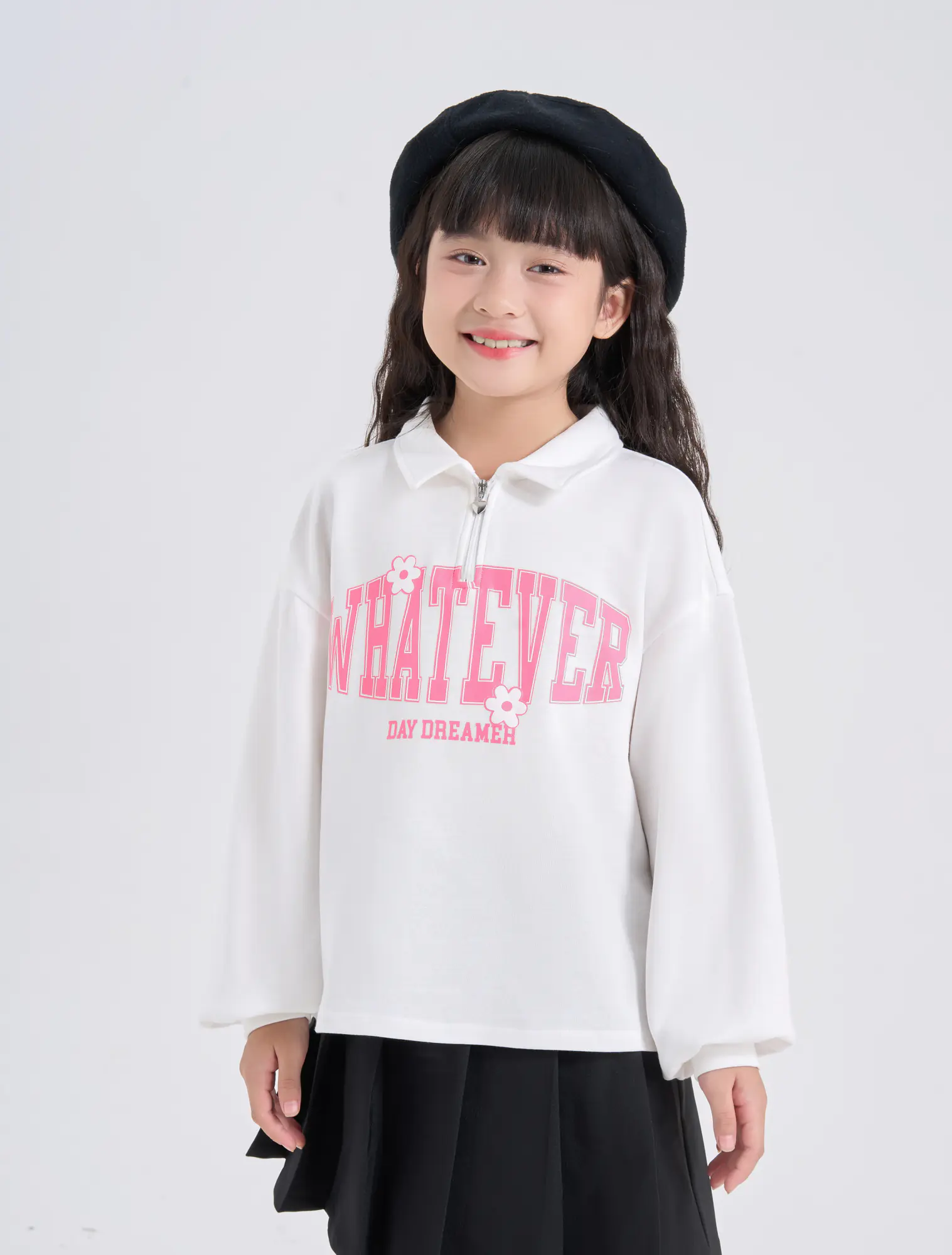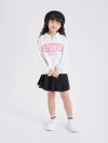 Áo bé gái cổ polo mở khóa kéo chui đầu. Màu sắc tươi sáng phối màu cổ áo, im hình thân trước thân sau hiện đại, thời trang, dễ kết hợp trang phục.