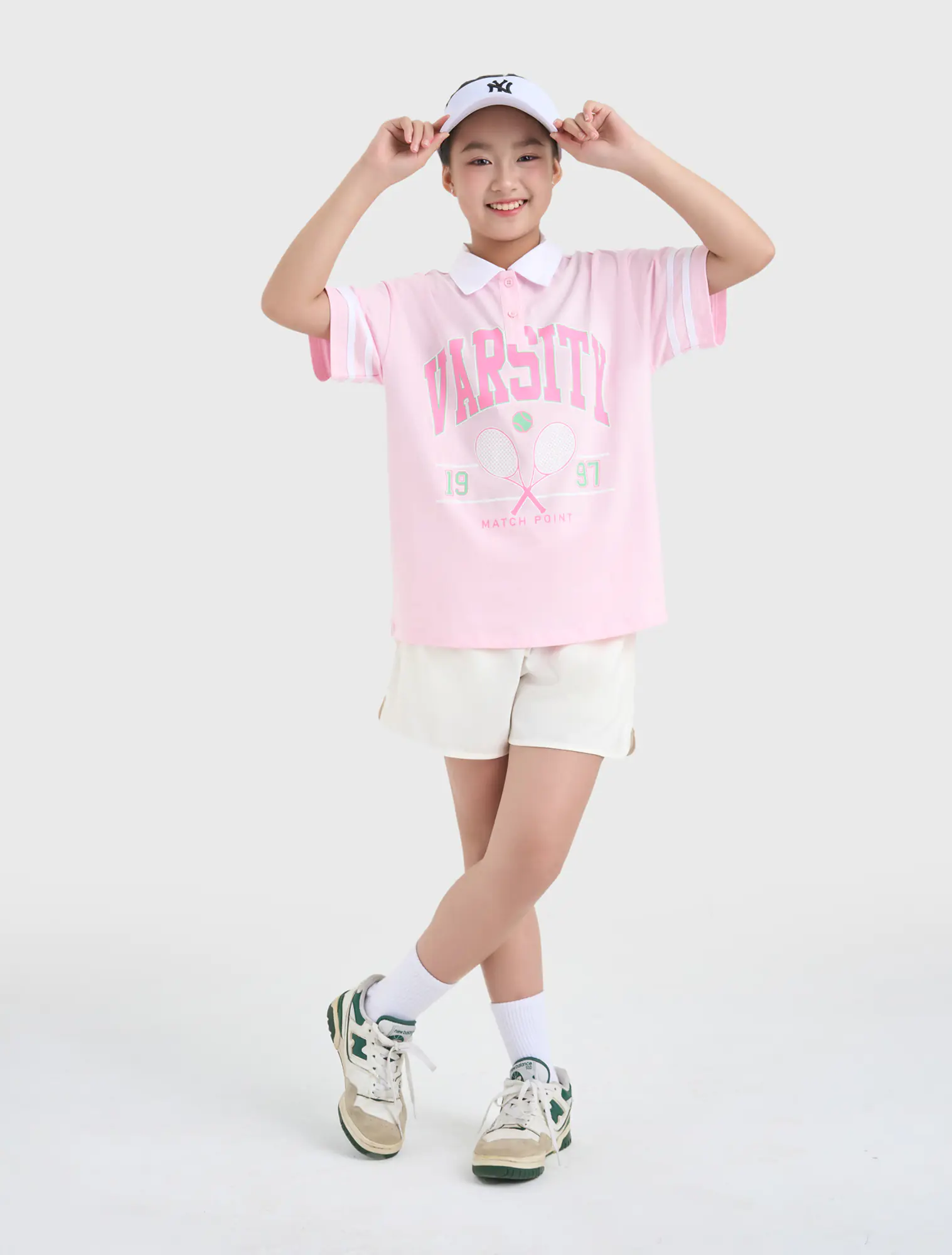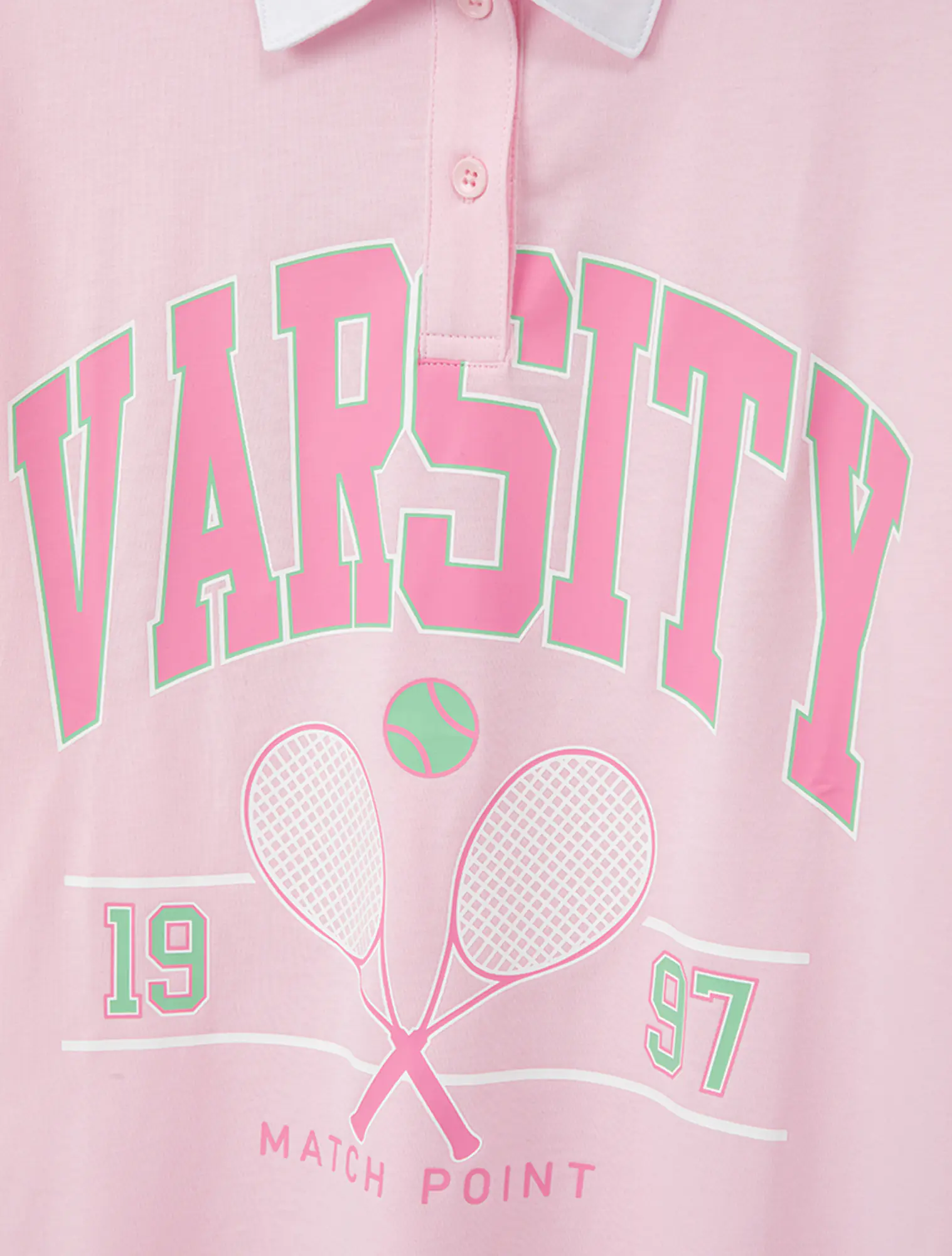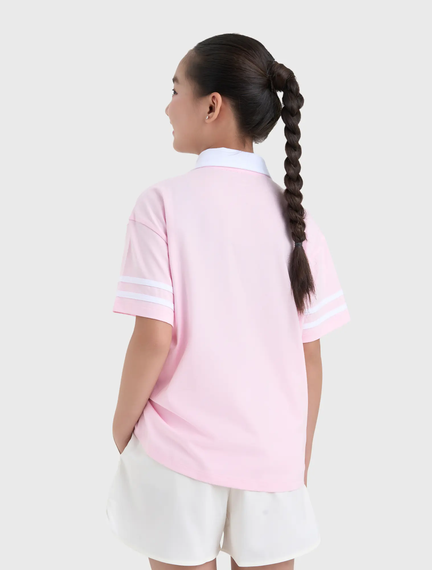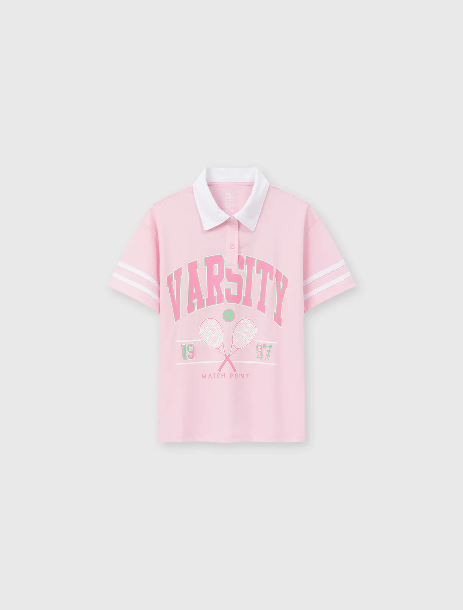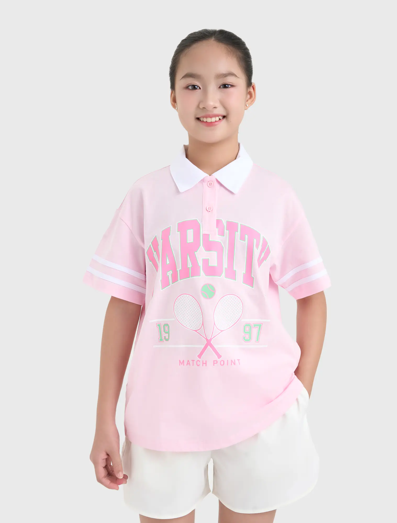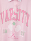 Áo polo ngắn tay bé gái. Phom dáng hiện đại, phối màu cổ và kẻ tay ấn tượng. Hình in, màu sắc cá tính nhưng vẫn nữ tính, thời trang.