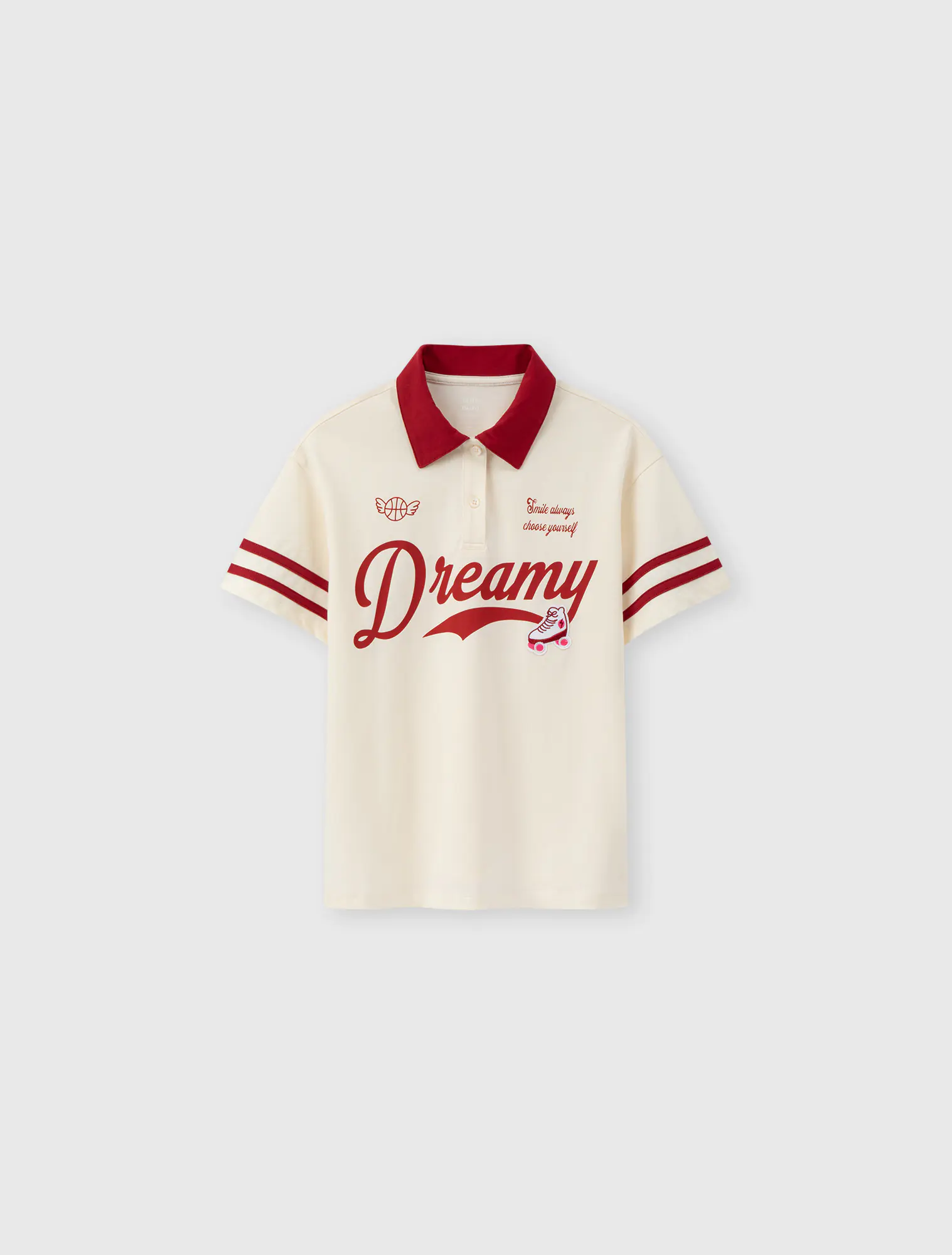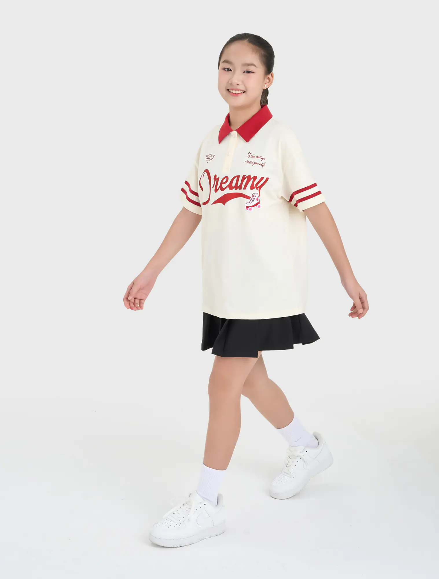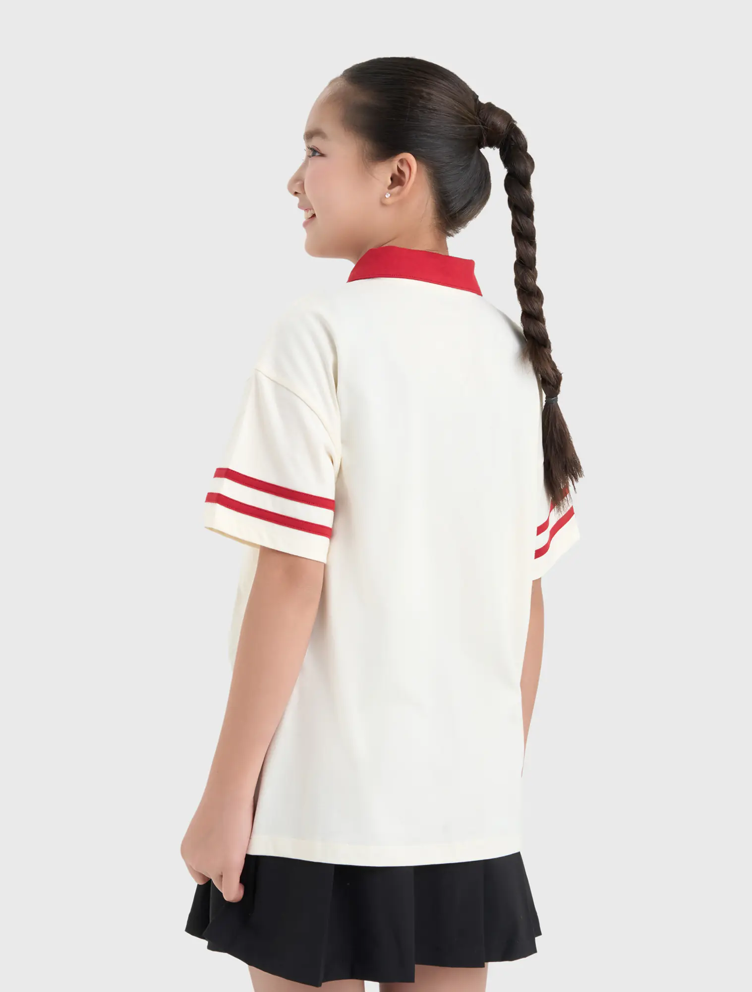 Áo polo ngắn tay bé gái. Phom dáng hiện đại, phối màu cổ và kẻ tay ấn tượng. Hình in, màu sắc cá tính nhưng vẫn nữ tính, thời trang.