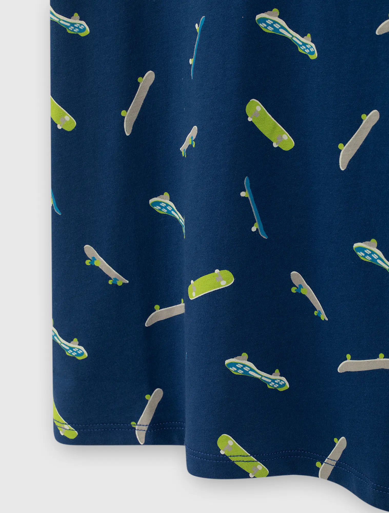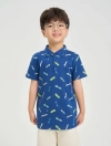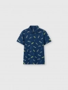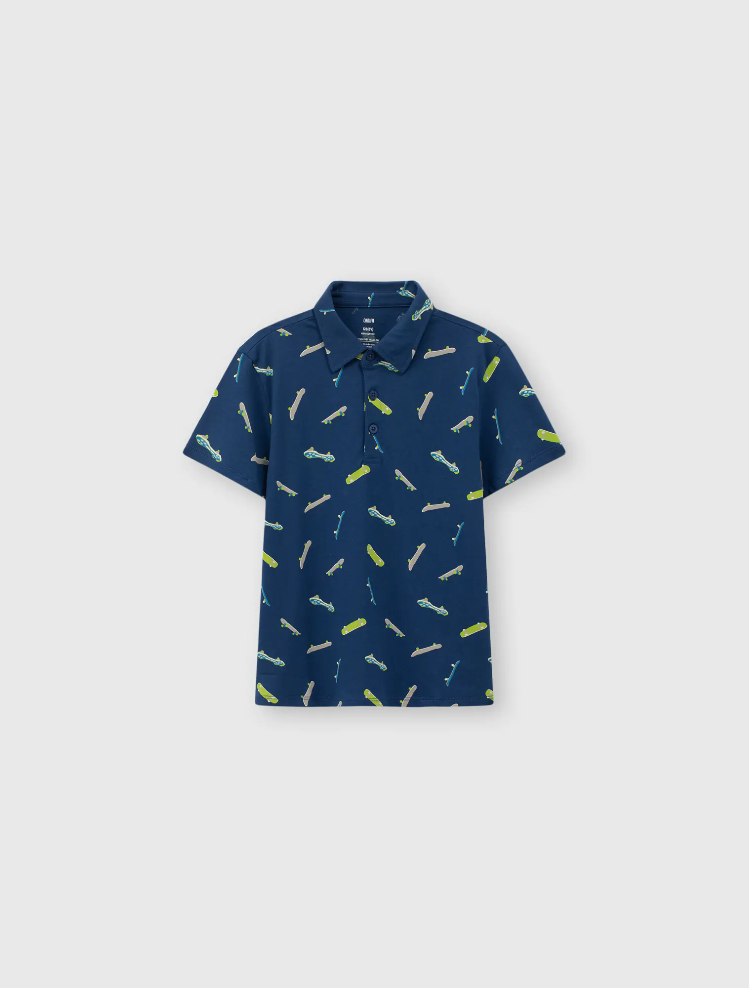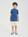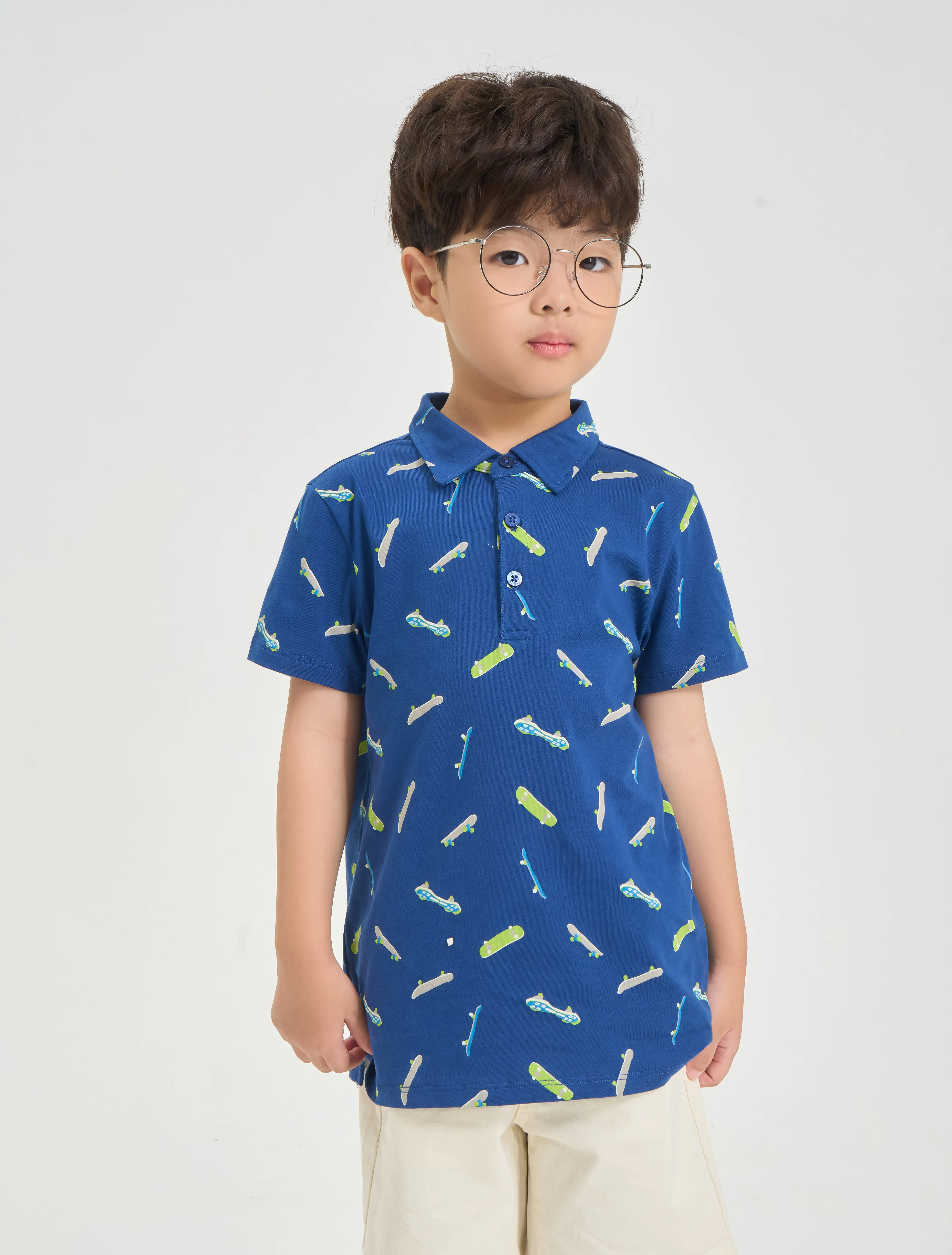 Áo polo họa tiết in tràn khủng long cho bé, chất liệu cotton thoải mái, phom dáng cơ bản dễ mặc, hình in phù hợp với sở thích của các bé.