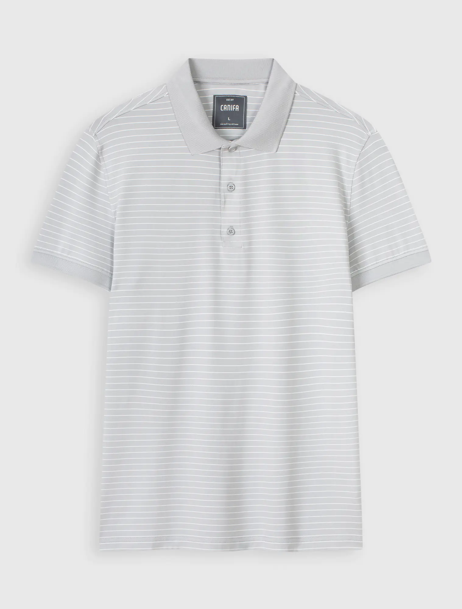 Áo polo nam chất liệu polyester có co giãn, họa tiết kẻ ngang nhỏ.