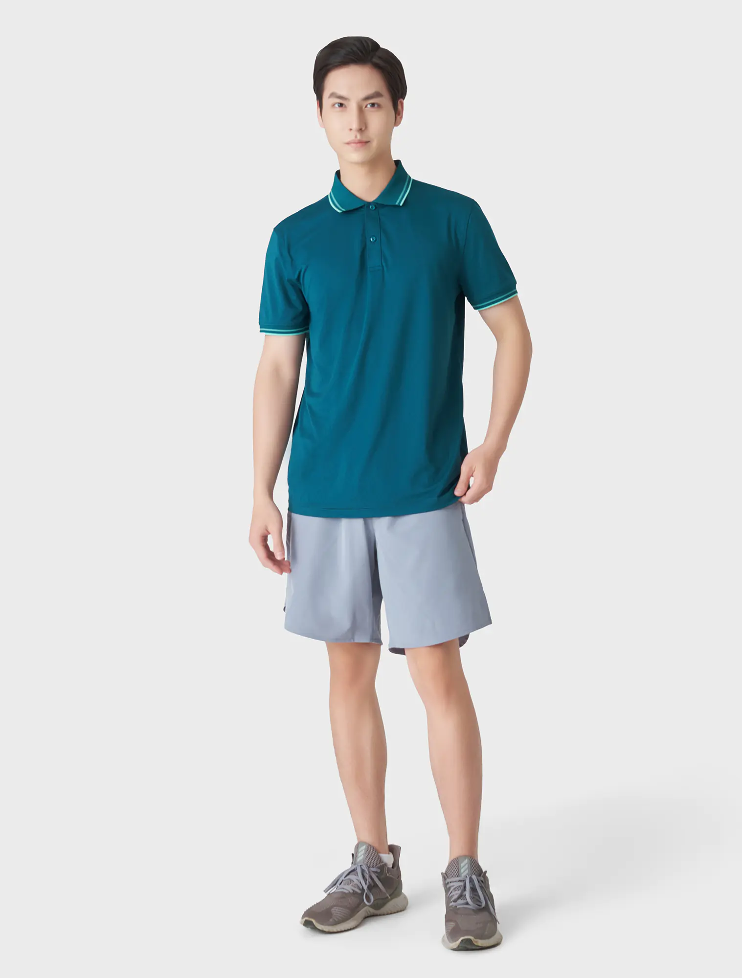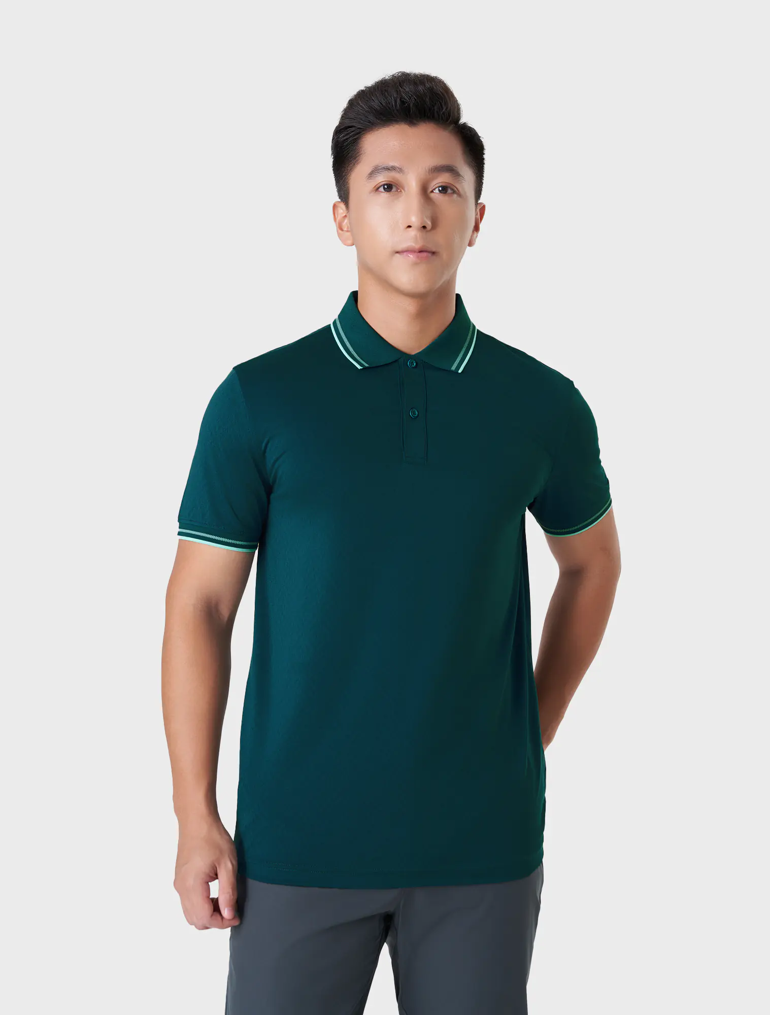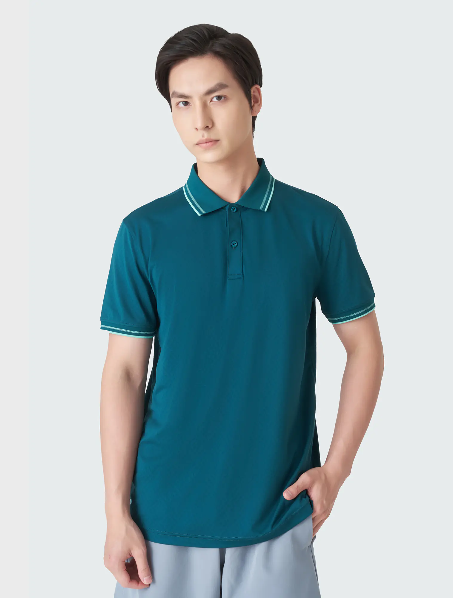Áo polo chất liệu polyester, cổ đức tay cộc, phom regular.