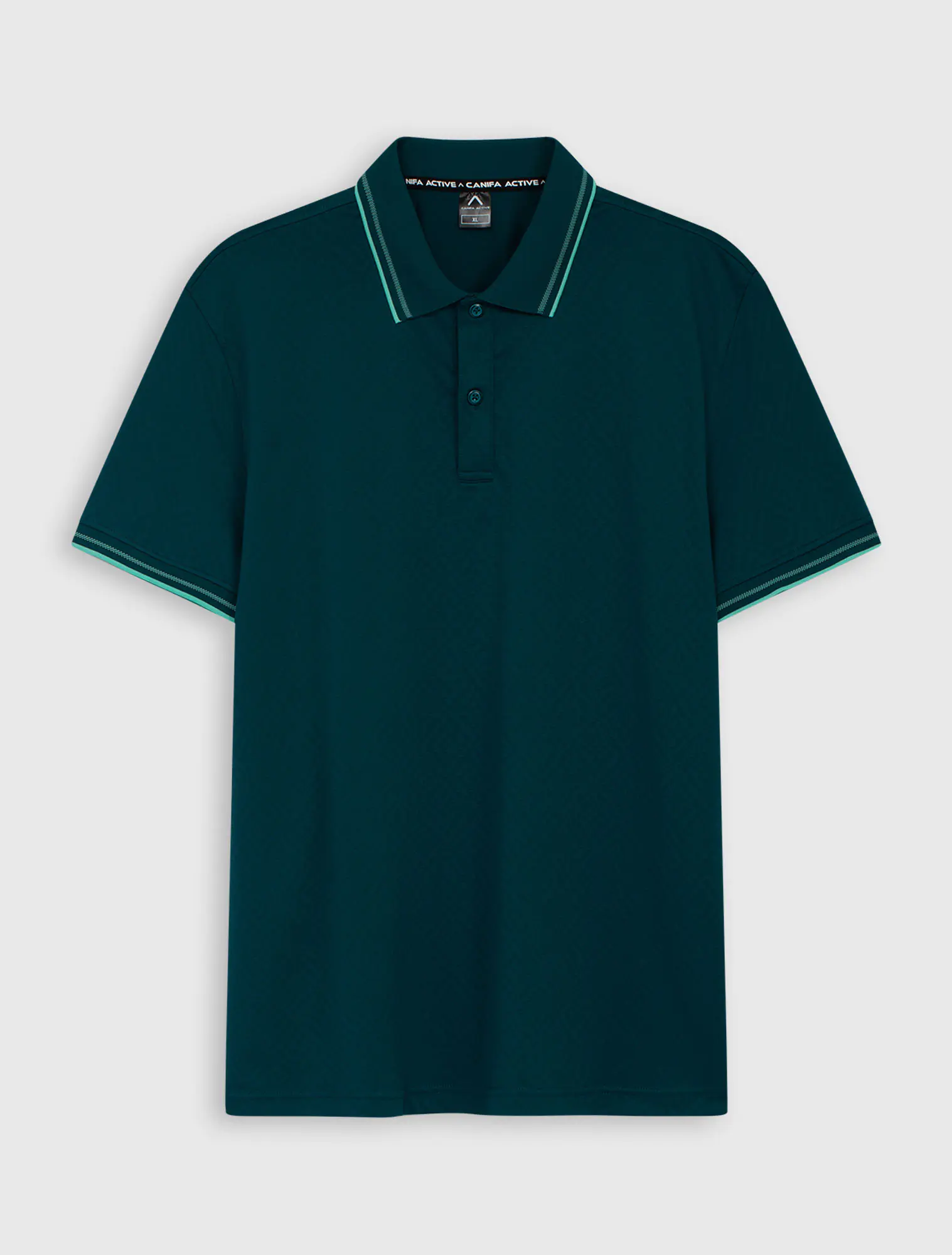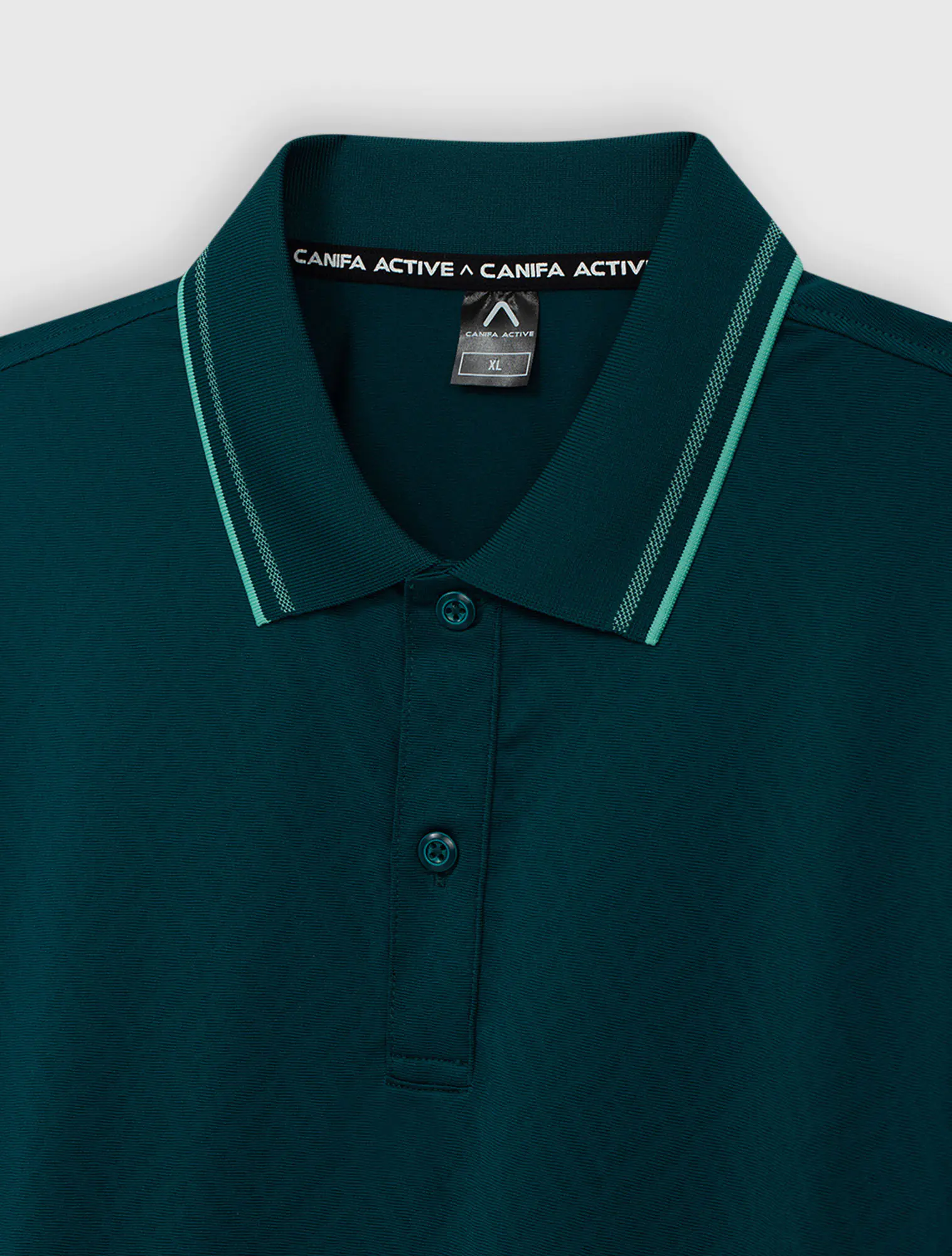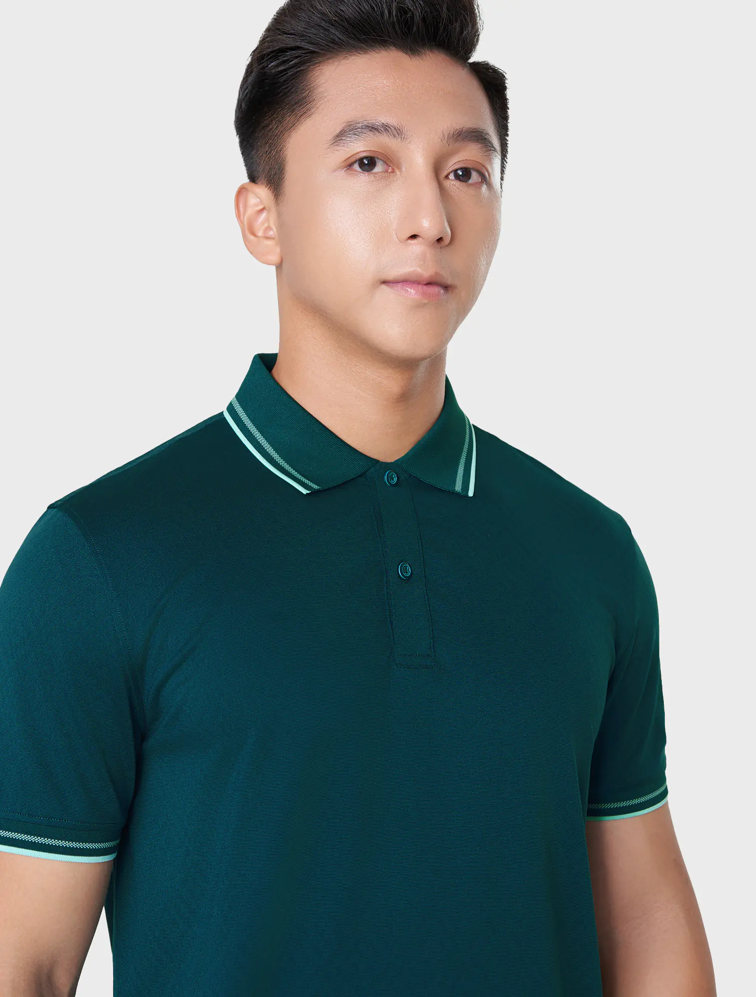 Áo polo chất liệu polyester, cổ đức tay cộc, phom regular.