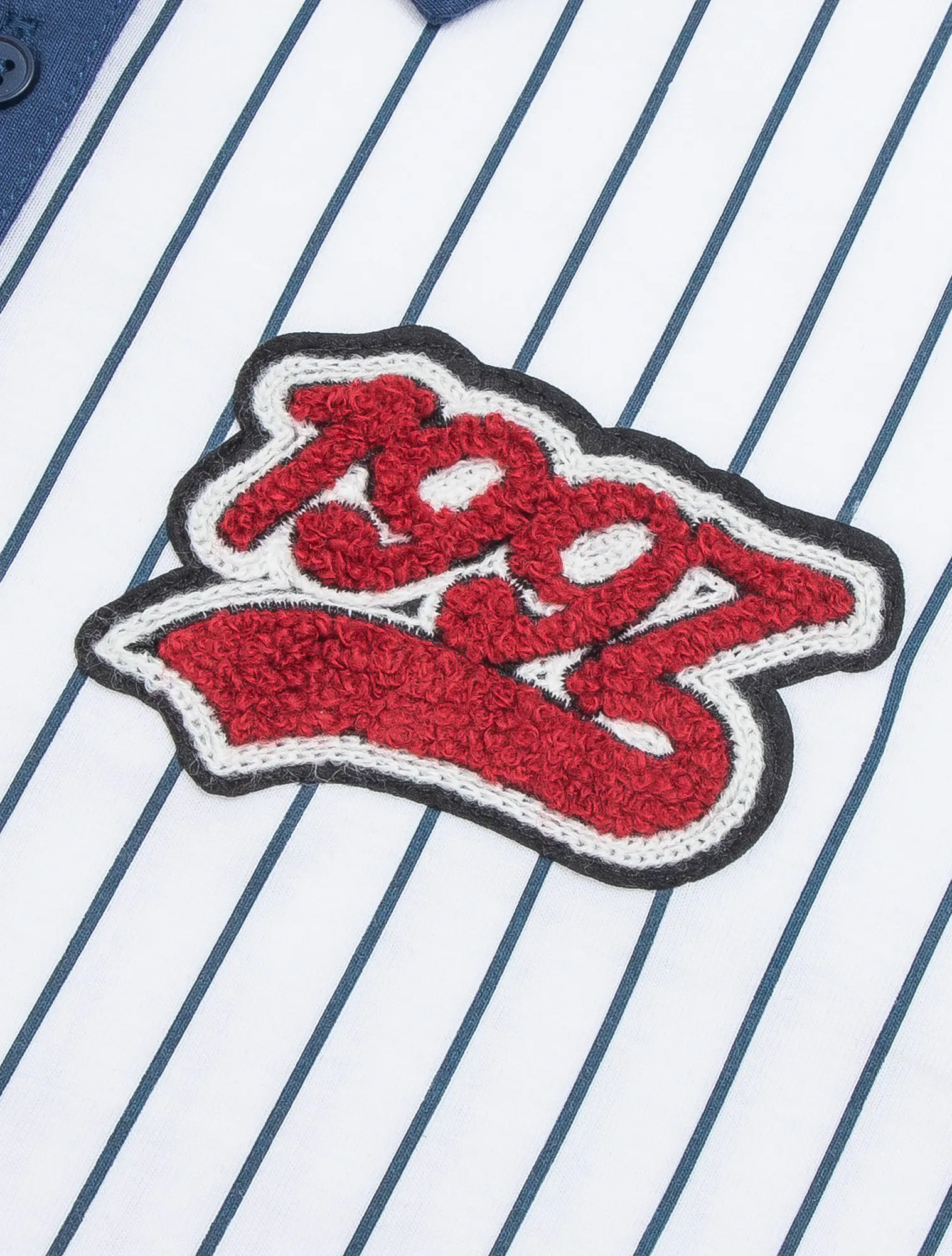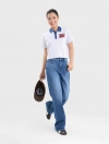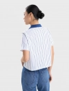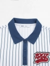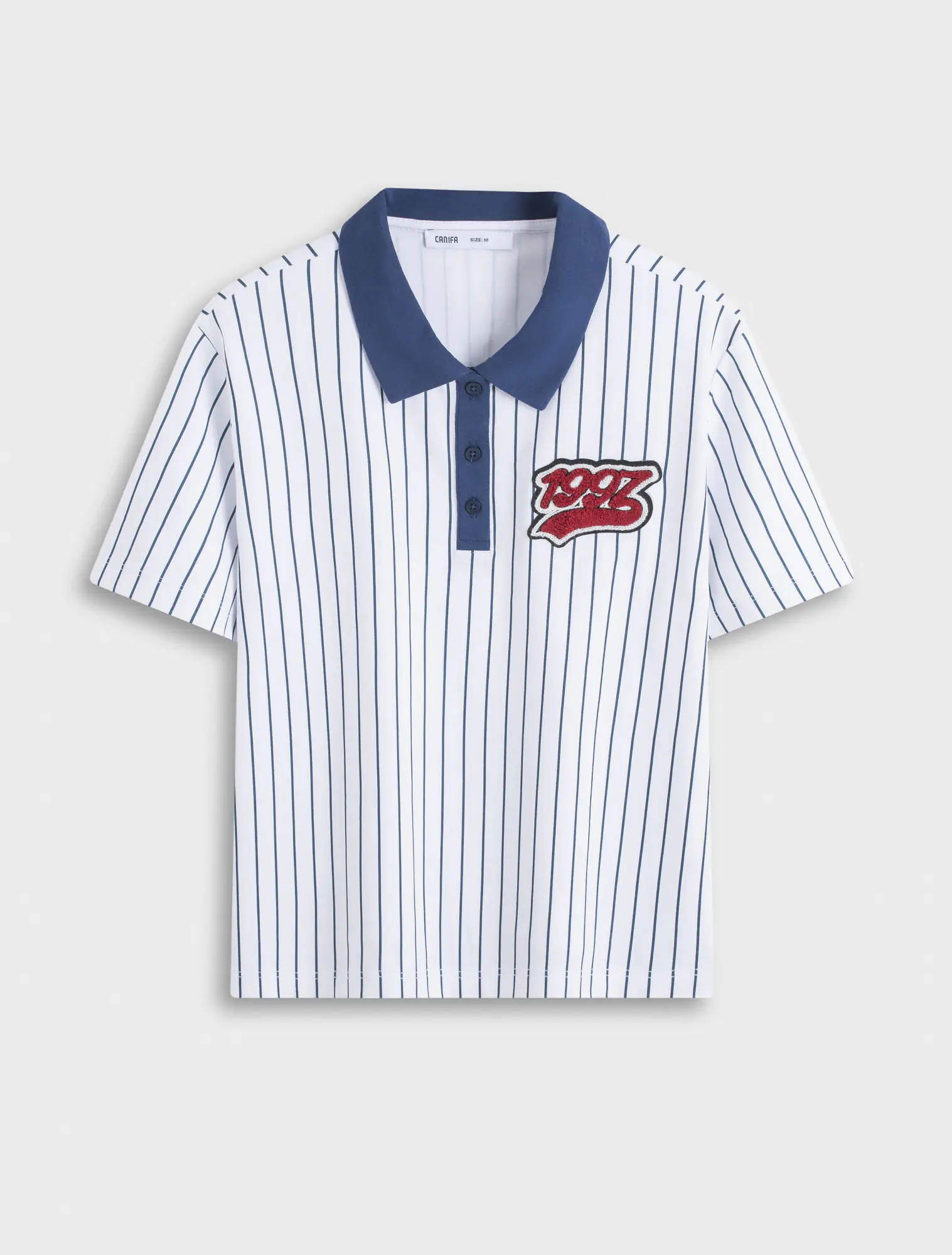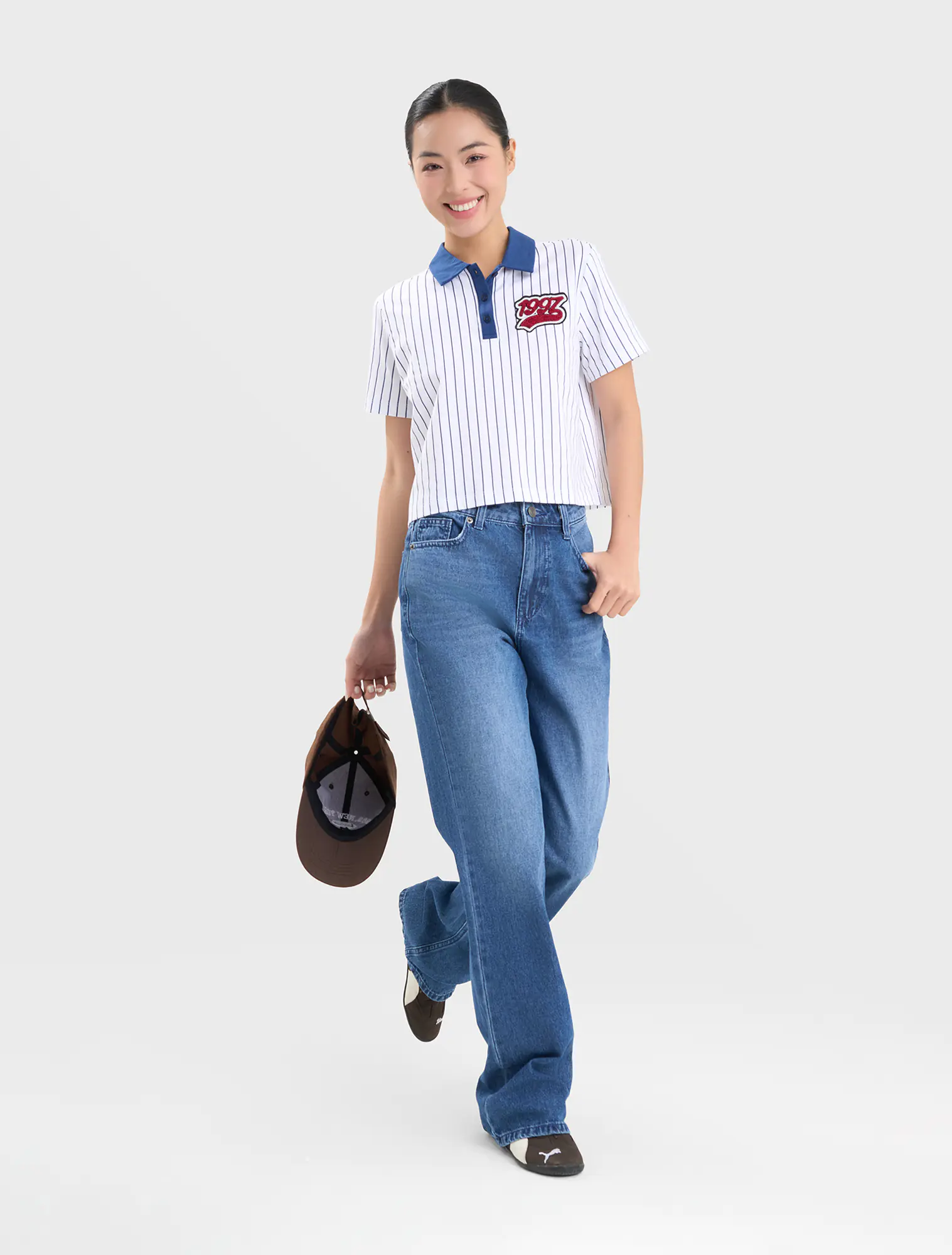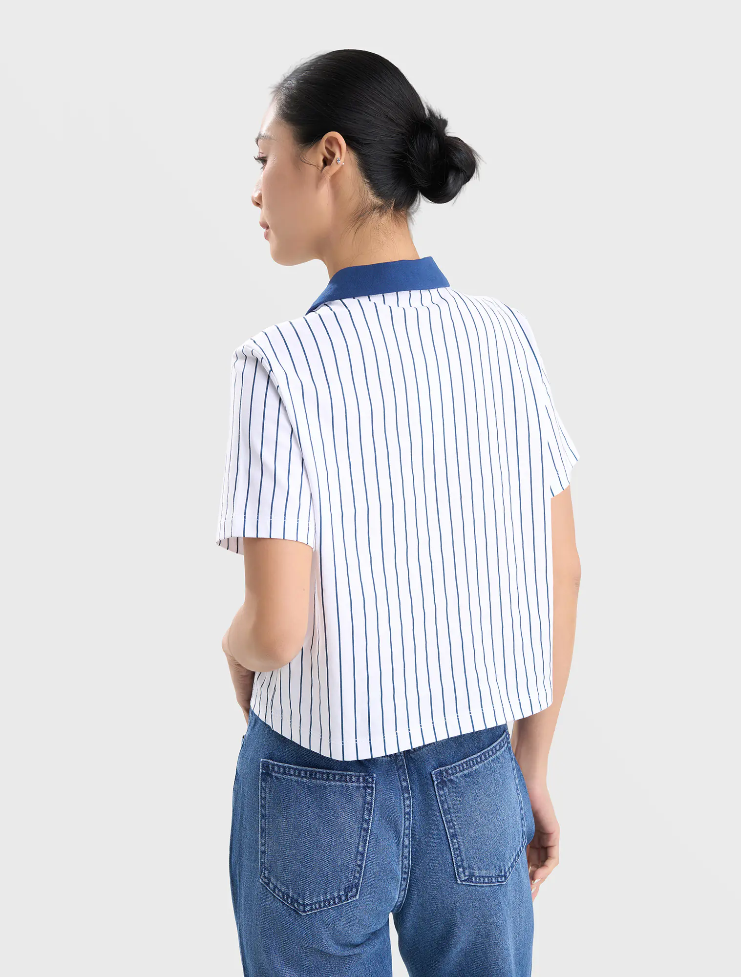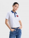 Áo polo nữ, thiết kế kẻ sọc trẻ trung, kết hợp chi tiết patch và phối màu cổ độc đáo, tạo nên sự trẻ trung năng động.