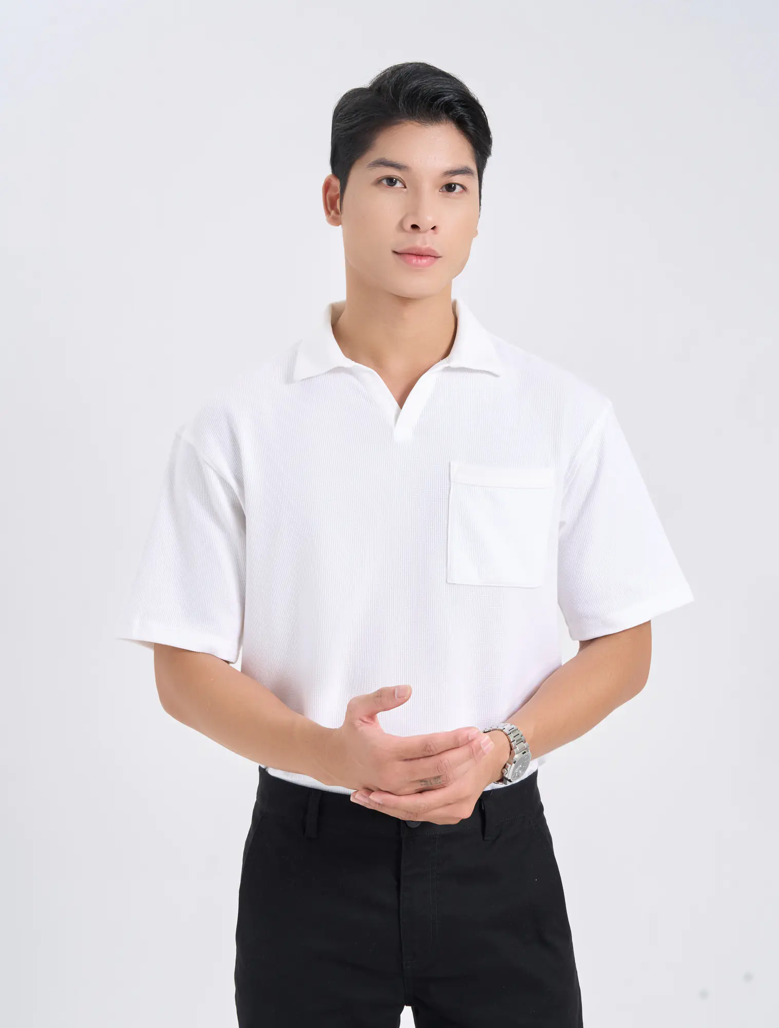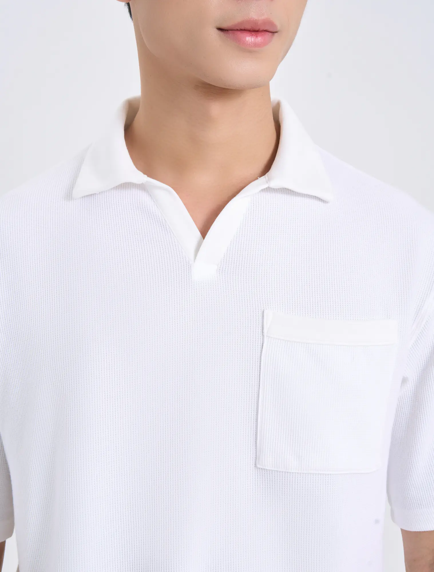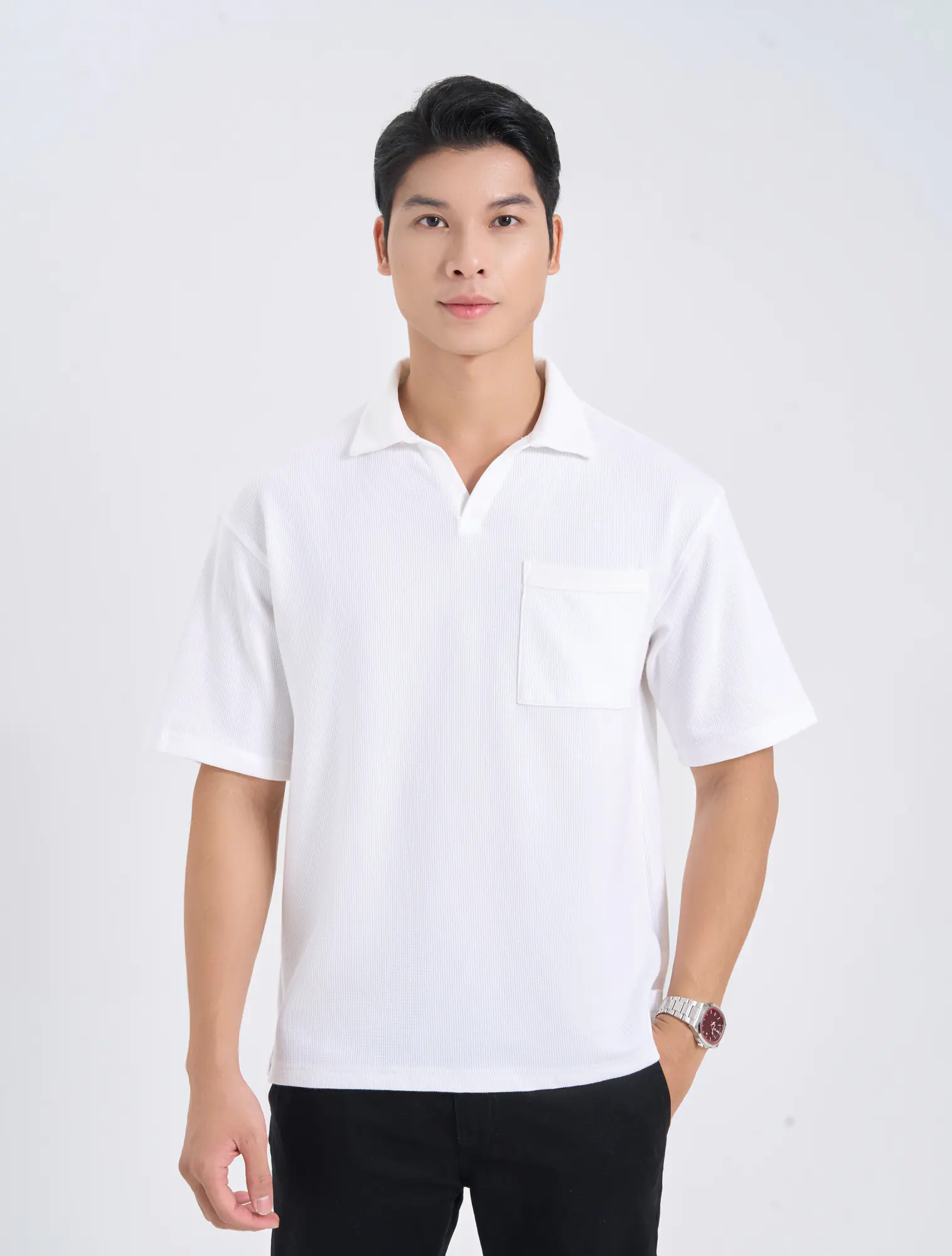 Áo polo nam phom rộng, cộc tay, cổ V có túi ngực.