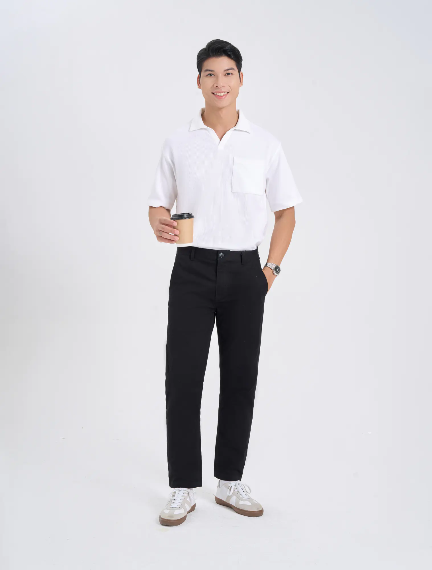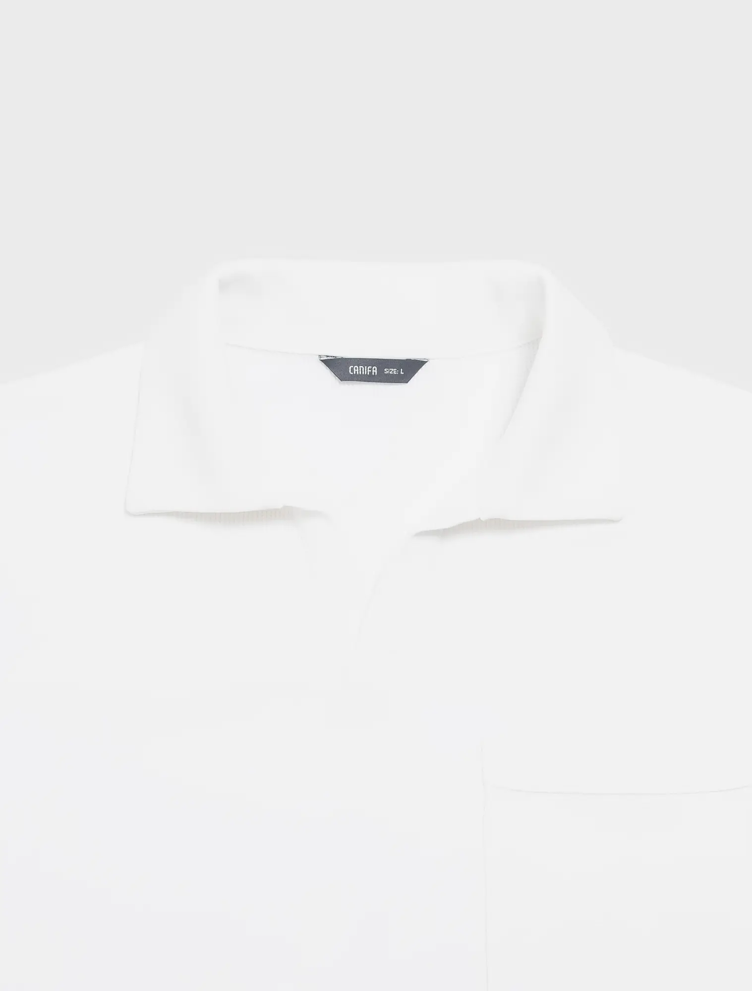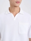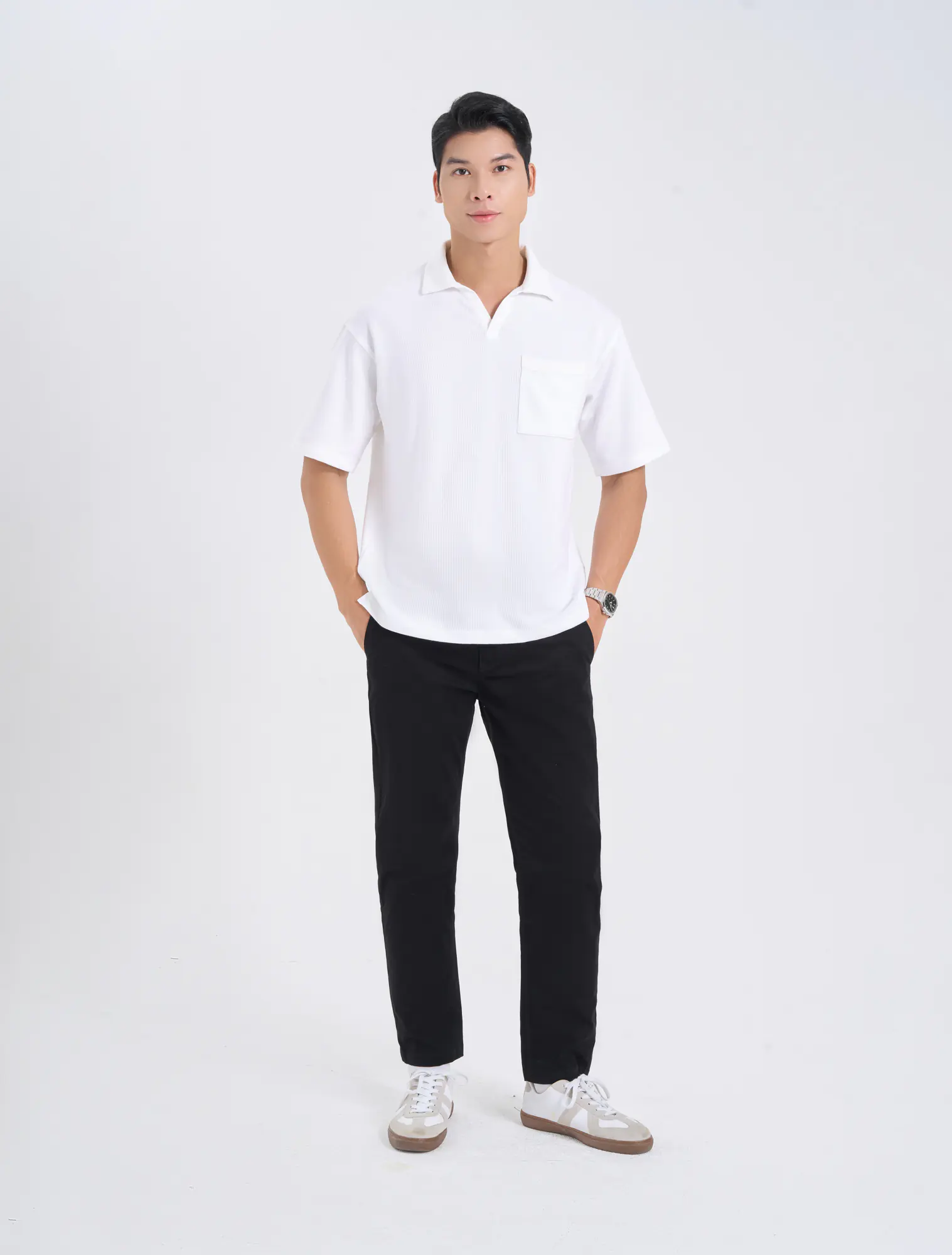 Áo polo nam phom rộng, cộc tay, cổ V có túi ngực.