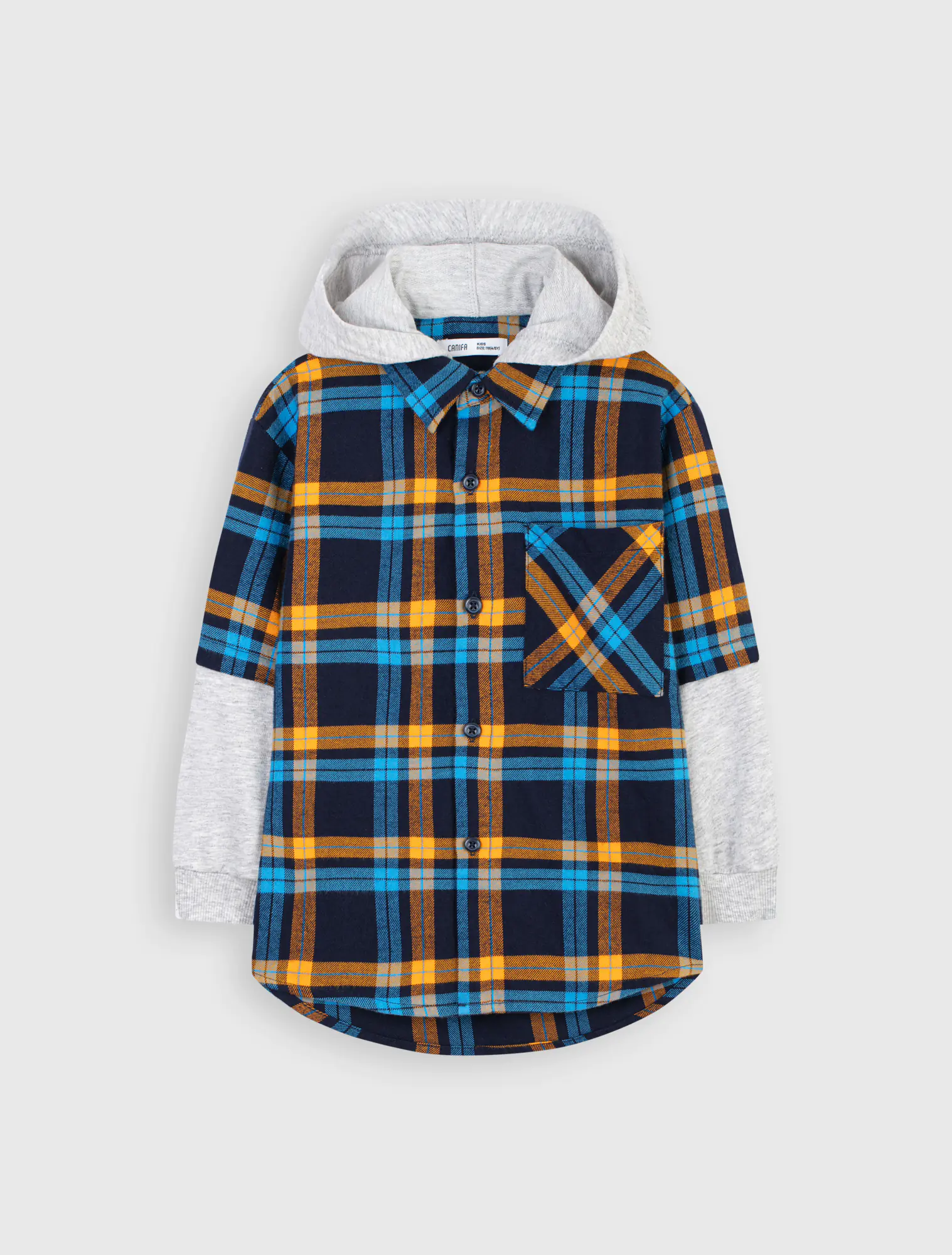 Áo sơ mi bé trai cotton dài tay phối tay và mũ nỉ