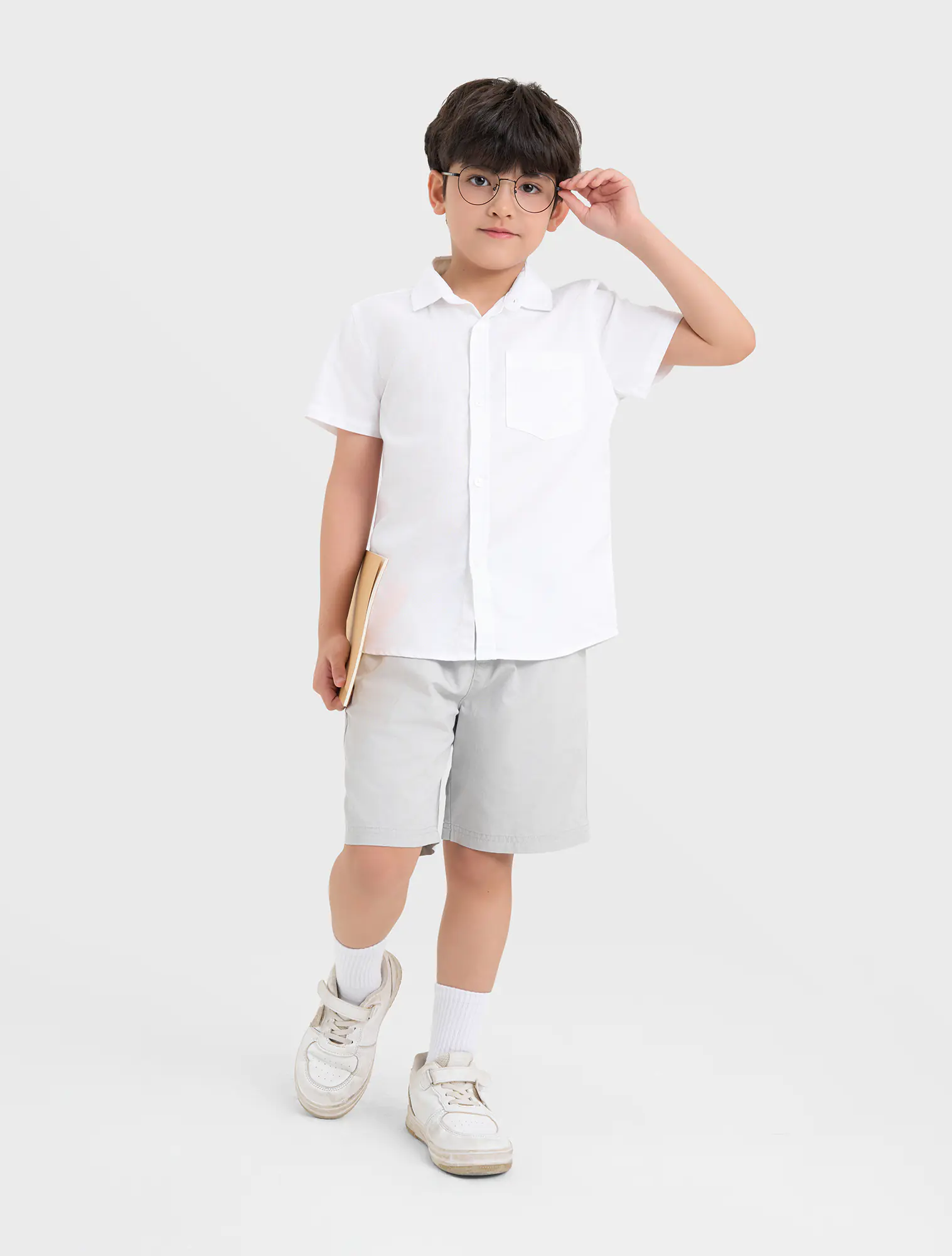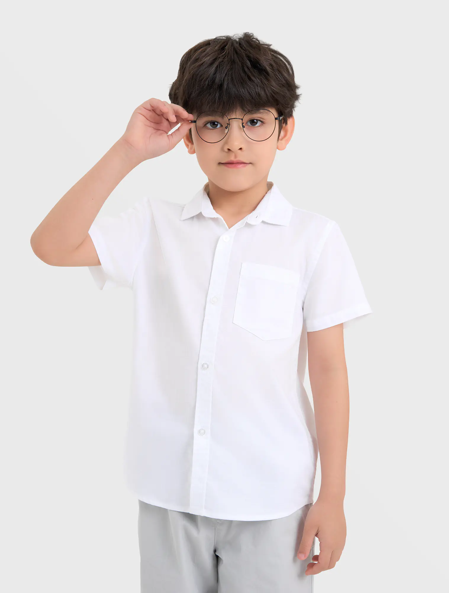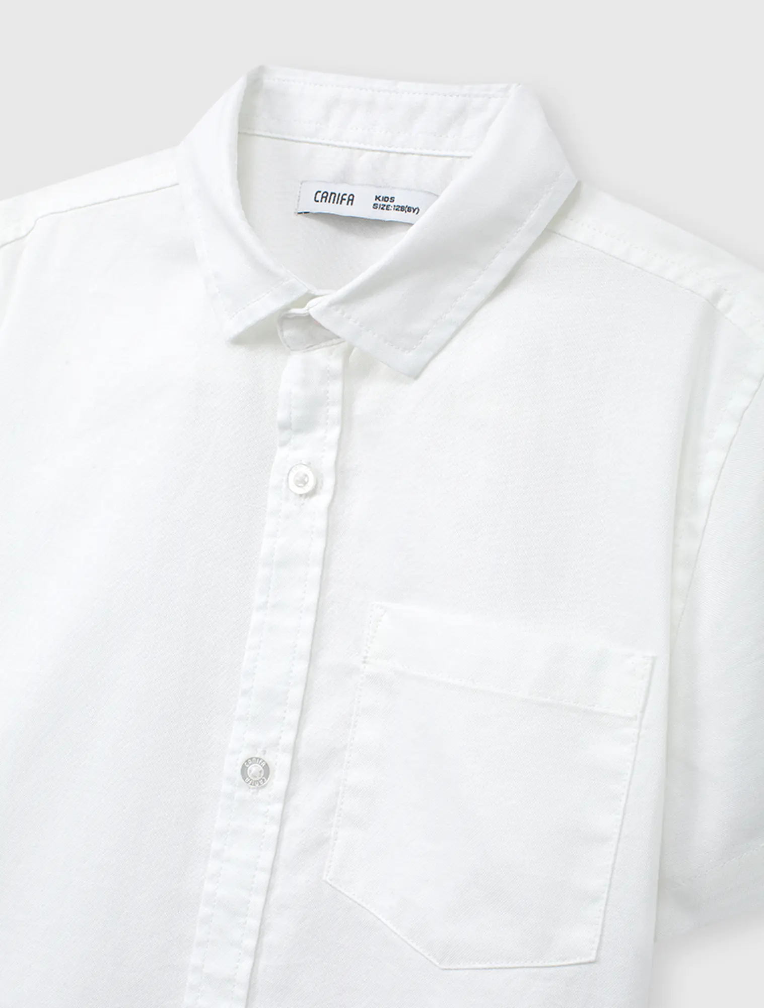 Áo sơ mi bé trai ngắn tay có túi ngực, phom basic bé có thể sử dụng đi học, đi chơi dễ dàng.