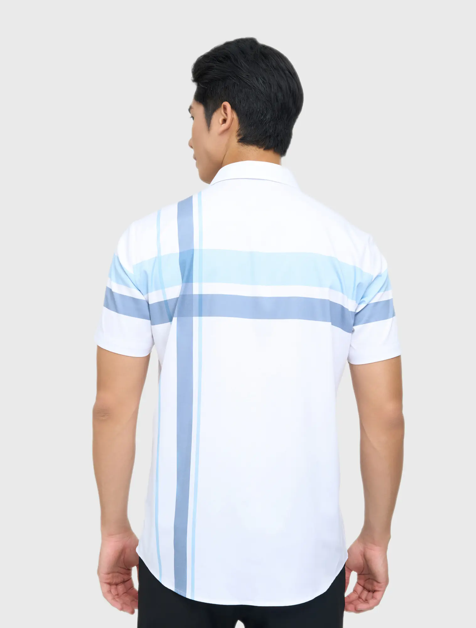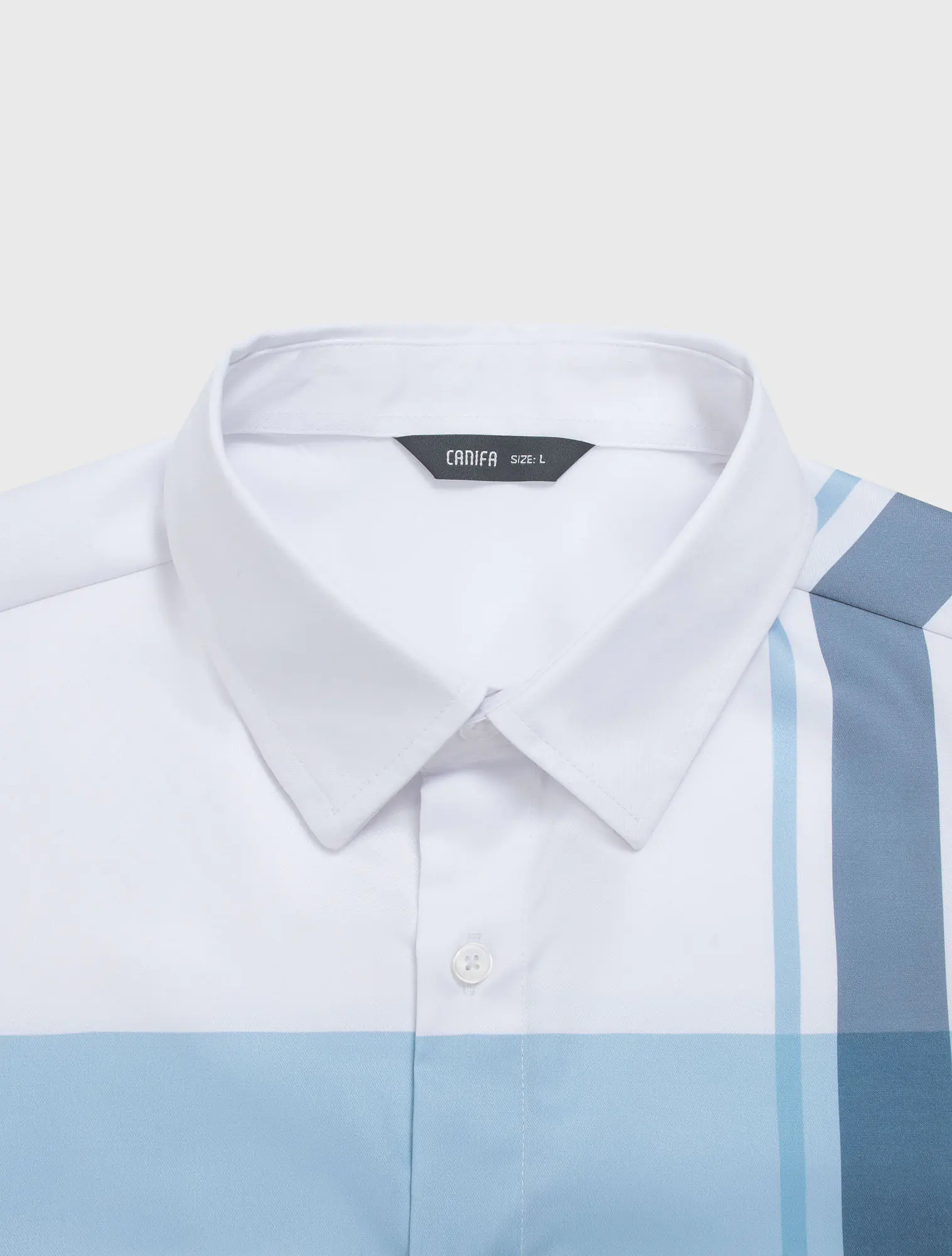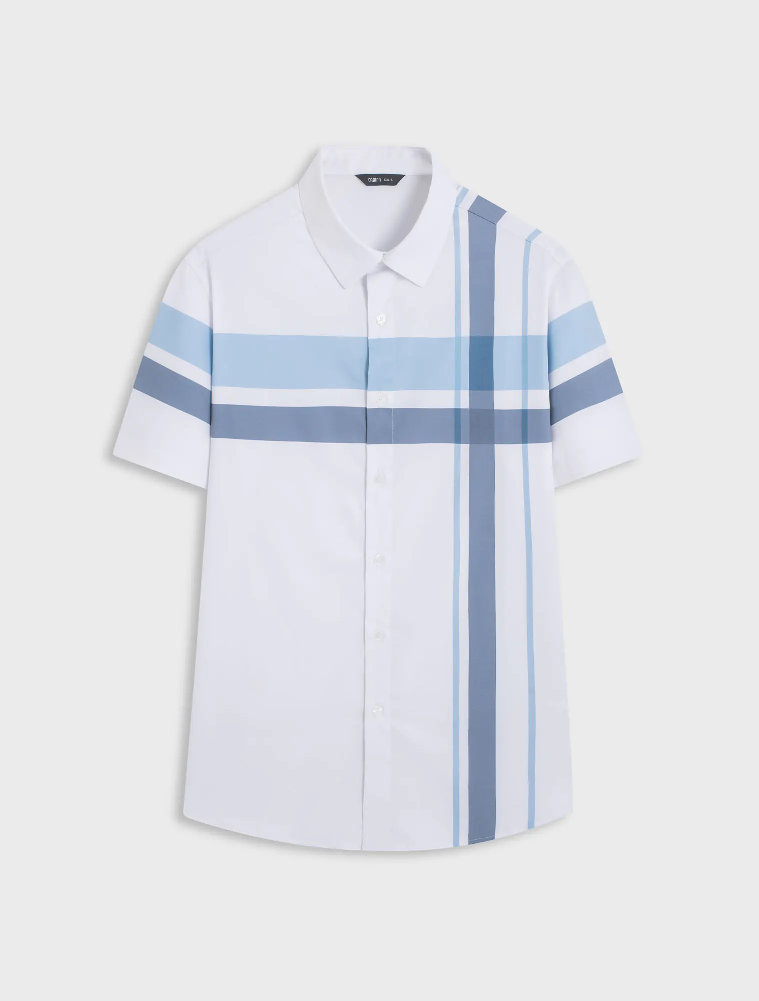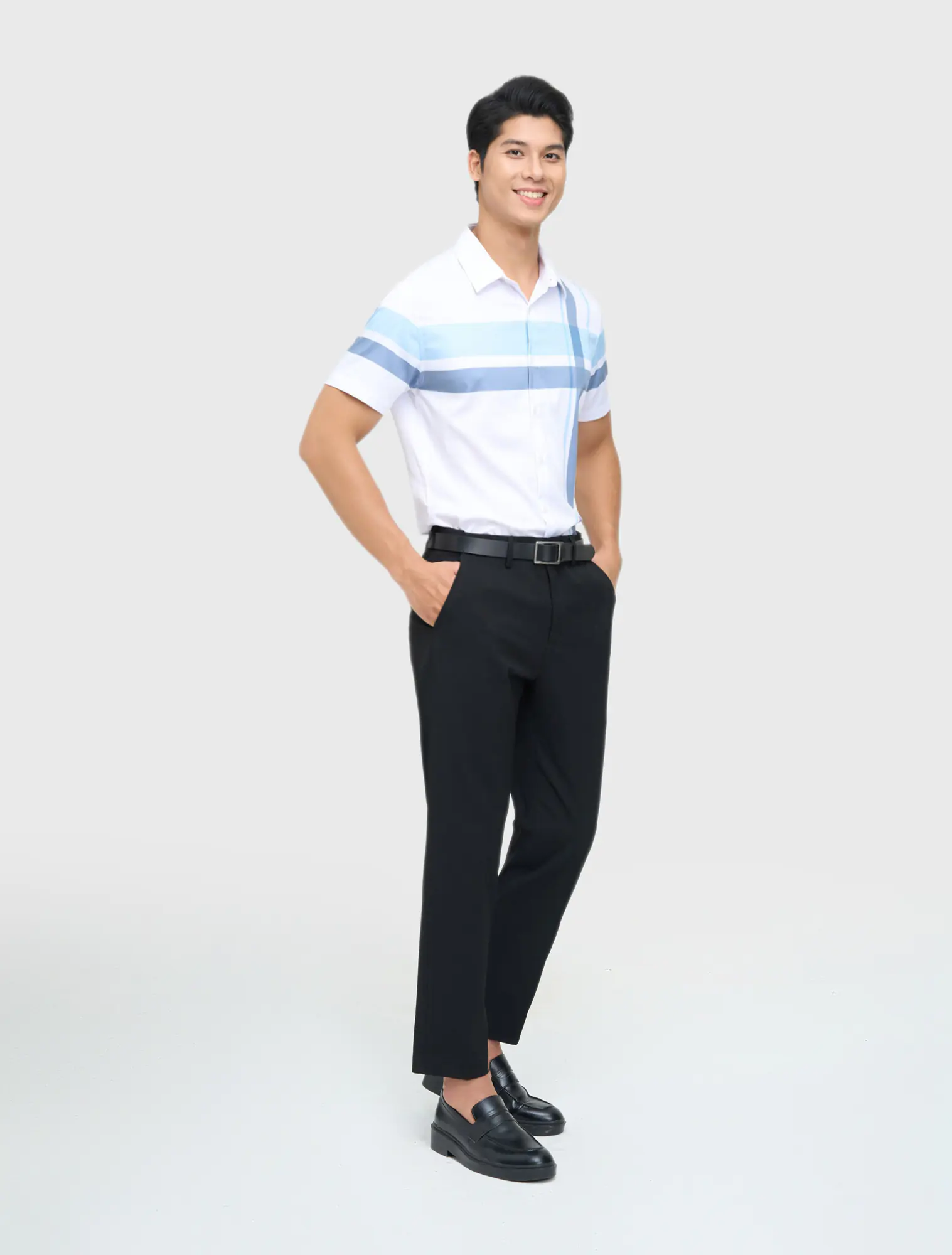Áo sơ mi nam phom regular, chất liệu polyester bamboo spandex giảm nhăn, nhàu, thoáng mát, mềm mại.