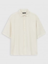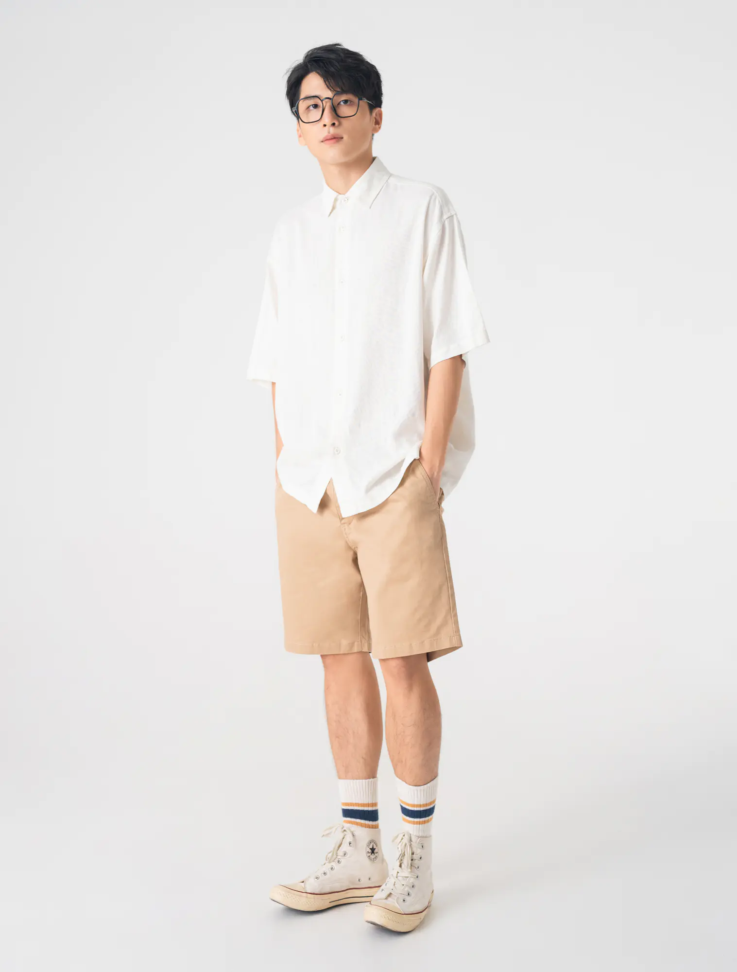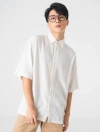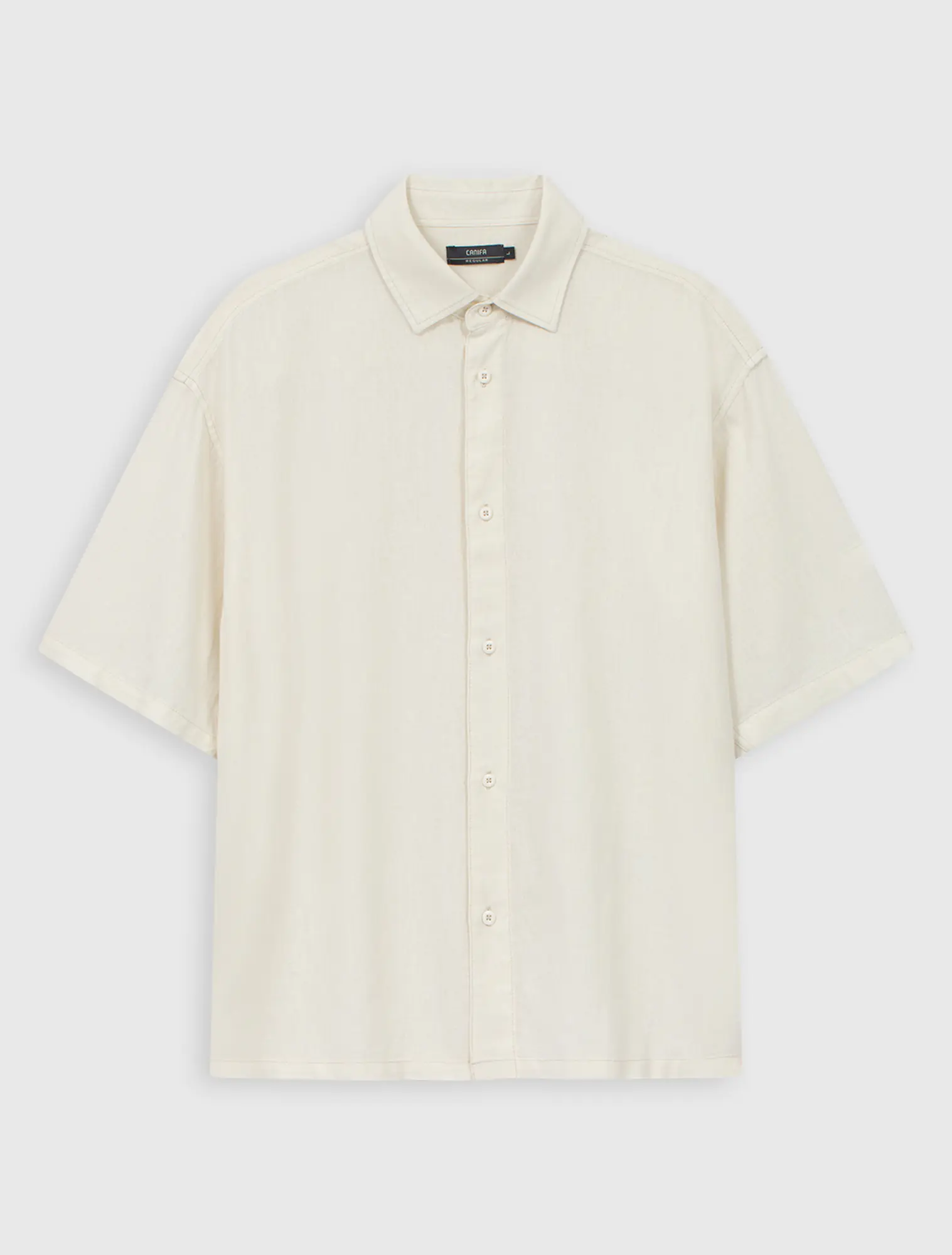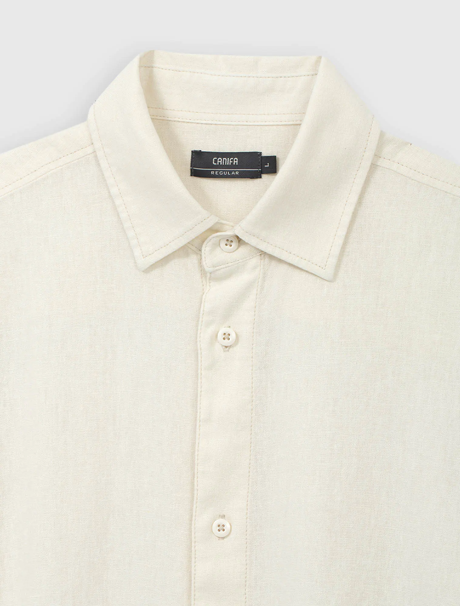 Áo sơ mi chất liệu linen pha, cổ đức tay cộc, phom regular.