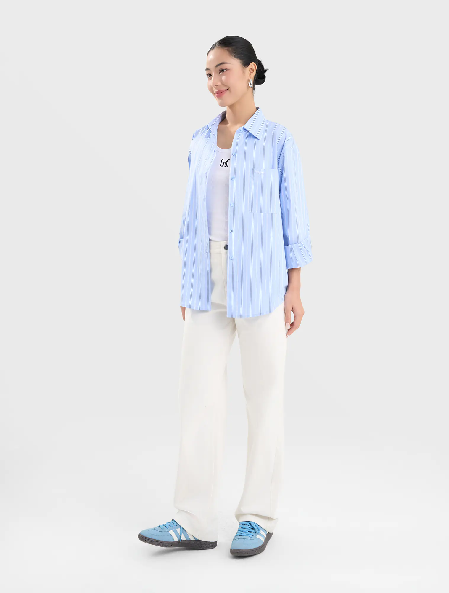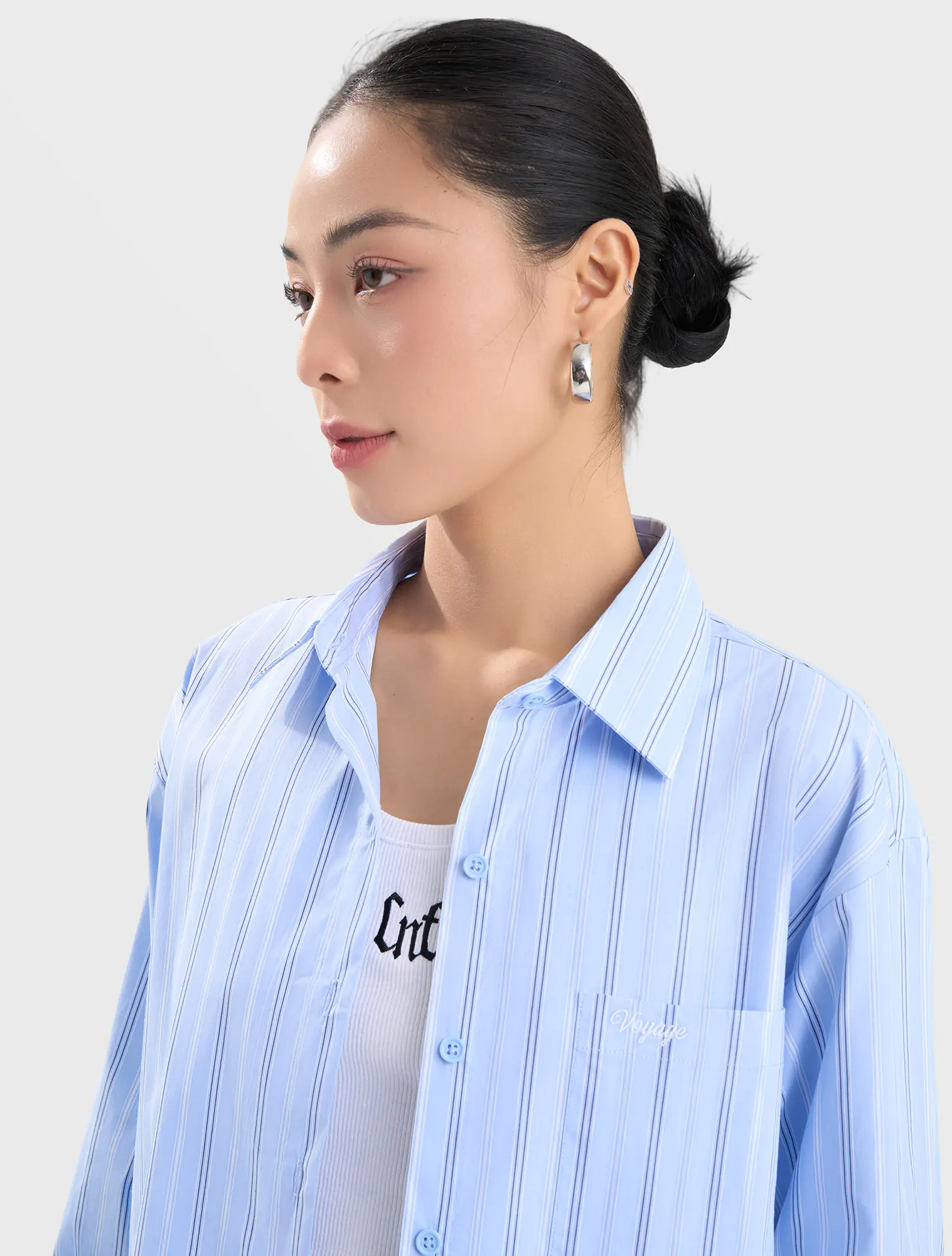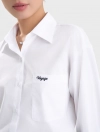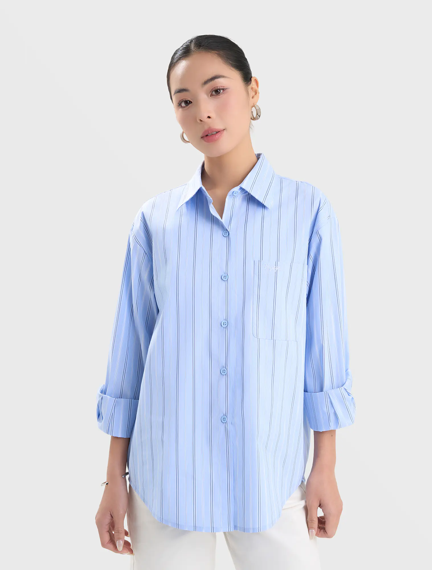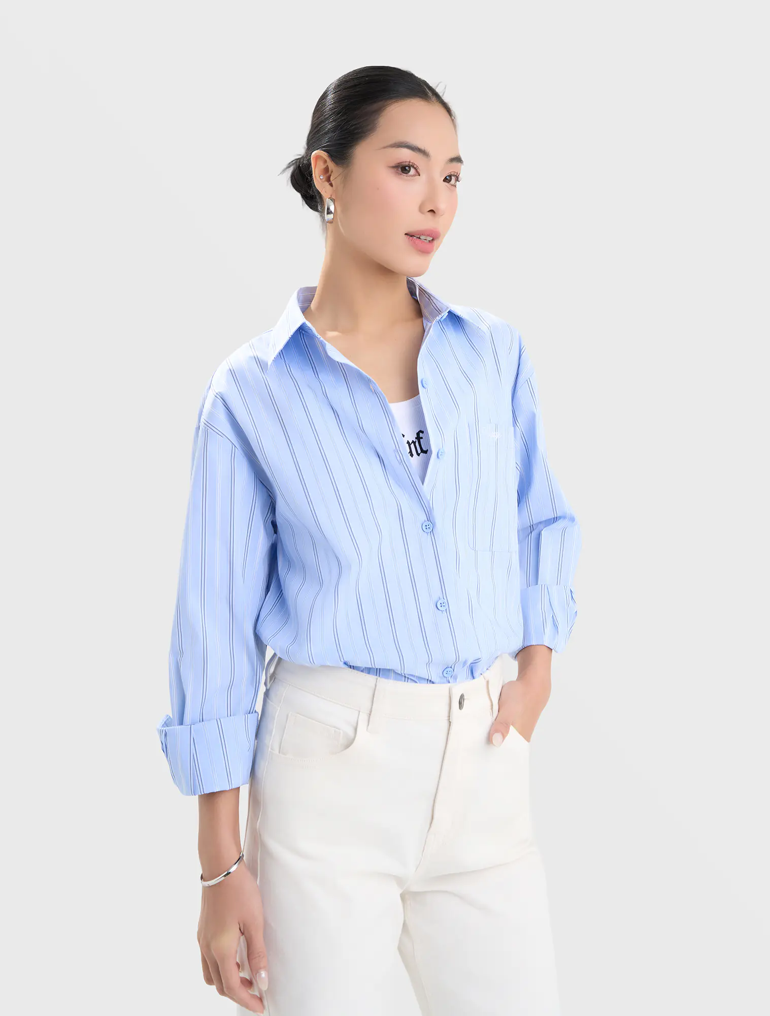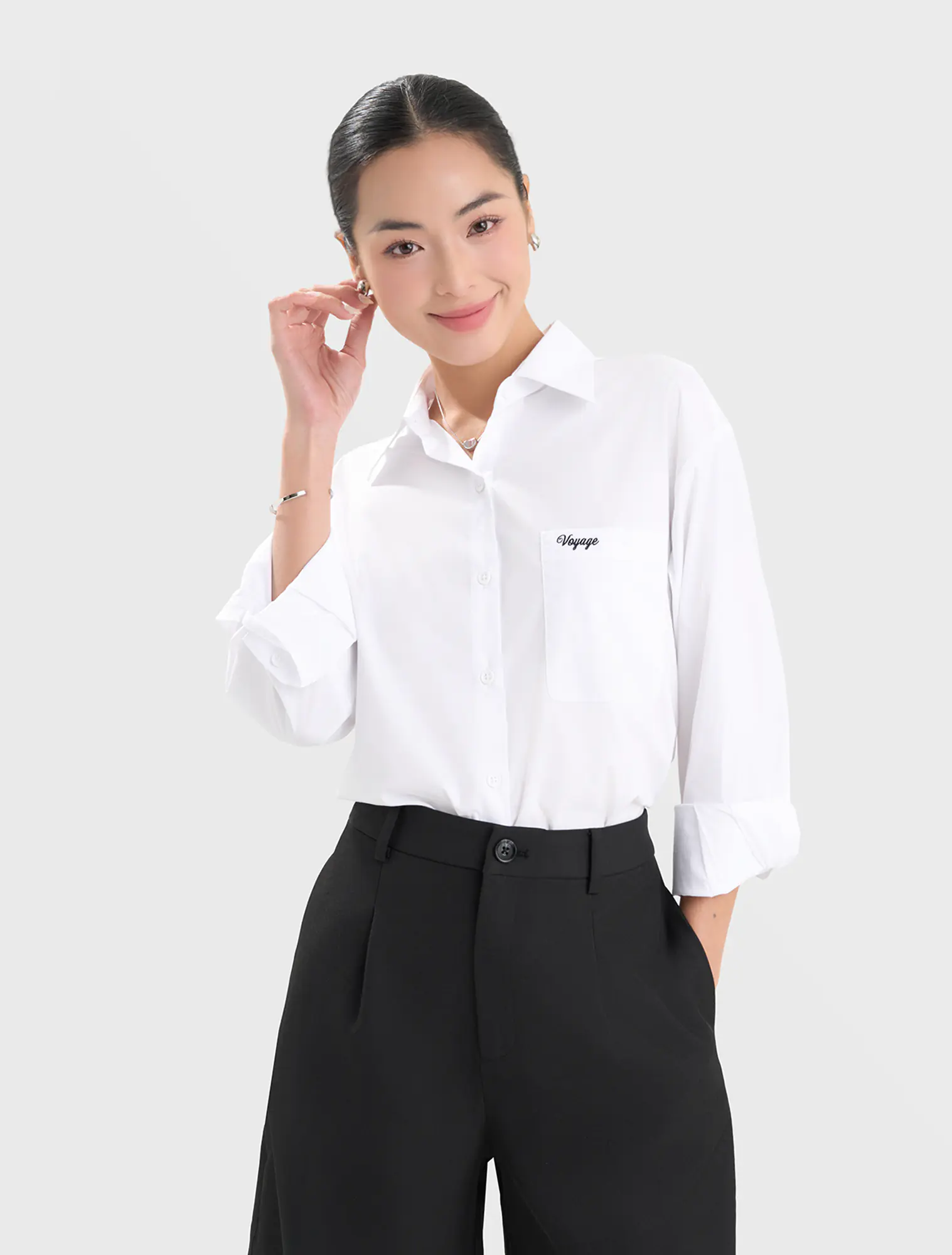 Áo sơ mi nữ dài tay, dáng suông vừa. Chi tiết túi ốp một bên thân, thêu chữ nhỏ. Kiểu dáng basic phù hợp nhiều hoàn cảnh và dễ dàng kết hợp. Áo có nền màu trơn, nền màu họa tiết mang lại nhiều lựa chọn hơn cho khách hàng.