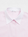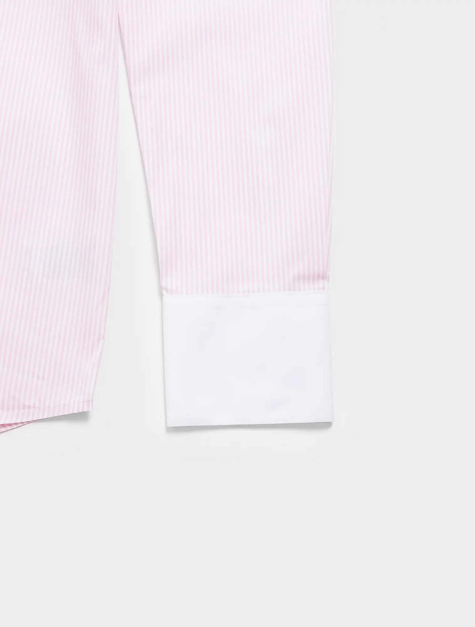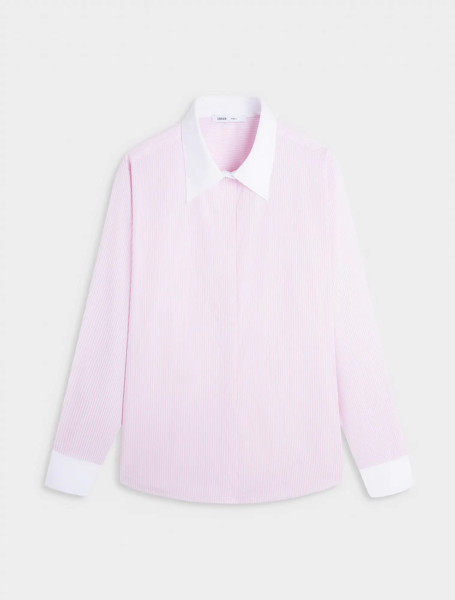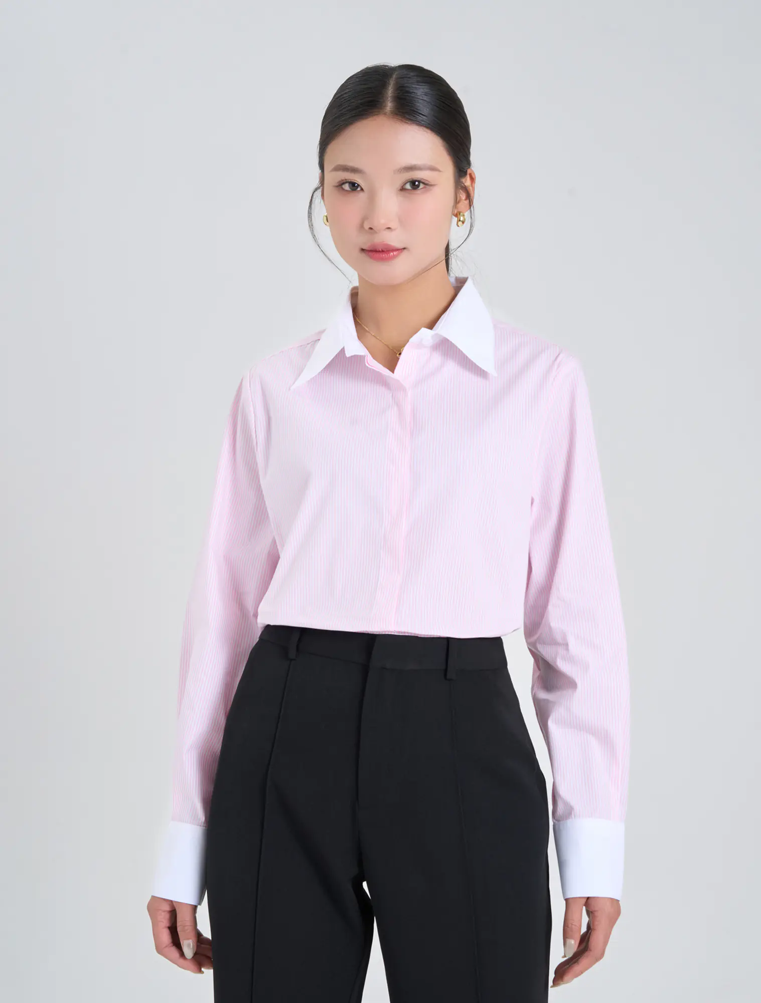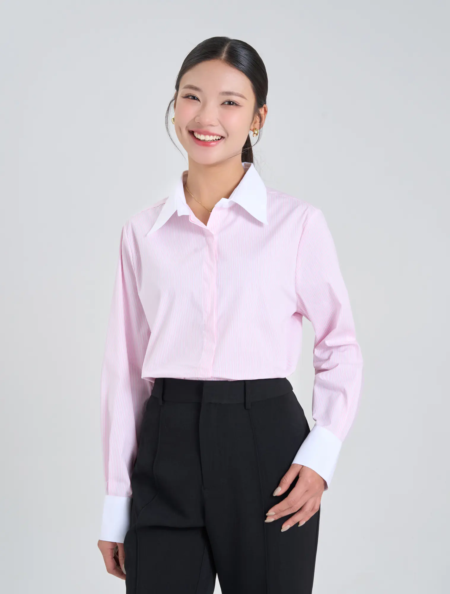 Áo sơ mi nữ kẻ phối màu dài tay, cổ đức, dáng suông. Chất liệu cotton pha mềm mịn, tạo cảm giác dễ chịu cho người mặc. Phù hợp môi trường văn phòng, công sở, dạo phố