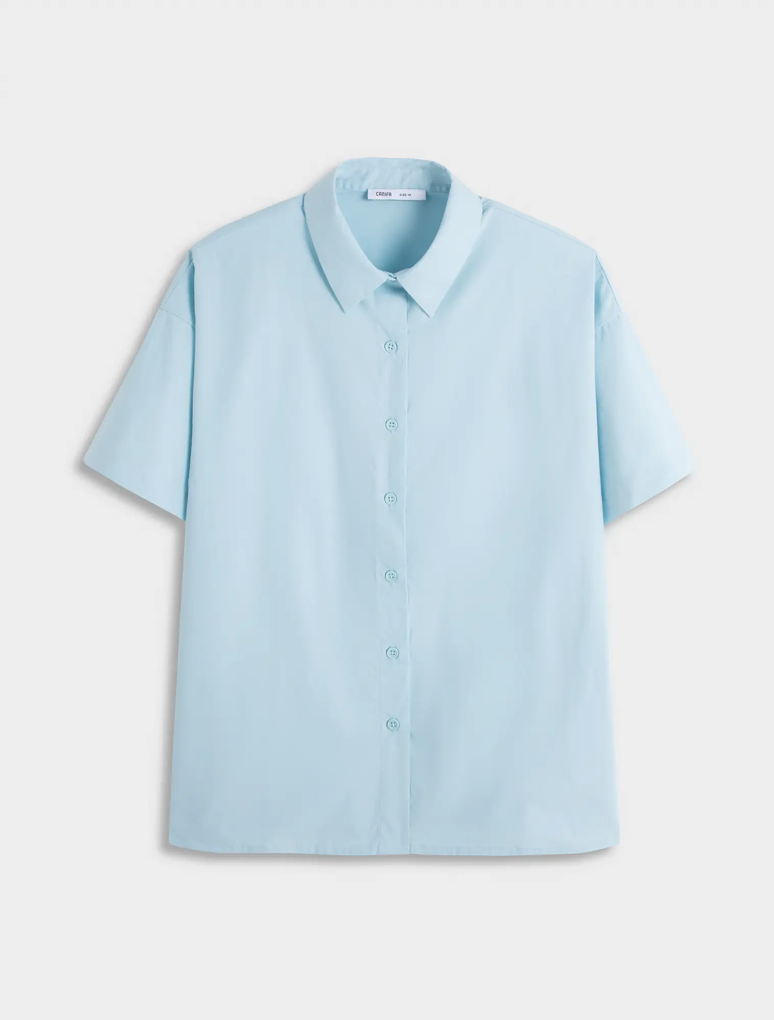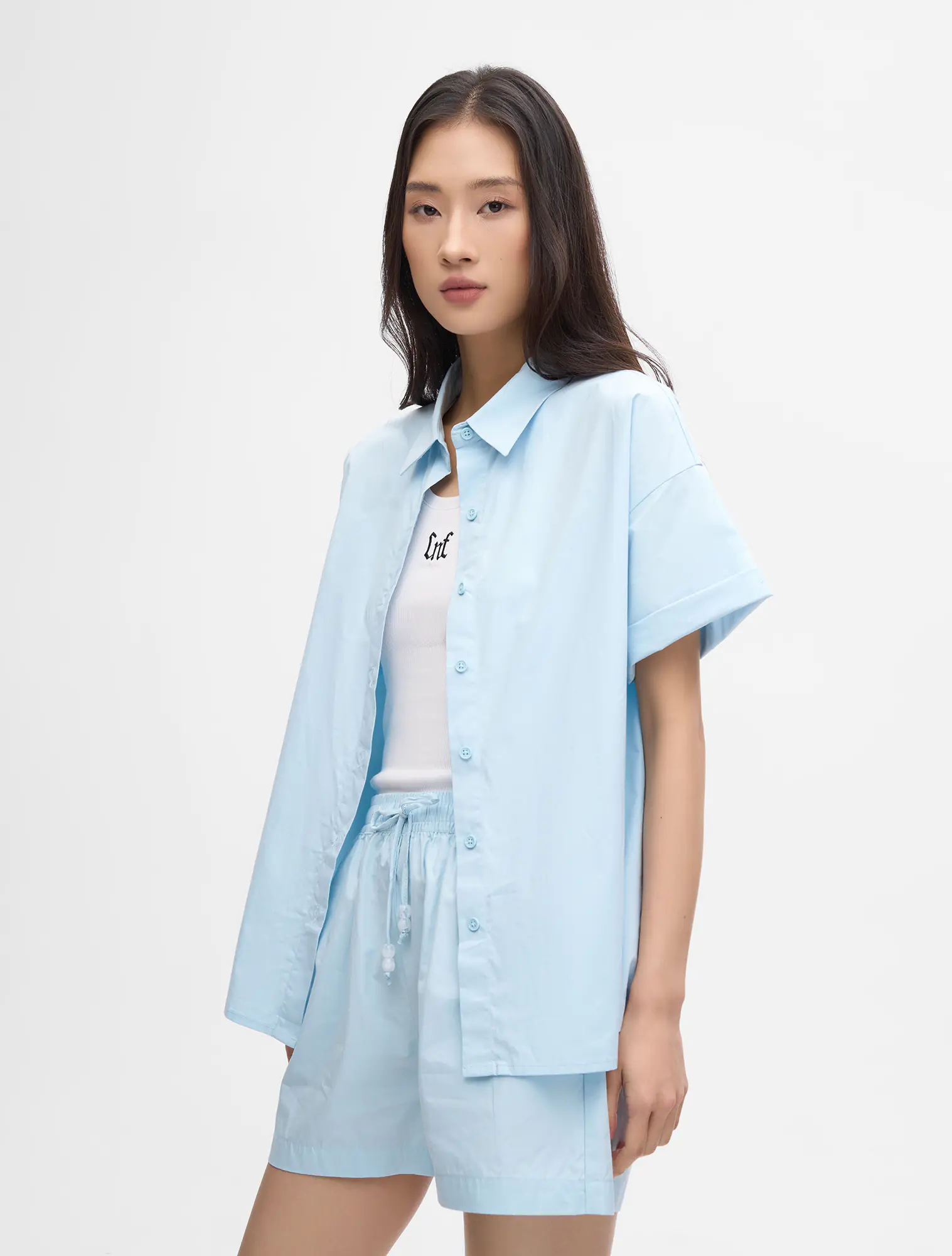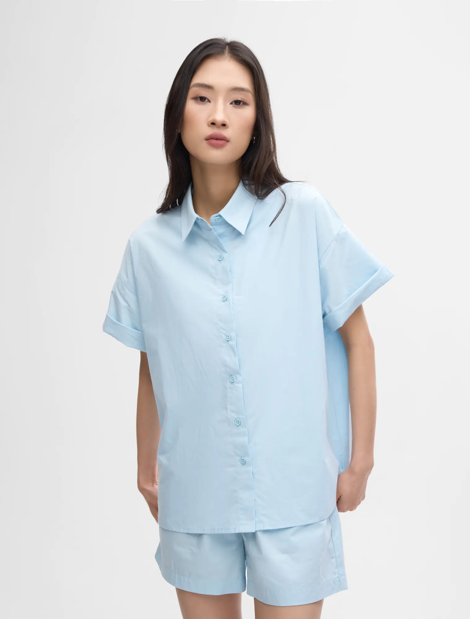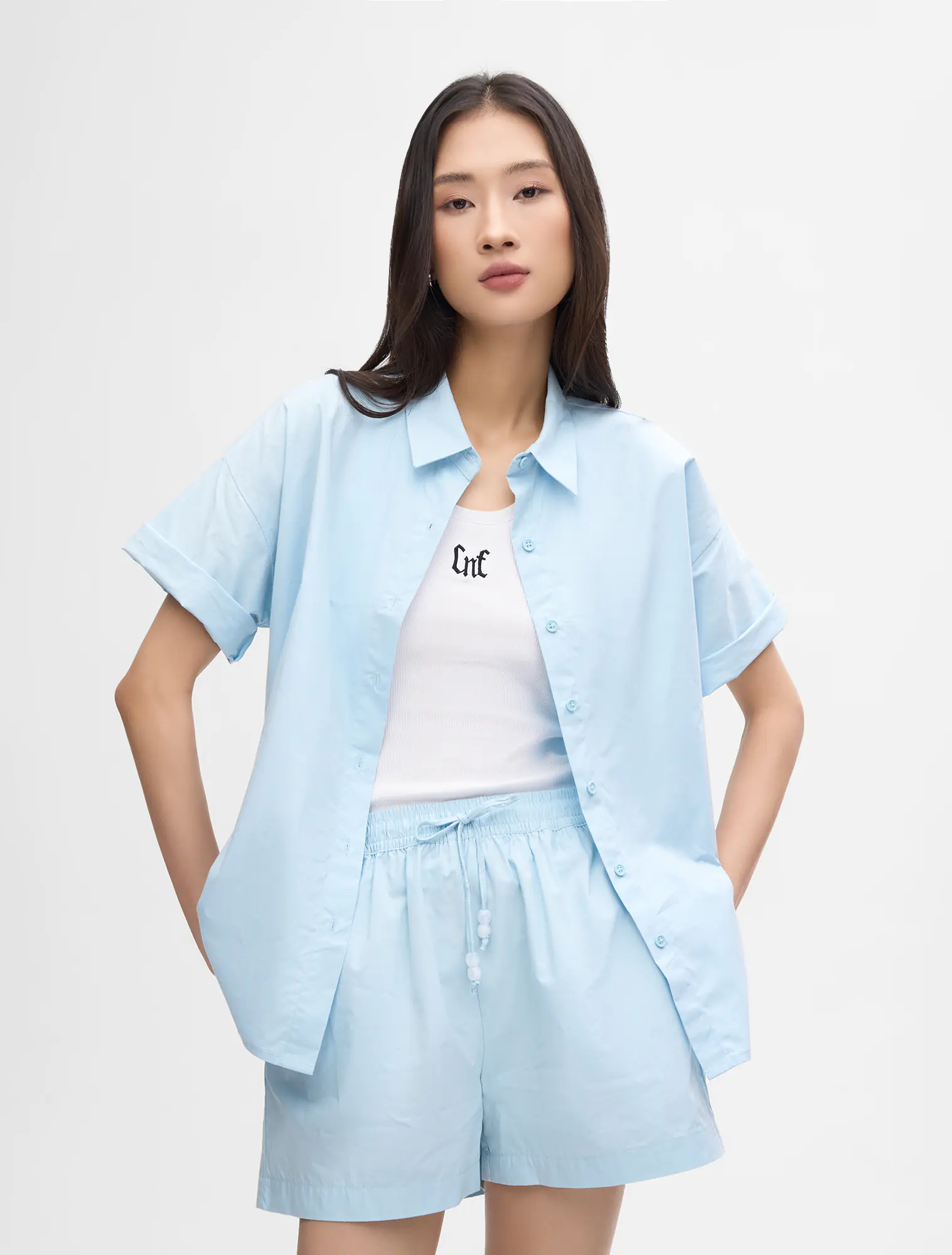 Áo sơ mi nữ ngắn tay, cổ đức, có hình in, phom suông rộng. Chất liệu mềm mại, phù hợp đi chơi, dạo phố.