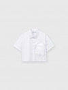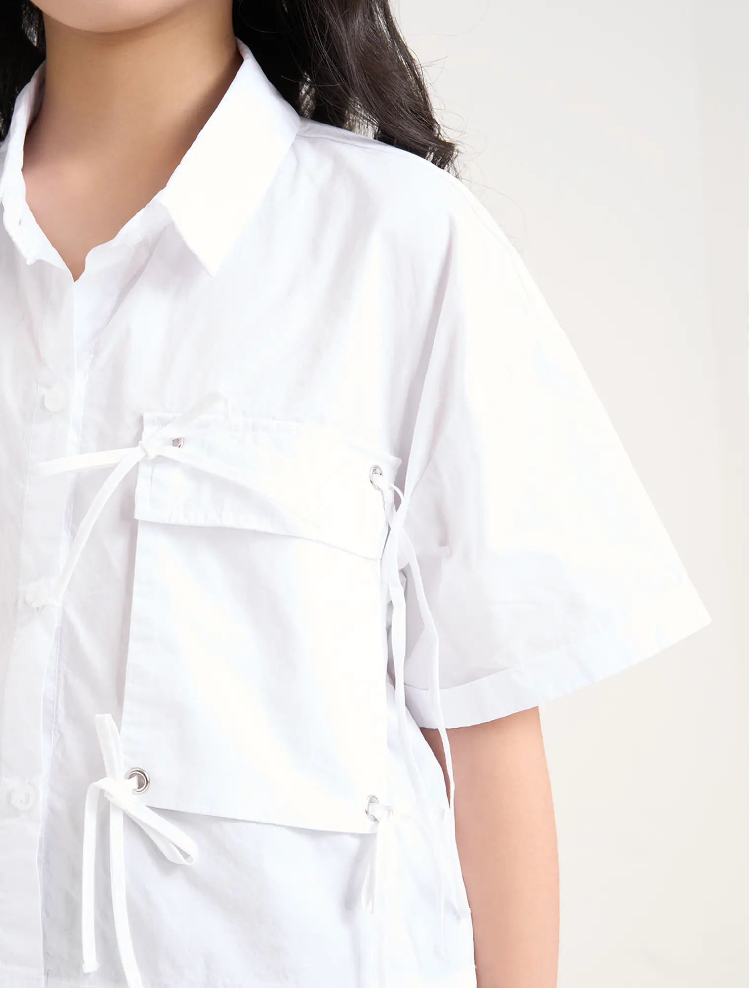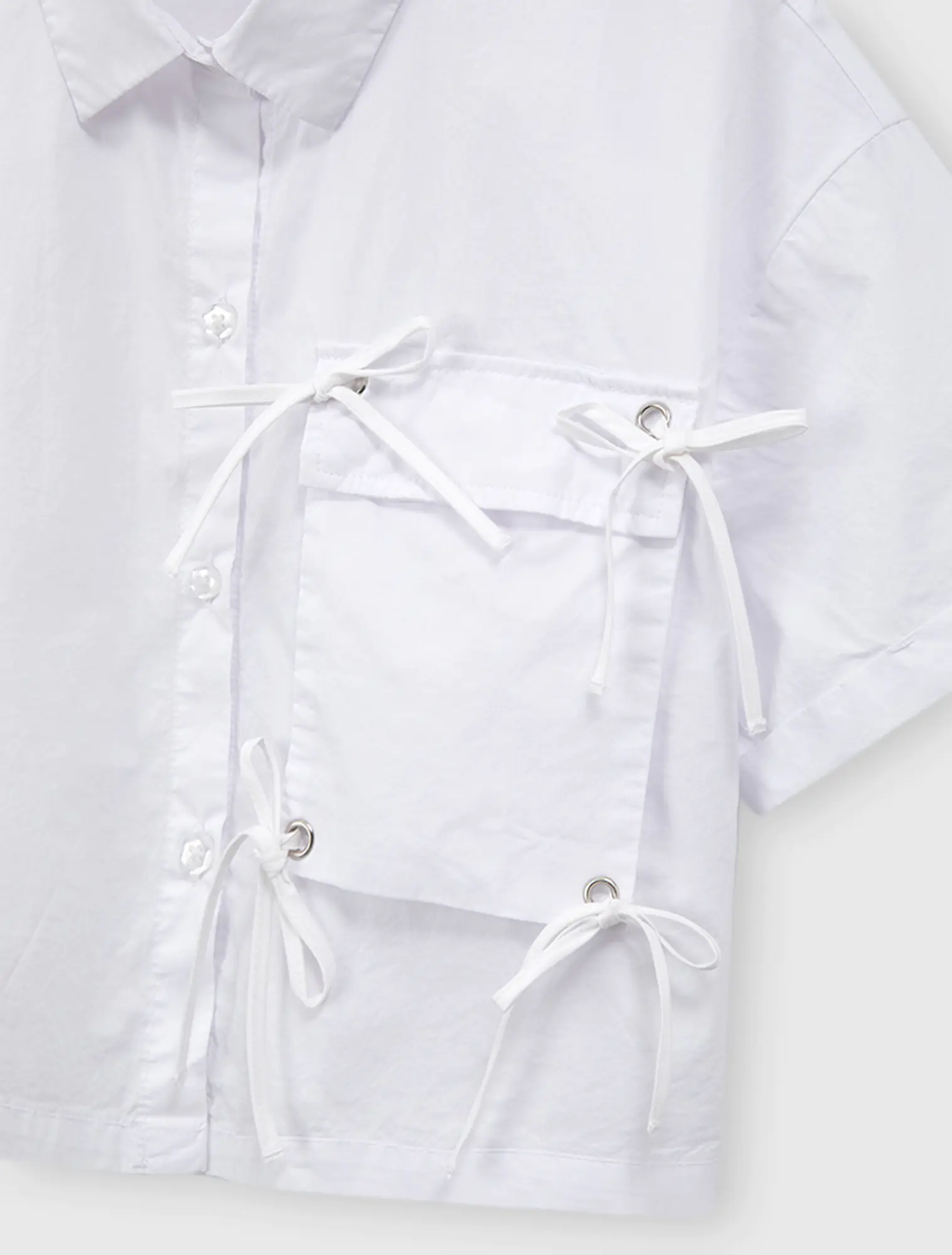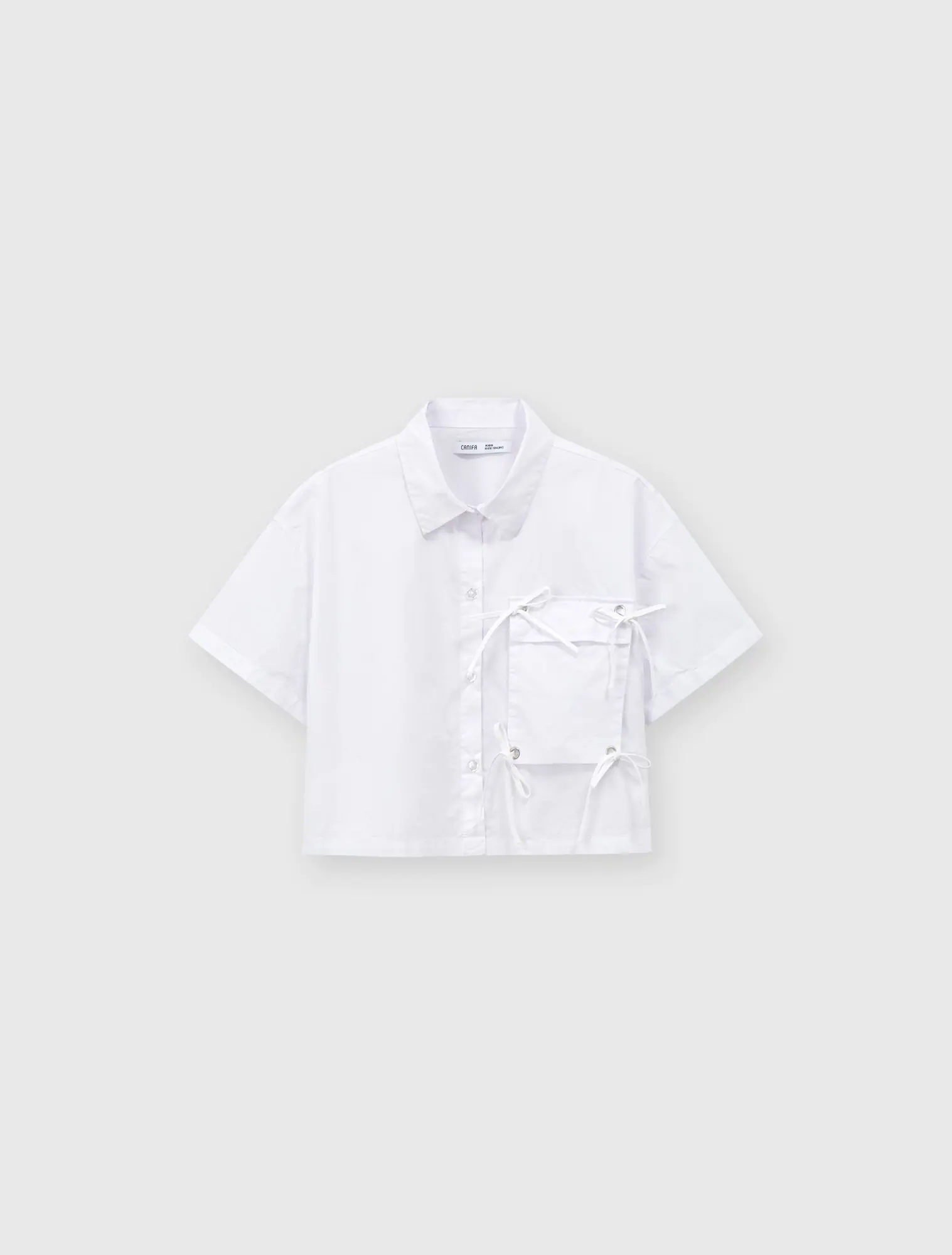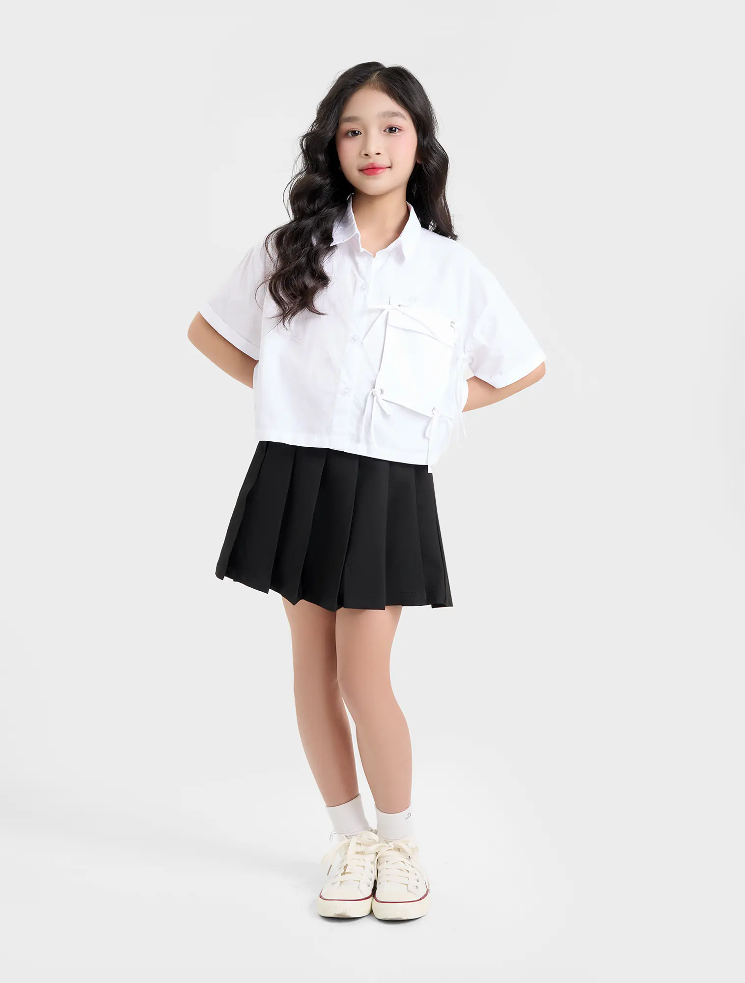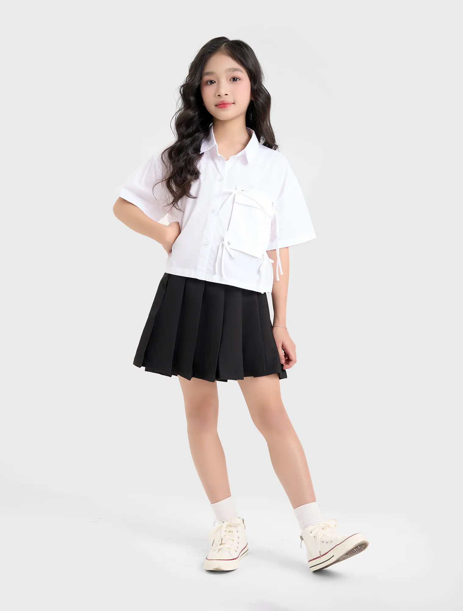 Áo sơ mi bé gái dáng ngắn, có chi tiết đính nơ thân áo. Chất liệu 100% cotton mang lại cảm giác thoải mái và dễ chịu cả ngày, phù hợp với nhiều hoàn cảnh sử dụng.