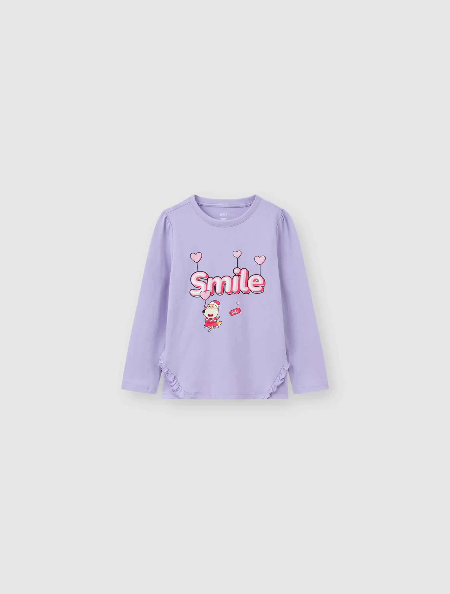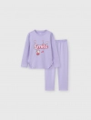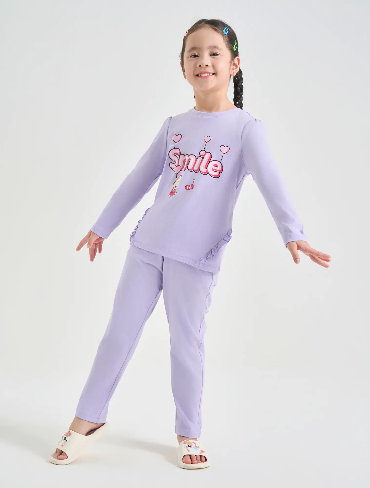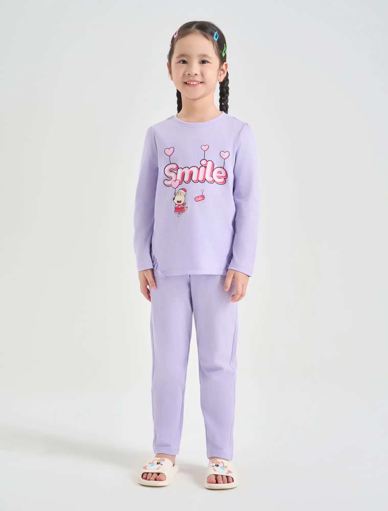 Bộ mặc nhà bé gái, chất liệu cotton mềm mại, hình in nhân vật Wolfoo đáng yêu ngộ nghĩnh, phom dáng cơ bản pha chút nhúm vai điệu đà cho bé gái, phù hợp mặc trong thời tiết giao mùa.