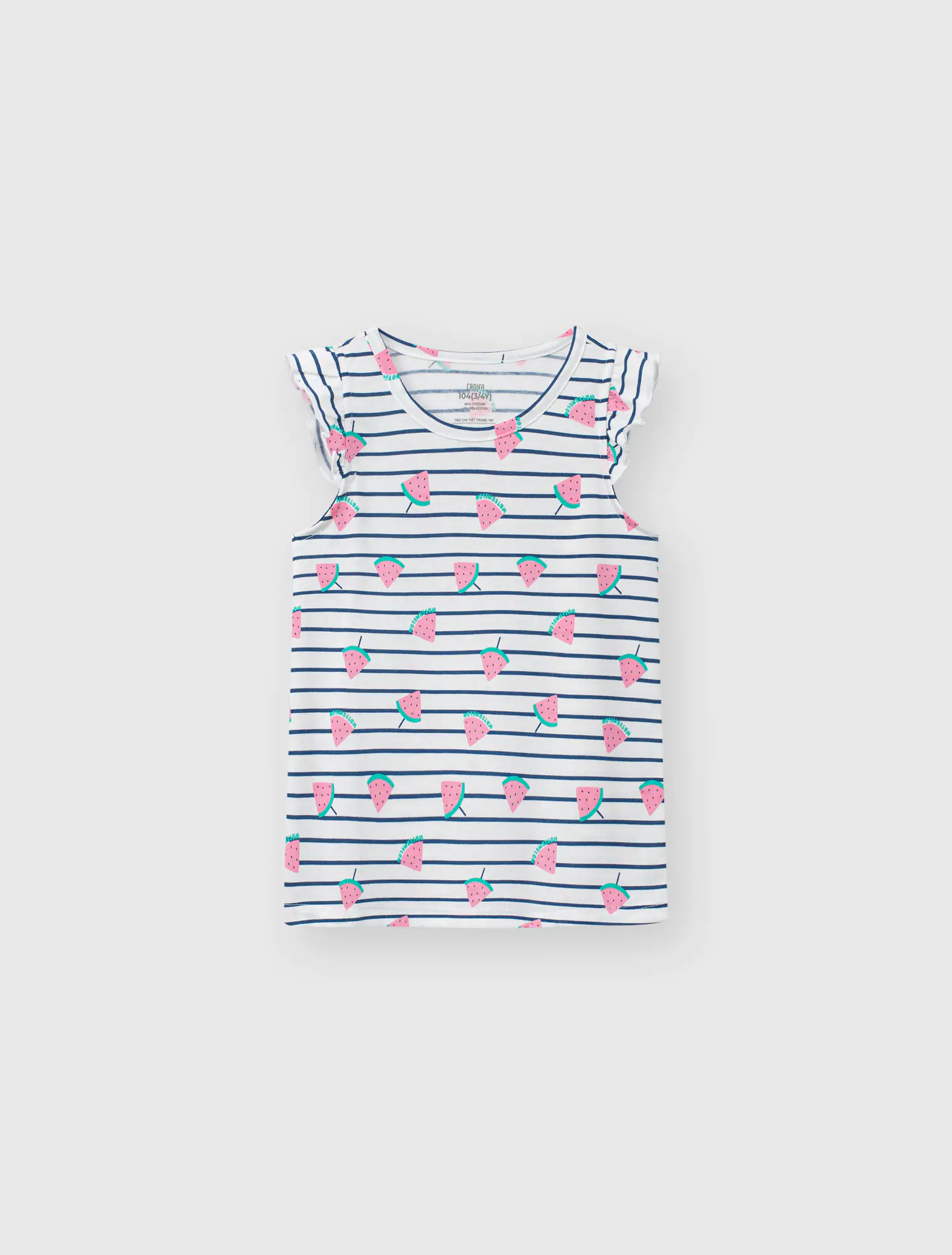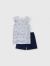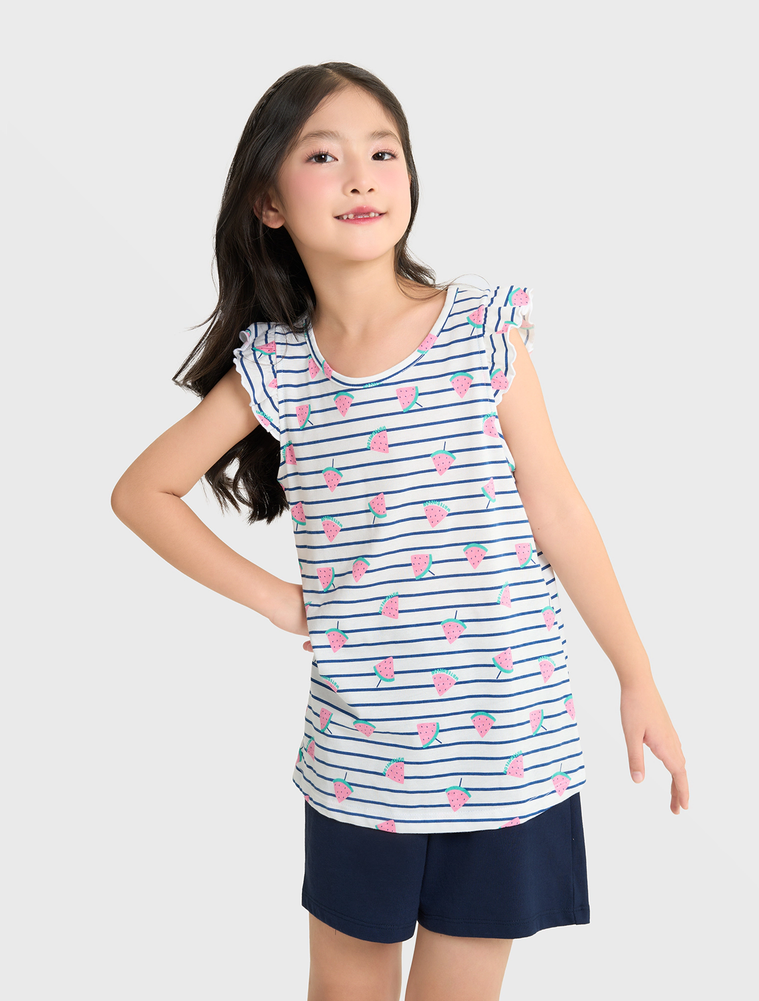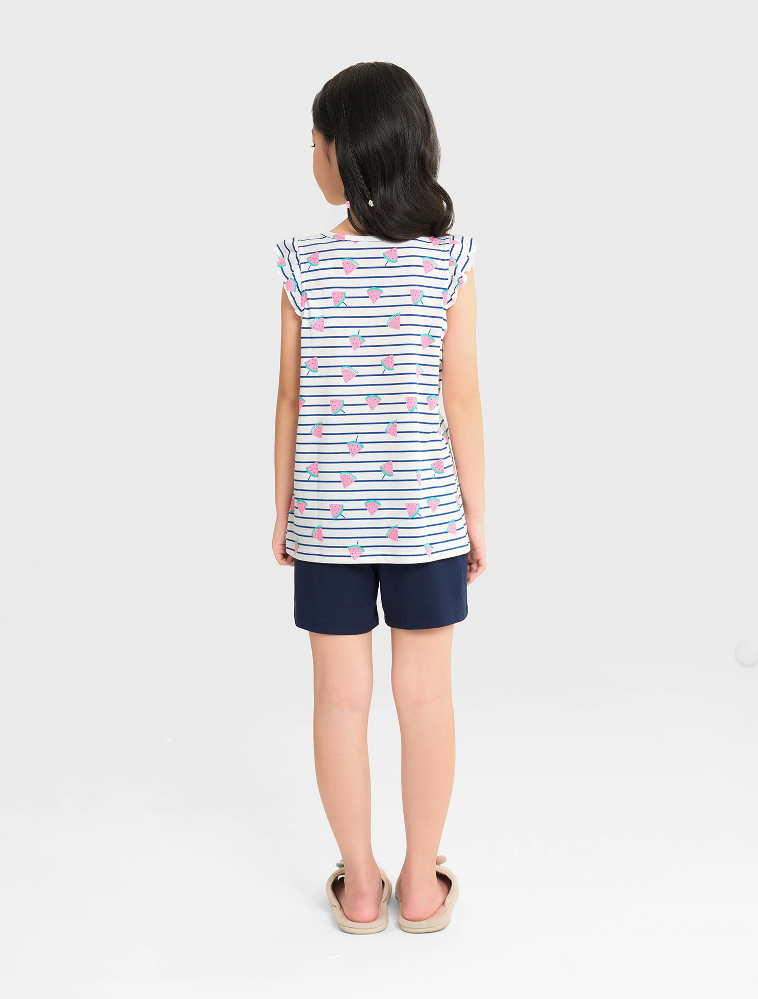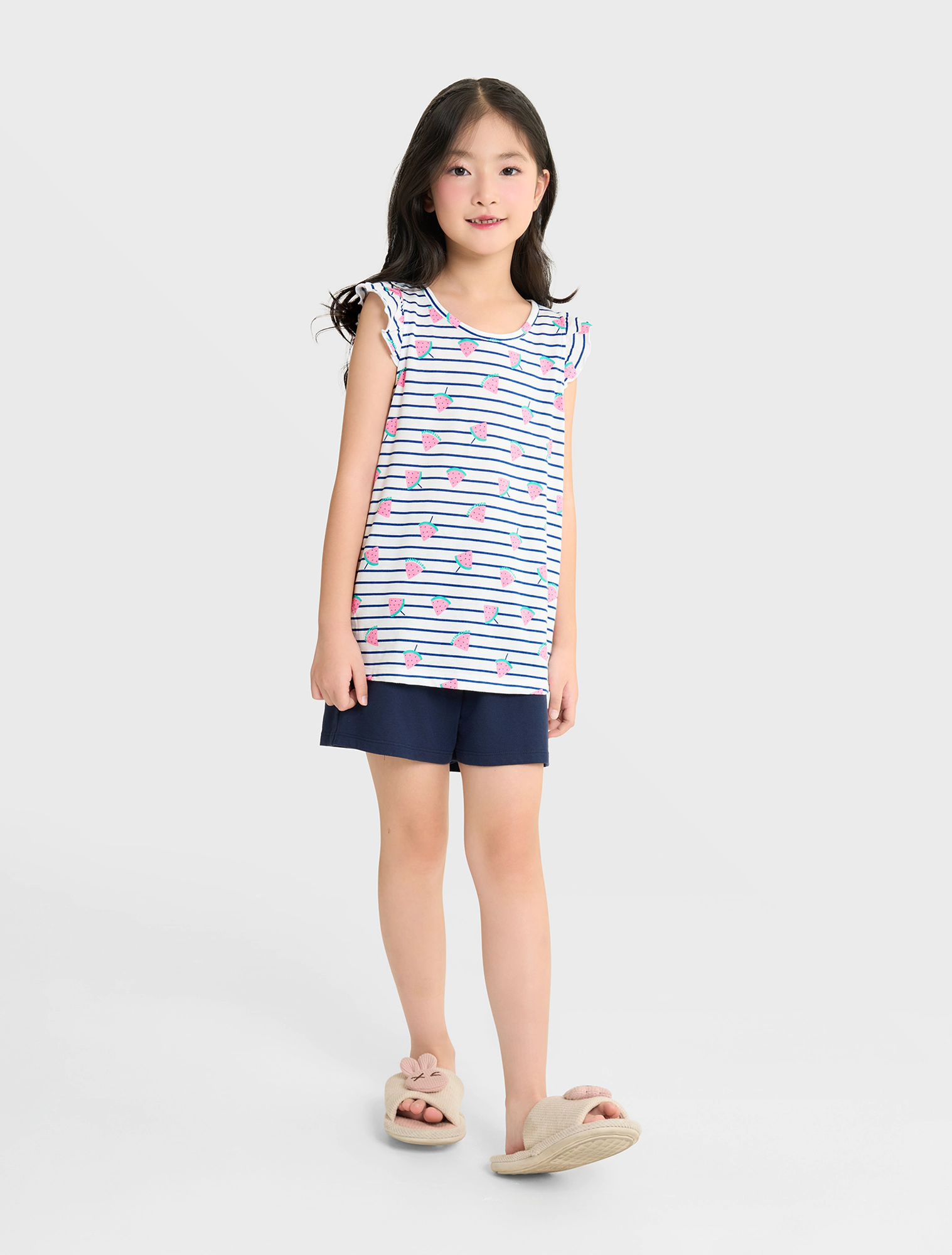 Bộ mặc nhà bé gái áo ba lỗ, quần soóc. Phom dáng cơ bản dễ mặc, vai có bèo tay nữ tính. Màu sắc và hình in dễ thương, tươi sáng.